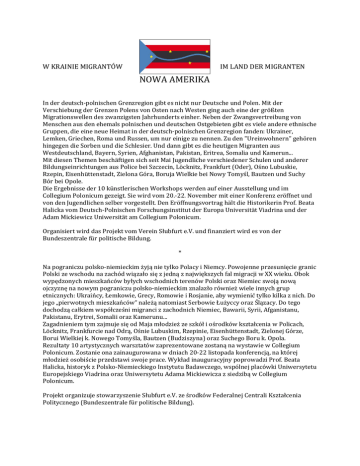 W KRAINIE MIGRANTÓW IM LAND DER MIGRANTEN NOWA AMERIKA In der deutsch-polnischen Grenzregion gibt es nicht nur Deutsche und Polen. Mit der Verschiebung der Grenzen Polens von Osten nach Westen ging auch eine der größten Migrationswellen des zwanzigsten Jahrhunderts einher. Neben der Zwangsvertreibung von Menschen aus den ehemals polnischen und deutschen Ostgebieten gibt es viele andere ethnische Gruppen, die eine neue Heimat in der deutsch-polnischen Grenzregion fanden: Ukrainer, Lemken, Griechen, Roma und Russen, um nur einige zu nennen. Zu den "Ureinwohnern" gehören hingegen die Sorben und die Schlesier. Und dann gibt es die heutigen Migranten aus Westdeutschland, Bayern, Syrien, Afghanistan, Pakistan, Eritrea, Somalia und Kamerun... Mit diesen Themen beschäftigen sich seit Mai Jugendliche verschiedener Schulen und anderer Bildungseinrichtungen aus Police bei Szczecin, Löcknitz, Frankfurt (Oder), Ośno Lubuskie, Rzepin, Eisenhüttenstadt, Zielona Góra, Boruja Wielkie bei Nowy Tomyśl, Bautzen und Suchy Bór bei Opole. Die Ergebnisse der 10 künstlerischen Workshops werden auf einer Ausstellung und im Collegium Polonicum gezeigt. Sie wird vom 20.-22. November mit einer Konferenz eröffnet und von den Jugendlichen selber vorgestellt. Den Eröffnungsvortrag hält die Historikerin Prof. Beata Halicka vom Deutsch-Polnischen Forschungsinstitut der Europa Universität Viadrina und der Adam Mickiewicz Uniwersität am Collegium Polonicum. Organisiert wird das Projekt vom Verein Słubfurt e.V. und finanziert wird es von der Bundeszentrale für politische Bildung. * Na pograniczu polsko-niemieckim żyją nie tylko Polacy i Niemcy. Powojenne przesunięcie granic Polski ze wschodu na zachód wiązało się z jedną z największych fal migracji w XX wieku. Obok wypędzonych mieszkańców byłych wschodnich terenów Polski oraz Niemiec swoją nową ojczyznę na nowym pograniczu polsko-niemieckim znalazło również wiele innych grup etnicznych: Ukraińcy, Łemkowie, Grecy, Romowie i Rosjanie, aby wymienić tylko kilka z nich. Do jego „pierwotnych mieszkańców” należą natomiast Serbowie Łużyccy oraz Ślązacy. Do tego dochodzą całkiem współcześni migranci z zachodnich Niemiec, Bawarii, Syrii, Afganistanu, Pakistanu, Erytrei, Somalii oraz Kamerunu... Zagadnieniem tym zajmuje się od Maja młodzież ze szkół i ośrodków kształcenia w Policach, Löcknitz, Frankfurcie nad Odrą, Ośnie Lubuskim, Rzepinie, Eisenhüttenstadt, Zielonej Górze, Borui Wielkiej k. Nowego Tomyśla, Bautzen (Budziszyna) oraz Suchego Boru k. Opola. Rezultaty 10 artystycznych warsztatów zaprezentowane zostaną na wystawie w Collegium Polonicum. Zostanie ona zainaugurowana w dniach 20-22 listopada konferencją, na której młodzież osobiście przedstawi swoje prace. Wykład inauguracyjny poprowadzi Prof. Beata Halicka, historyk z Polsko-Niemieckiego Instytutu Badawczego, wspólnej placówki Uniwersytetu Europejskiego Viadrina oraz Uniwersytetu Adama Mickiewicza z siedzibą w Collegium Polonicum. Projekt organizuje stowarzyszenie Słubfurt e.V. ze środków Federalnej Centrali Kształcenia Politycznego (Bundeszentrale für politische Bildung). Konferenzja, 20.-22.11.2011, Collegium Polonicum, Słubice piątek | freitag, 20.11. 19:00 przywitanie | begrüßung (Krzysztof Wojciechowski/Collegium Polonicum, Michael Kurzwelly/Slubfurt e.V.) wykład inauguracyjny | eröffnungsvortrag (Prof. Beata Halicka, Polsko-Niemiecki Instytut Badawczy UAM Poznań i EUV Frankfurt (Oder) z siedzibą w Collegium Polonicum | Deutsch-Polnisches Forschungsinstitut UAM Poznań und EUV Frankfurt (Oder) mit Sitz im Collegium Polonicum) "Gestern wir, heute die anderen? Die Erfahrung der erzwungenen Migration im deutschpolnischen Grenzraum | Wczoraj my, dziś oni? Doświadczenie przymusowej migracji na polsko-niemieckim pograniczu" otwarcie wystawy | ausstellungseröffnung 20:30 büffet | bufet sobota | samstag, 21.11. 09:30 - 13:00 14:00 - 16:00 prezentacje | präsentationen Jugendliche verschiedener Schulen und anderer Bildungseinrichtungen aus | młodzież ze szkół i ośrodków kształcenia w : Police, Löcknitz, Frankfurt (Oder), Ośno Lubuskie, Rzepin, Eisenhüttenstadt, Zielona Góra, Boruja Wielkie, Bautzen, Suchy Bór. 16:30 - 18:00 dyskusja panelowa | podiumsdiskussion na podstawie pytań i tematów zaproponowanych przez młodzież | auf der basis von fragen und themen, die von den jugendlichen selbst vorgeschlagen werden. niedziela | sonntag, 22.11. nowa amerika kongres zapraszamy wszystkich chętnych | wir laden alle interessierten ein 09:30 - 11:00 nowa amerika kongres sieć nowa amerika się przedstawia uczestnikom konferencji | das netzwerk nowa amerika stellt sich den teilnehmern der konferenz vor 11:30 - 16:00 nowa amerika kongres dyskusje i plany | diskussionen und pläne Schulen, Bildungseinrichtungen, Workshopleiter: Greccy | Griechen Żydzi | Juden Sybiracy | Sibirienverschleppte Komunikacja krajobrazu | Landschaftskommunikation Wygnańcy dzisiaj | Vertriebene heute Kresowiacy (Polskie wygnańcy ) | Vertriebene Ostpolen dawne pogranicze | ehemalige Grenzregion Niemieckie wygnańcy | Deutsche Vertriebene Badania nad tożsamością na Śląsku Opolskim| Untersuchungen zur Identität in Schlesien um Opole Serbowie | Sorben Zespół Szkół im. Ignacego Łukasiewicza w Policach Młodzież z | Jugendliche aus : Gartz (Schwedt) Zespół Szkół Ogólnokształcący w Rzepinie Zespół Szkół Publicznych w Ośno Lubuskim Jugendklub Mikado in Frankfurt (Oder) Andrzej Łazowski Andrzej Łazowski Wioletta Nowak Anna Aniśko Thomas Spicker Społeczne Gimnazjum i Liceum Ogólnokształcące "Szkoła Myślenia Twórczego", Zielona Góra Joanna Hanć Gimnazjum w Borui Kościelnej (Nowy Tomyśl) Anna Billert Albert-Schweitzer-Gymnasium Eisenhüttenstadt Instytut Edukacji przez Sztukę, Suchy Bór (Opole) Freies Projekt in Kooperation mit der Integrationsbeauftragten der Stadt und dem Sorbischen Museum, Bautzen Michael Kurzwelly, 