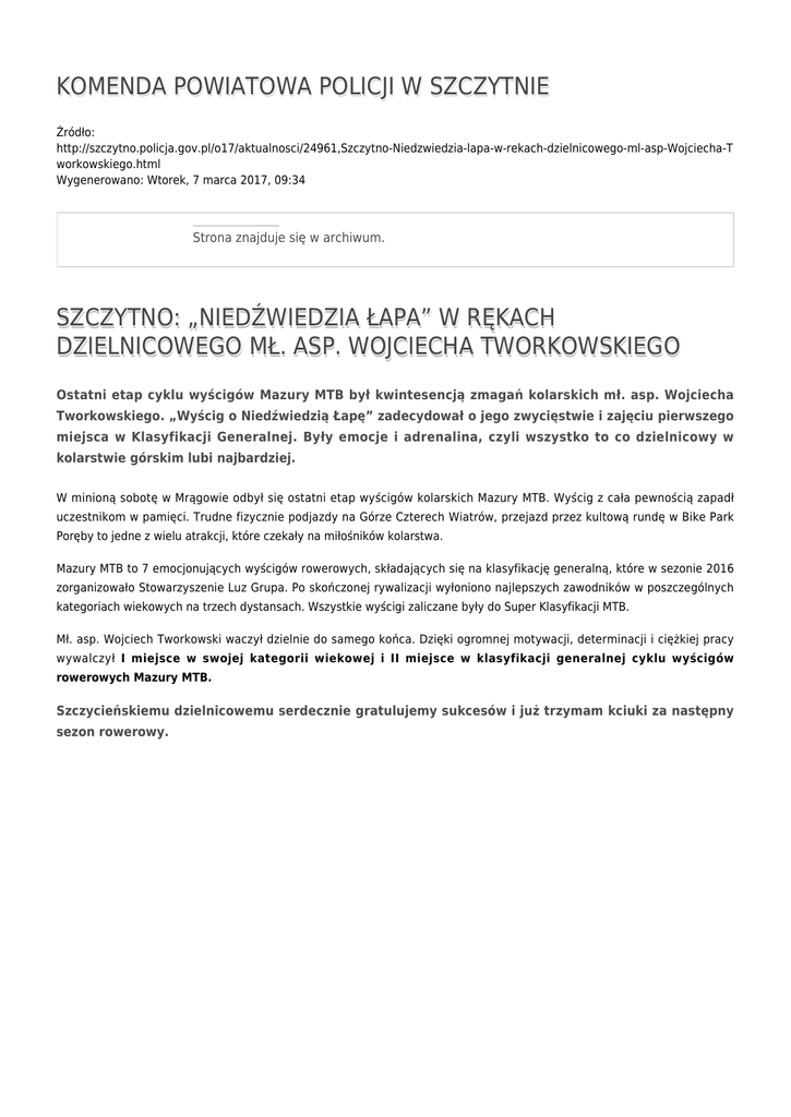 KOMENDA POWIATOWA POLICJI W SZCZYTNIE Źródło: http://szczytno.policja.gov.pl/o17/aktualnosci/24961,Szczytno-Niedzwiedzia-lapa-w-rekach-dzielnicowego-ml-asp-Wojciecha-T workowskiego.html Wygenerowano: Wtorek, 7 marca 2017, 09:34 Strona znajduje się w archiwum. SZCZYTNO: „NIEDŹWIEDZIA ŁAPA” W RĘKACH DZIELNICOWEGO MŁ. ASP. WOJCIECHA TWORKOWSKIEGO Ostatni etap cyklu wyścigów Mazury MTB był kwintesencją zmagań kolarskich mł. asp. Wojciecha Tworkowskiego. „Wyścig o Niedźwiedzią Łapę” zadecydował o jego zwycięstwie i zajęciu pierwszego miejsca w Klasyfikacji Generalnej. Były emocje i adrenalina, czyli wszystko to co dzielnicowy w kolarstwie górskim lubi najbardziej. W minioną sobotę w Mrągowie odbył się ostatni etap wyścigów kolarskich Mazury MTB. Wyścig z cała pewnością zapadł uczestnikom w pamięci. Trudne fizycznie podjazdy na Górze Czterech Wiatrów, przejazd przez kultową rundę w Bike Park Poręby to jedne z wielu atrakcji, które czekały na miłośników kolarstwa. Mazury MTB to 7 emocjonujących wyścigów rowerowych, składających się na klasyfikację generalną, które w sezonie 2016 zorganizowało Stowarzyszenie Luz Grupa. Po skończonej rywalizacji wyłoniono najlepszych zawodników w poszczególnych kategoriach wiekowych na trzech dystansach. Wszystkie wyścigi zaliczane były do Super Klasyfikacji MTB. Mł. asp. Wojciech Tworkowski waczył dzielnie do samego końca. Dzięki ogromnej motywacji, determinacji i ciężkiej pracy wywalczył I miejsce w swojej kategorii wiekowej i II miejsce w klasyfikacji generalnej cyklu wyścigów rowerowych Mazury MTB. Szczycieńskiemu dzielnicowemu serdecznie gratulujemy sukcesów i już trzymam kciuki za następny sezon rowerowy. Ocena: 5/5 (1) Tweetnij