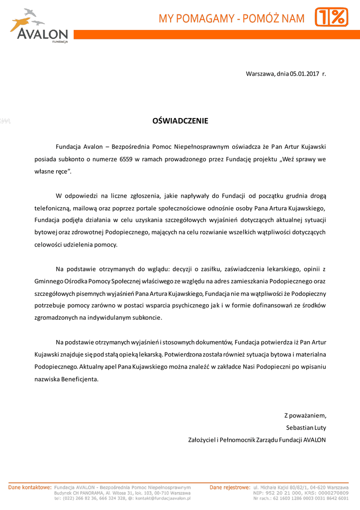 Warszawa, dnia 05.01.2017 r. OŚWIADCZENIE Fundacja Avalon – Bezpośrednia Pomoc Niepełnosprawnym oświadcza że Pan Artur Kujawski posiada subkonto o numerze 6559 w ramach prowadzonego przez Fundację projektu „Weź sprawy we własne ręce”. W odpowiedzi na liczne zgłoszenia, jakie napływały do Fundacji od początku grudnia drogą telefoniczną, mailową oraz poprzez portale społecznościowe odnośnie osoby Pana Artura Kujawskiego, Fundacja podjęła działania w celu uzyskania szczegółowych wyjaśnień dotyczących aktualnej sytuacji bytowej oraz zdrowotnej Podopiecznego, mających na celu rozwianie wszelkich wątpliwości dotyczących celowości udzielenia pomocy. Na podstawie otrzymanych do wglądu: decyzji o zasiłku, zaświadczenia lekarskiego, opinii z Gminnego Ośrodka Pomocy Społecznej właściwego ze względu na adres zamieszkania Podopiecznego oraz szczegółowych pisemnych wyjaśnień Pana Artura Kujawskiego, Fundacja nie ma wątpliwości że Podopieczny potrzebuje pomocy zarówno w postaci wsparcia psychicznego jak i w formie dofinansowań ze środków zgromadzonych na indywidulanym subkoncie. Na podstawie otrzymanych wyjaśnień i stosownych dokumentów, Fundacja potwierdza iż Pan Artur Kujawski znajduje się pod stałą opieką lekarską. Potwierdzona została również sytuacja bytowa i materialna Podopiecznego. Aktualny apel Pana Kujawskiego można znaleźć w zakładce Nasi Podopieczni po wpisaniu nazwiska Beneficjenta. Z poważaniem, Sebastian Luty Założyciel i Pełnomocnik Zarządu Fundacji AVALON