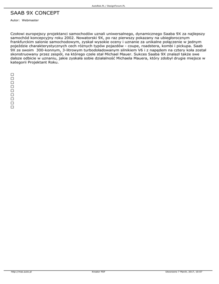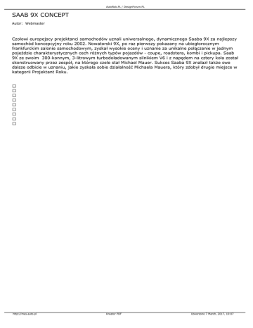 AutoRok.PL / DesignForum.PL SAAB 9X CONCEPT Autor: Webmaster Czołowi europejscy projektanci samochodów uznali uniwersalnego, dynamicznego Saaba 9X za najlepszy samochód koncepcyjny roku 2002. Nowatorski 9X, po raz pierwszy pokazany na ubiegłorocznym frankfurckim salonie samochodowym, zyskał wysokie oceny i uznanie za unikalne połączenie w jednym pojeździe charakterystycznych cech różnych typów pojazdów - coupe, roadstera, kombi i pickupa. Saab 9X ze swoim 300-konnym, 3-litrowym turbodoładowanym silnikiem V6 i z napędem na cztery koła został skonstruowany przez zespół, na którego czele stał Michael Mauer. Sukces Saaba 9X znalazł także swe dalsze odbicie w uznaniu, jakie zyskała sobie działalność Michaela Mauera, który zdobył drugie miejsce w kategorii Projektant Roku. http://mas.auto.pl Kreator PDF Utworzono 7 March, 2017, 10:07