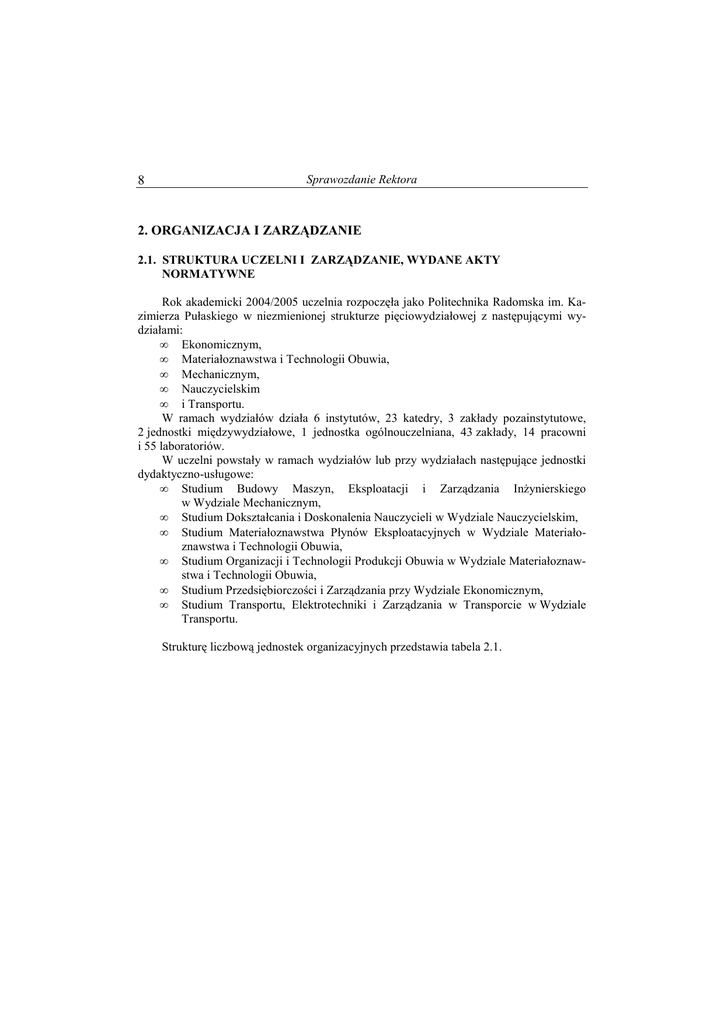 8 Sprawozdanie Rektora 2. ORGANIZACJA I ZARZĄDZANIE 2.1. STRUKTURA UCZELNI I ZARZĄDZANIE, WYDANE AKTY NORMATYWNE Rok akademicki 2004/2005 uczelnia rozpoczęła jako Politechnika Radomska im. Kazimierza Pułaskiego w niezmienionej strukturze pięciowydziałowej z następującymi wydziałami: • Ekonomicznym, • Materiałoznawstwa i Technologii Obuwia, • Mechanicznym, • Nauczycielskim • i Transportu. W ramach wydziałów działa 6 instytutów, 23 katedry, 3 zakłady pozainstytutowe, 2 jednostki międzywydziałowe, 1 jednostka ogólnouczelniana, 43 zakłady, 14 pracowni i 55 laboratoriów. W uczelni powstały w ramach wydziałów lub przy wydziałach następujące jednostki dydaktyczno-usługowe: • Studium Budowy Maszyn, Eksploatacji i Zarządzania InŜynierskiego w Wydziale Mechanicznym, • Studium Dokształcania i Doskonalenia Nauczycieli w Wydziale Nauczycielskim, • Studium Materiałoznawstwa Płynów Eksploatacyjnych w Wydziale Materiałoznawstwa i Technologii Obuwia, • Studium Organizacji i Technologii Produkcji Obuwia w Wydziale Materiałoznawstwa i Technologii Obuwia, • Studium Przedsiębiorczości i Zarządzania przy Wydziale Ekonomicznym, • Studium Transportu, Elektrotechniki i Zarządzania w Transporcie w Wydziale Transportu. Strukturę liczbową jednostek organizacyjnych przedstawia tabela 2.1. 2. Organizacja i zarządzanie 9 10 Sprawozdanie Rektora INSTYTUTY W Wydziale Ekonomicznym: • Instytut Ubezpieczeń i Prewencji oraz 3 zakłady pozainstytutowe: - Zakład Ekonomiki Przedsiębiorstwa, - Zakład Koordynacji Badań Naukowych, - Zakład Zarządzania i Marketingu. W Wydziale Mechanicznym: • Instytut Budowy Maszyn, • Instytut Eksploatacji Pojazdów i Maszyn, • Instytut Mechaniki Stosowanej. W Wydziale Transportu: • Instytut Automatyki i Telematyki Transportu, • Instytut Systemów Transportowych. KATEDRY W Wydziale Ekonomicznym: • Katedra Badań Operacyjnych i Ekonometrii, • Katedra Ekonomii, • Katedra Filozofii i Socjologii, • Katedra Międzynarodowych Stosunków Gospodarczych i Integracji Regionalnej, • Katedra Nauk o Jakości, • Katedra Polityki Ekonomicznej i Bankowości, • Katedra Prawa, • Katedra Rozwoju Regionalnego i Lokalnego, • Katedra Zastosowań Matematyki i Statystyki w Ekonomii. W Wydziale Materiałoznawstwa i Technologii Obuwia: • Katedra Chemii, • Katedra Materiałoznawstwa Obuwniczego i OdzieŜowego, • Katedra Ochrony Środowiska, • Katedra Technologii i Materiałoznawstwa, • Katedra Technologii Obuwia i Garbarstwa, • Katedra Tworzyw Sztucznych, • Katedra Wzornictwa Obuwia i OdzieŜy. W Wydziale Mechanicznym: • Katedra Fizyki. W Wydziale Nauczycielskim: • Katedra Informatyki, 2. Organizacja i zarządzanie • • • • • Katedra Matematyki, Katedra Pedagogiki i Psychologii, Katedra Sztuki, Katedra Wychowania Fizycznego i Zdrowotnego, Katedra Wychowania Technicznego. Jednostki międzywydziałowe: • Studium Języków Obcych, • Studium Wychowania Fizycznego i Sportu. Jednostka ogólnouczelniana: • Biblioteka Główna. 11 12 Sprawozdanie Rektora 2. Organizacja i zarządzanie 13 14 Sprawozdanie Rektora Praca uczelni w ramach podstawowej struktury administracyjnej realizowana jest przez: Pion rektora z podległymi działami i samodzielnymi stanowiskami pracy: • Organizacji i Zarządzania, • Kadr, • Pełnomocnikiem ds. Ochrony Informacji Niejawnych z podległymi stanowiskami pracy: - ds Obronnych, - Kancelarią Tajną, - Administratorem Systemu Sieci Teleinformatycznych, • Stanowiskiem Pracy ds. Audytu Wewnętrznego. Pion prorektora ds. dydaktycznych i studenckich z podległymi działami i samodzielnymi stanowiskami pracy: • Radcami Prawnymi, • Nauczania, • Spraw Studenckich z Centrum Promocji Studentów i Absolwentów Politechniki Radomskiej, • Wydawnictwem Politechniki Radomskiej z Zakładem Poligraficznym oraz Działem Składu i Grafiki Komputerowej. Pion prorektora ds. rozwoju kadry naukowej i współpracy z zagranicą z działami: • Rozwoju Kadry Naukowej, • Współpracy z Zagranicą, • Ośrodkiem Transferu Innowacji. Pion prorektora ds. nauki i współpracy z gospodarką narodową z działami i samodzielnym stanowiskiem pracy: • Badań Naukowych i Współpracy z Gospodarką Narodową, • Stanowiskiem Pracy ds. Wynalazczości i Ochrony Patentowej, • Centrum Sieciowo-Komputerowym. Pion kanclerza z działami, sekcjami i samodzielnymi stanowiskami pracy: • Ogólno-Administracyjnym, • Inwestycji i Remontów, • Aparatury, Zaopatrzenia i Transportu, • Technicznym, • Inwentaryzacji Ciągłej, • Socjalnej, • Zamówień Publicznych, • Stanowiskiem Pracy ds. BHP i P.PoŜ., • Stanowiskiem Pracy ds. Ekonomicznych, • Stanowiskiem Pracy ds. Komputeryzacji. 2. Organizacja i zarządzanie 15 Pion kwestora podległy kanclerzowi z samodzielnymi sekcjami: • Księgowości Majątkowej i Kosztów, • Księgowości Finansowej, • Rachuby Płac. W zarządzaniu uczelnią udział bierze cała jej społeczność poprzez organy kolegialne, którymi są senat i rady wydziałów. Senat uczelni pracował według własnego regulaminu zwoływania posiedzeń, a takŜe uchwalonego corocznie planu pracy na dany rok akademicki. Przyjęte na posiedzeniach uchwały senatu były konsekwentnie wprowadzane w Ŝycie w formie zarządzeń rektora, poleceń słuŜbowych, a takŜe ogłaszane w pismach okólnych. W roku akademickim 2004/2005 i w roku kalendarzowym 2005 odbyło się 13 posiedzeń senatu, na których podjęto 52 uchwały. PoniŜej przedstawiono uchwały podjęte na posiedzeniach senatu Politechniki Radomskiej. Tabela 2.2. Uchwały senatu Politechniki Radomskiej im. K. Pułaskiego Lp. DATA DOTYCZĄCE 1. Nr protokołu Nr uchwały 000-8/1/2004 28.10.2004 2. 3. 000-8/2/2004 000-8/3/2004 28.10.2004 28.10.2004 4. 000-9/1/2004 25.11.2004 5. 000-9/2/2004 25.11.2004 6. bez uchwał 14.12.2004 7. 000-1/1/2005 27.01.2005 8. 000-1/2/2005 27.01.2005 9. 000-1/3/2005 27.01.2005 wyboru bi
