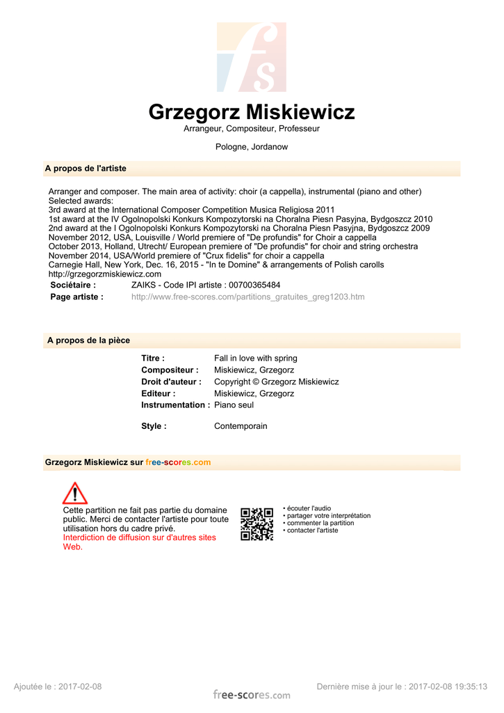 Grzegorz Miskiewicz Arrangeur, Compositeur, Professeur Pologne, Jordanow A propos de l'artiste Arranger and composer. The main area of activity: choir (a cappella), instrumental (piano and other) Selected awards: 3rd award at the International Composer Competition Musica Religiosa 2011 1st award at the IV Ogolnopolski Konkurs Kompozytorski na Choralna Piesn Pasyjna, Bydgoszcz 2010 2nd award at the I Ogolnopolski Konkurs Kompozytorski na Choralna Piesn Pasyjna, Bydgoszcz 2009 November 2012, USA, Louisville / World premiere of "De profundis" for Choir a cappella October 2013, Holland, Utrecht/ European premiere of "De profundis" for choir and string orchestra November 2014, USA/World premiere of "Crux fidelis" for choir a cappella Carnegie Hall, New York, Dec. 16, 2015 - "In te Domine" & arrangements of Polish carolls http://grzegorzmiskiewicz.com Sociétaire : ZAIKS - Code IPI artiste : 00700365484 Page artiste : http://www.free-scores.com/partitions_gratuites_greg1203.htm A propos de la pièce Titre : Compositeur : Droit d'auteur : Editeur : Instrumentation : Fall in love with spring Miskiewicz, Grzegorz Copyright © Grzegorz Miskiewicz Miskiewicz, Grzegorz Piano seul Style : Contemporain Grzegorz Miskiewicz sur free-scores.com Cette partition ne fait pas partie du domaine public. Merci de contacter l'artiste pour toute utilisation hors du cadre privé. Interdiction de diffusion sur d'autres sites Web. Ajoutée le : 2017-02-08 • écouter l'audio • partager votre interprétation • commenter la partition • contacter l'artiste Dernière mise à jour le : 2017-02-08 19:35:13 Fall in love with spring q = 120 # # 4 œ œ œ. œ. œ & 4 P œ œ œ œ ‰ œ œ œ ˙ ? # # 44 . Œ ° *° * Fortepian 5 cantabile ## . Œ & . œ œ œœ˙ . œ . œ Œ œœ œ œœ˙ j j ‰˙ œ œ œ œ œ œ œ ˙‰ œ œ œ œ œ œ œ ‰˙ œ œ œ œ œ œ œ . . . Œ simile œ œ œ œœ œ œ. œ œ œ œœ œœ Grzegorz Miśkiewicz œ œ œ œ. œ j ‰œœœœœ œ ‰œœœœœœœ ‰œœœœœœœ ‰œœœœœœœ œ ˙ w w ? # # .. ˙ . Ó 9 & ## Œ œ œœ œœ œ œ œ œœ œ œ . œœœ œ œœœœ œœ œ Œ œ˙ œ ˙ œ . œœœ œ j ‰œœœœœ œ ‰œœœœœœœ ‰œœœœœœœ ‰œœœœœœœ œ ˙ w w ? ## ˙ . Ó ## Œ œ œ œ œ œ œ œ ‰ & Ó ˙ ˙ ˙ ‰ œ œ œ ˙‰ œ œ œ ˙‰ œ œ œ ˙‰ œ œ œ ? ## ˙ œ 13 œœœ œœœ œœœœœœœ œ œ ## Œ œ œ œ œ œ˙ œ˙ œ ‰ œ œ œ œ œ œ & ˙ Ó ‰ œ œ œ ‰˙ œ œ œ ‰˙ œ œ œ ˙‰ œ œ œ œ œ œ œ œ œ ˙ ? ## œ œ 17