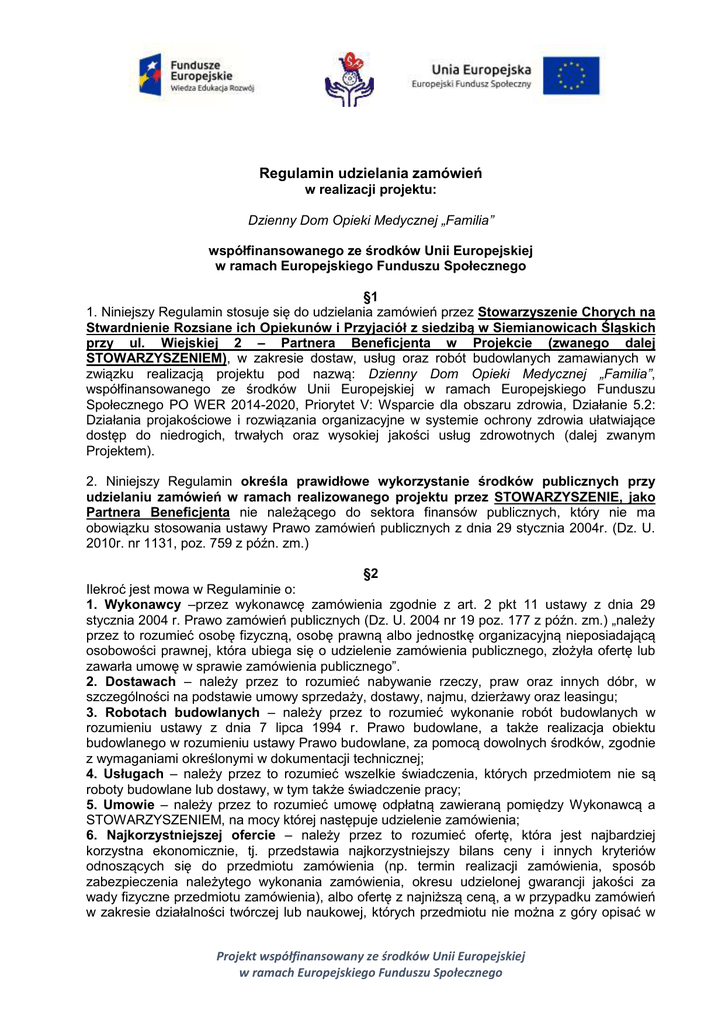 Regulamin udzielania zamówień w realizacji projektu: Dzienny Dom Opieki Medycznej „Familia” współfinansowanego ze środków Unii Europejskiej w ramach Europejskiego Funduszu Społecznego §1 1. Niniejszy Regulamin stosuje się do udzielania zamówień przez Stowarzyszenie Chorych na Stwardnienie Rozsiane ich Opiekunów i Przyjaciół z siedzibą w Siemianowicach Śląskich przy ul. Wiejskiej 2 – Partnera Beneficjenta w Projekcie (zwanego dalej STOWARZYSZENIEM), w zakresie dostaw, usług oraz robót budowlanych zamawianych w związku realizacją projektu pod nazwą: Dzienny Dom Opieki Medycznej „Familia”, współfinansowanego ze środków Unii Europejskiej w ramach Europejskiego Funduszu Społecznego PO WER 2014-2020, Priorytet V: Wsparcie dla obszaru zdrowia, Działanie 5.2: Działania projakościowe i rozwiązania organizacyjne w systemie ochrony zdrowia ułatwiające dostęp do niedrogich, trwałych oraz wysokiej jakości usług zdrowotnych (dalej zwanym Projektem). 2. Niniejszy Regulamin określa prawidłowe wykorzystanie środków publicznych przy udzielaniu zamówień w ramach realizowanego projektu przez STOWARZYSZENIE, jako Partnera Beneficjenta nie należącego do sektora finansów publicznych, który nie ma obowiązku stosowania ustawy Prawo zamówień publicznych z dnia 29 stycznia 2004r. (Dz. U. 2010r. nr 1131, poz. 759 z późn. zm.) §2 Ilekroć jest mowa w Regulaminie o: 1. Wykonawcy –przez wykonawcę zamówienia zgodnie z art. 2 pkt 11 ustawy z dnia 29 stycznia 2004 r. Prawo zamówień publicznych (Dz. U. 2004 nr 19 poz. 177 z późn. zm.) „należy przez to rozumieć osobę fizyczną, osobę prawną albo jednostkę organizacyjną nieposiadającą osobowości prawnej, która ubiega się o udzielenie zamówienia publicznego, złożyła ofertę lub zawarła umowę w sprawie zamówienia publicznego”. 2. Dostawach – należy przez to rozumieć nabywanie rzeczy, praw oraz innych dóbr, w szczególności na podstawie umowy sprzedaży, dostawy, najmu, dzierżawy oraz leasingu; 3. Robotach budowlanych – należy przez to rozumieć wykonanie robót budowlanych w rozumieniu ustawy z dnia 7 lipca 1994 r. Prawo budowlane, a także realizacja obiektu budowlanego w rozumieniu ustawy Prawo budowlane, za pomocą dowolnych środków, zgodnie z wymaganiami określonymi w dokumentacji technicznej; 4. Usługach – należy przez to rozumieć wszelkie świadczenia, których przedmiotem nie są roboty budowlane lub dostawy, w tym także świadczenie pracy; 5. Umowie – należy przez to rozumieć umowę odpłatną zawieraną pomiędzy Wykonawcą a STOWARZYSZENIEM, na mocy której następuje udzielenie zamówienia; 6. Najkorzystniejszej ofercie – należy przez to rozumieć ofertę, która jest najbardziej korzystna ekonomicznie, tj. przedstawia najkorzystniejszy bilans ceny i innych kryteriów odnoszących się do przedmiotu zamówienia (np. termin realizacji zamówienia, sposób zabezpieczenia należytego wykonania zamówienia, okresu udzielonej gwarancji jakości za wady fizyczne przedmiotu zamówienia), albo ofertę z najniższą ceną, a w przypadku zamówień w zakresie działalności twórczej lub naukowej, których przedmiotu nie można z góry opisać w Projekt współfinansowany ze środków Unii Europejskiej w ramach Europejskiego Funduszu Społecznego sposób jednoznaczny i wyczerpujący - ofertę, która przedstawia najkorzystniejszy bilans ceny i innych kryteriów odnoszących się do przedmiotu zamówienia. 7. Prawie Zamówień Publicznych – należy przez to rozumieć ustawę z dnia 29 stycznia 2004 r. – Prawo zamówień publicznych (Dz. U. z 2007 r. Nr 223, poz. 1655, z 2008 r. Nr 171, poz. 1058, Nr 220, poz. 1420 i Nr 227, poz. 1505 oraz z 2009 r. Nr 19, poz. 101, Nr 65, poz. 545, Nr 91, poz. 742, Nr 157, poz. 1241, Nr 206, poz. 1591, Nr 219, poz. 1706 i Nr 223, poz. 1778). §3 STOWARZYSZENIE realizując Projekt w ramach PO WER 2014-2020 ponosi wydatki zgodnie z zasadą efektywnego zarządzania finansami, tj. w sposób racjonalny i efektywny, z uwzględnieniem poniższych zasad: 1. przy udzielaniu zamówień w ramach Projektu nie przekraczających równowartość kwoty 20 tys. PLN netto, tj. bez podatku od towarów i usług (VAT), STOWARZYSZENIE zobowiązane jest dokonać rozeznania rynku – zgodnie z procedurą szczegółowo przedstawioną w §8; 2. przy udzielaniu zamówień w ramach Projektu przekraczających wartość 20 tys. PLN netto do 50 tys. PLN netto, tj. bez podatku od towarów i usług (VAT), STOWARZYSZENIE zobowiązane jest dokonać rozeznania rynku w celu potwierdzenia jego ceny rynkowej – zgodnie z procedurą szczegółowa przedstawioną w §9; 3. przy udzielaniu zamówień w ramach Projektu przekraczających wartość 50 tys. PLN netto, tj. bez podatku od towarów i usług (VAT), STOWARZYSZENIE zobowiązane jest dokonać rozeznania rynku w celu potwierdzenia jego ceny rynkowej – zgodnie z procedurą szczegółowa przedstawioną w §10. §4 1. STOWARZYSZENIE zobowiązuje się do przygotowania i przeprowadzenia postępowania o udzielenie zamówienia publicznego w ramach projektu w sposób zapewniający w szczególności zachowanie uczciwej konkurencji i równe traktowanie wykonawców, a także zgodnie z warunkami i procedurami określonymi w Wytycznych. 2. Udzielanie zamówienia publicznego w ramach projektu następuje zgodnie z zasadą konkurencyjności w przypadku zamówień publicznych przekraczających wartość 50 tys. PLN netto, tj. bez podatku od towarów i usług (VAT). 3. Zasady konkurencyjności STOWARZYSZENIE nie stosuje do: 1) zamówień dotyczących zadań zlecanych w ramach kosztów pośrednich; 2) zamówień dotyczących zadań wykonywanych przez personel projektu zatrudniony na podstawie umowy o pracę. §5 Do opisu przedmiotu zamówienia muszą zostać zastosowane nazwy i kody określone we Wspólnym Słowniku Zamówień, o którym mowa w rozporządzeniu (WE) nr 2195/2002 Parlamentu Europejskiego i Rady z dnia 5 listo