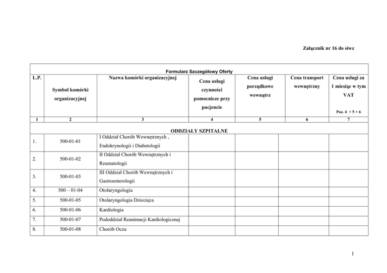 Załącznik nr 16 do siwz Formularz Szczegółowy Oferty Nazwa komórki organizacyjnej L.P. Cena usługi Symbol komórki czynności organizacyjnej pomocnicze przy Cena usługi Cena transport Cena usługi za porządkowe wewnętrzny 1 miesiąc w tym VAT wewnątrz pacjencie Poz. 4 + 5 + 6 1 2 3 4 5 6 7 ODDZIAŁY SZPITALNE I Oddział Chorób Wewnętrznych , 1. 500-01-01 2. 500-01-02 3. 500-01-03 4. 500 – 01-04 5. 500-01-05 Otolaryngologia Dziecięca 6. 500-01-06 Kardiologia 7. 500-01-07 Pododdział Reanimacji Kardiologicznej 8. 500-01-08 Chorób Oczu Endokrynologii i Diabetologii II Oddział Chorób Wewnętrznych i Reumatologii III Oddział Chorób Wewnętrznych i Gastroenterologii Otolaryngologia 1 9. 500-01-09 Neurologia I 10. 500-01-10 Neurologia II z Pododdz.Udarowym 11. 500-01-11 Rehabilitacja Lecznicza 12. 500-01-12 Oddział Chorób Dzieci i MłodzieŜy 13. 500-01-13 Ośrodek Rehabilitacji Dziennej 14. 500-01-14 15. 500-01-15 16. 500-01-17 17. 500-01-19 Szpitalny Oddział Ratunkowy 18. 500-01-20 PołoŜniczy w tym Patologia CiąŜy 19. 500-01-21 Oddział Ginekologii 20. 500-01-22 Dział Diagnostyczno-Zabiegowy 21. 500-01-23 22. 500-01-24 Oddział Chirurgii Plastycznej 23. 500-01-25 Chirurgia i Urologia Dziecięca 24. 500-01-26 Urologia 25. 500-01-27 Ortopedyczno - Urazowy 26. 500-01-28 Ortopedyczno - Urazowy Dziecięcy Ośrodek Rehabilitacji Dziennej dla Dzieci i MłodzieŜy Oddz. Neurologii Dziecięcej i Leczenia Padaczek Oddział Neonatologii z Patologią i Intens.Terapią Chirurgia Ogólna z łóŜkami Intensywnego Nadzoru Chirurgicznego 2 Oddział Anestezjologii i Intensywnej 27. 500-01-30 28. 500-01-31 29. 500-01-32 30. 500-01-33 31 500-01-34 Blok Operacyjny Chorób Oczu 32. 500-01-35 Blok Operacyjny Otolaryngologii 33. 500-01-36 Blok Operacyjny Chirurgii Plastycznej 34. 500-01-37 Terapii BLOKI OPERACYJNE ODDZIAŁÓW Blok Porodowy Blok Operacyjny Chirurgii Ogólnej, Urologii i Ortopedyczno-Urazowego Blok Operacyjny Chirurgii, Ortopedii. i Otolaryngologii Dziecięcej. Blok Operacyjny Oddz: PołoŜniczego i Ginekologii IZBY PRZYJĘĆ 35. 500-01-38 36. 500-01-39 37. 500-01-40 38. 500-01-41 Izba Przyjęć Oddz. Chirurgii Ogólej, Urologii i Ort.Urazowego Izba Przyjęć Oddz Chirurgii,Ortopedii i Otolaryngologii Dziec. Izba Przyjęć Chorób Wewnętrznych, Neurologii i Rehab. Izba Przyjęć Oddz.Otolaryngologii i Chorób Oczu 3 39. 500-01-42 40. 500-01-43 Izba Przyjęć Oddziałów Dziecięcych Izba Przyjęć Oddz.PołoŜn.Ginekologicznych PRZYCHODNIE SPECJALISTYCZNE 41. 500-02-01 Wojewódzka Przychodnia dla Kobiet 42. 500-02-53 Poradnia Ginekologiczno-PołoŜnicza 43. 500-02-89 44. 500-02-90 45. 500-01-62 46. 500-02-02 47. 500-02-19 Poradnia Kardiologiczna 48. 500-02-20 Poradnia Gastroenterologiczna 49. 500-02-21 Poradnia Endokrynologiczna 50 500-02-23 Poradnia Reumatologiczna 51. 500-02-24 Poradnia Neonatologiczna i Ryzyka Okołoporodowego Poradnia CiąŜy Wysokiego Ryzyka Pracownia USG Narządu Rodnego i Diagn.Schorz.Sutka Wojewódzka Przychodnia Chorób Wewnętrznych Poradnia Chorób Nerek i Nadciśnienia Tętniczego 4 52. 500-02-25 53. 500-02-26 Poradnia Alergologiczna Poradnia Cukrzycowa z gabinetem powikłań 54. 55. 500-02-28 Poradnia Osteoporozy 56. 500-02-04 Wojewódzka Przychodnia Chirurgiczna 57. 500-02-36 Poradnia Chirurgiczna 58. 500-02-37 Poradnia Urazowa 59. 500-02-38 Poradnia Ortopedyczna 60. 500-02-39 Poradnia Urologiczna 61. 500-02-45 Poradnia Chirurgii Plastycznej 62. 500-02-79 Gipsownia 63. 500-02-80 Sala Operacyjna i Opatrunkowa 64. 500-02-05 65. 500-02-46 Poradnia Chirurgii i Urologii Dziecięcej 66. 500-02-48 Poradnia Preluksacyjna 67. 500-02-73 Poradnia Laryngologii Dziecięcej 68. 500-02-50 Wojewódzka Przychodnia Chirurgii Dziecięcej Poradnia Urazowo-Ortopedyczna Dziecięca 5 69. 500-02-83 Pracownia Ultrasonografii 70. 500-02-06 Wojewódzka Przychodnia Chorób Oczu 71. 500-02-59 Poradnia Okulistyczna 72. 500-02-60 Poradnia Okulistyki Dziecięcej 73. 500-02-07 74. 500-02-61 75. 500-02-62 76. 500-02-63 Poradnia Audiologiczna j.w. 77. 500-02-64 Poradnia Logopedyczna j.w. 78. 500-02-87 Pracownia Audiologiczna j.w. 79. 500-02-08 80. 500-02-66 Poradnia Endokrynologiczna WPCHDiM 81. 500-02-69 Poradnia Nefrologiczna WPCHDiM 82. 500-02-70 83. 500-02-71 Wojewódzka Przychodnia Otolaryngologiczna Poradnia Laryngologii Ogólnej z gabinetem alergologicznym Poradnia Foniatryczna (bud. Laryngologii i Okulistyki) Wojewódzka Przychodnia Chorób Dzieci i MłodzieŜy Poradnia Schorzeń Somatycznych WPCHDiM Poradnia Neurologiczna WPCHDiM 6 86. 500-02-75 85. 500-02-82 86. 500-02-09 87. 500-02-56 88. 500-02-76 89. 500-02-55 Poradnia Kardiologiczna WPCHDiM Gabinet ZabiegowoSzczepienny/WPCHDiM/ Wojewódzka Przychodnia Rehabilitacji Leczniczej Poradnia Rehabilitacji Leczniczej dla dorosłych (bud. WPS) Poradnia Rehabilitacji Leczniczej dla dzieci i młodzieŜy (bud. Pediatrii) Wojewódzka Poradnia Neurologiczna (bud. Woj. Przych. Specj.) DIAGNOSTYKA 90. 500-01-A2 91. 500-01-45 92. 500-01-46 RTG Chirurgii Dziecięcej 93. 500-01-47 RTG Pediatrii 94. 500-01-49 RTG (w Woj. Przychodni Chirurgicznej) 95. 500-01-50 Pracownia Ultrasonografii Chir.Dorosłych Dział Diagnostyki Obrazowej RTG Chirurgii Ogólnej (przy ZDO Interna) 7 96. 500-01-51 Pracownia Ultrasonografii Pediatrii Pracownia RTG Ogólna (przy ZDO bud. 97. 500-01-54 98. 500-01-55 99. 500-01-56 100. 500-01-A3 101. 500-01-57 Pracownia EKG i Prób Wysiłkowych 102. 500-01-58 Pracownia Echoelektrokardiografii 103. 500-01-71 104. 500-02-81 Pracownia EKG/WPCHDiM/ 105. 500-01-A1 Dział Diagnostyki Laboratoryjnej 106. 500-01-77 Pracownia Analityki Ogólnej 107. 500-01-78 Pracownia Chemii Klinicznej 108. 500-01-79 Pracownia Hormonów 109. 500-01-80 Pracownia Mikrobiologii 110. 500-01-81 Pracownia Hematologii i Hemostazy 111. 500-01-82 Pracownia Badań Laboratoryjnych Interny) Pracownia Osteodenzynometrii (II wewnętrzny) Pracownia Ultrasonografii ZDO Dział Nieinwazyjnej Diagnostyki Układu KrąŜenia (bud. Interny) Pracownia Nieinwaz