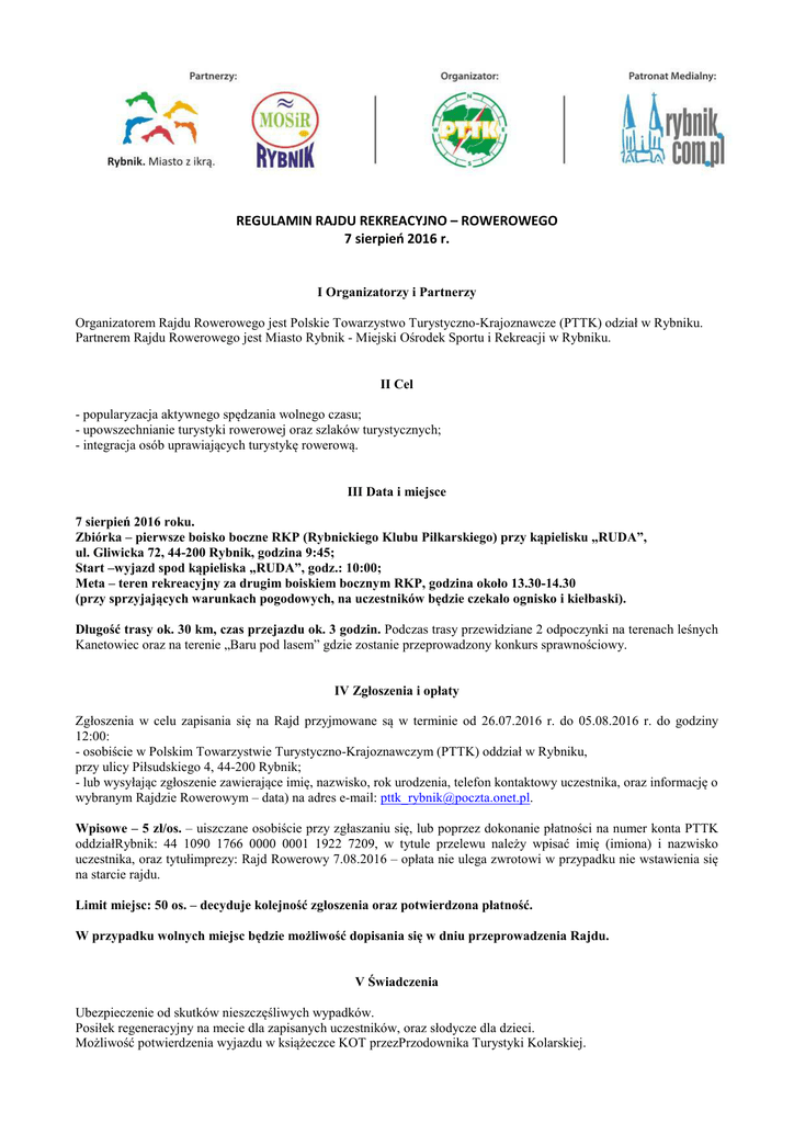 REGULAMIN RAJDU REKREACYJNO – ROWEROWEGO 7 sierpień 2016 r. I Organizatorzy i Partnerzy Organizatorem Rajdu Rowerowego jest Polskie Towarzystwo Turystyczno-Krajoznawcze (PTTK) odział w Rybniku. Partnerem Rajdu Rowerowego jest Miasto Rybnik - Miejski Ośrodek Sportu i Rekreacji w Rybniku. II Cel - popularyzacja aktywnego spędzania wolnego czasu; - upowszechnianie turystyki rowerowej oraz szlaków turystycznych; - integracja osób uprawiających turystykę rowerową. III Data i miejsce 7 sierpień 2016 roku. Zbiórka – pierwsze boisko boczne RKP (Rybnickiego Klubu Piłkarskiego) przy kąpielisku „RUDA”, ul. Gliwicka 72, 44-200 Rybnik, godzina 9:45; Start –wyjazd spod kąpieliska „RUDA”, godz.: 10:00; Meta – teren rekreacyjny za drugim boiskiem bocznym RKP, godzina około 13.30-14.30 (przy sprzyjających warunkach pogodowych, na uczestników będzie czekało ognisko i kiełbaski). Długość trasy ok. 30 km, czas przejazdu ok. 3 godzin. Podczas trasy przewidziane 2 odpoczynki na terenach leśnych Kanetowiec oraz na terenie „Baru pod lasem” gdzie zostanie przeprowadzony konkurs sprawnościowy. IV Zgłoszenia i opłaty Zgłoszenia w celu zapisania się na Rajd przyjmowane są w terminie od 26.07.2016 r. do 05.08.2016 r. do godziny 12:00: - osobiście w Polskim Towarzystwie Turystyczno-Krajoznawczym (PTTK) oddział w Rybniku, przy ulicy Piłsudskiego 4, 44-200 Rybnik; - lub wysyłając zgłoszenie zawierające imię, nazwisko, rok urodzenia, telefon kontaktowy uczestnika, oraz informację o wybranym Rajdzie Rowerowym – data) na adres e-mail: [email protected]. Wpisowe – 5 zł/os. – uiszczane osobiście przy zgłaszaniu się, lub poprzez dokonanie płatności na numer konta PTTK oddziałRybnik: 44 1090 1766 0000 0001 1922 7209, w tytule przelewu należy wpisać imię (imiona) i nazwisko uczestnika, oraz tytułimprezy: Rajd Rowerowy 7.08.2016 – opłata nie ulega zwrotowi w przypadku nie wstawienia się na starcie rajdu. Limit miejsc: 50 os. – decyduje kolejność zgłoszenia oraz potwierdzona płatność. W przypadku wolnych miejsc będzie możliwość dopisania się w dniu przeprowadzenia Rajdu. V Świadczenia Ubezpieczenie od skutków nieszczęśliwych wypadków. Posiłek regeneracyjny na mecie dla zapisanych uczestników, oraz słodycze dla dzieci. Możliwość potwierdzenia wyjazdu w książeczce KOT przezPrzodownika Turystyki Kolarskiej. VI Postanowienia szczegółowe 1. Warunkiem wzięcia udziału w imprezie jest: - wpisanie się na listę uczestników i uiszczenie wpisowego - podpisanie stosownego oświadczenia podczas zapisów lub w dniu Rajdu; - posiadanie własnego sprawnego roweru. 2. Osoby do 15 roku życia mogą wziąć udział w imprezie tylko pod opieką osoby dorosłej. 3. Impreza odbędzie się bez względu na warunki pogodowe. 4. Każdy uczestnik bierze udział w imprezie na własną odpowiedzialność i samodzielnie decyduje o swoich predyspozycjachfizycznych do udziału w wyjeździe 5. Uczestnicy imprezy zobowiązani są do przestrzegania przepisów ruchu drogowego oraz postanowień Organizatora. 6. W trosce o bezpieczeństwo uczestnicy powinni posiadać kask rowerowy. 7. Uczestnicy imprezy podzieleni zostaną na grupy, które prowadzone będą przez opiekunów danych grup. 8. Organizator nie odpowiada za szkody rzeczowe wynikłe w stosunku do uczestników i osób trzecich. 9. Ewentualna rezygnacja z udziału w imprezie podczas jego trwania powinna być zgłoszona opiekunowi grupy. 10. Po dotarciu na linię mety następuje zakończenie imprezy i od tego momentu każdy z uczestników wraca do domu na własnąodpowiedzialność. 11. Organizator zastrzega sobie prawo interpretacji niniejszego regulaminu oraz możliwość wprowadzenia zmian. 12. Każdy uczestnik zobowiązany jest do zapoznania się z Regulaminem przed rozpoczęciem Rajdu. 13. Każdy uczestnik (lub rodzic/opiekun prawny) jest zobowiązany wyrazić zgodę na przetwarzanie swoich (lub dziecka) danychosobowych w celu organizacji i przeprowadzenia imprezy oraz wyrazić zgodę na ewentualne wykorzystanie wizerunku dlapotrzeb sprawozdawczych z imprezy (bez podania imienia i nazwiska). Administratorem danych osobowych jest PTTK oddział w Rybniku. Dane będą przetwarzane w celu organizacji i przeprowadzeniaimprezy. Podanie danych jest dobrowolne, ale niezbędne do realizacji wskazanych celów. Wizerunek (bez podania danych) możebyć udostępniony na stronach www.pttk.rybnik.pl, www.mosir.rybnik.pl, www.rybnik.com.pl, oraz na Facebook’u PTTK Rybnik, MOSiR Rybnik oraz portalu Rybnik.Com.Pl.Każdy uczestnik (lub rodzic/opiekun prawny) ma prawo dostępu do treści swoich/dziecka danych oraz ich poprawiania. Zabierz sprawny rower i ruszaj z nami!