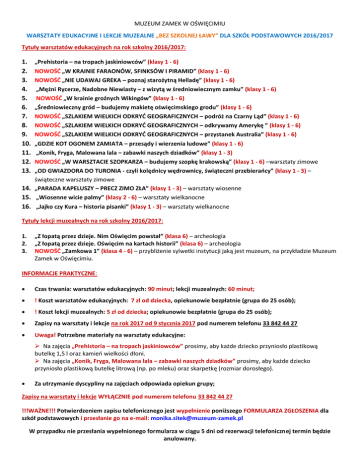 MUZEUM ZAMEK W OŚWIĘCIMIU WARSZTATY EDUKACYJNE I LEKCJE MUZEALNE „BEZ SZKOLNEJ ŁAWY” DLA SZKÓŁ PODSTAWOWYCH 2016/2017 Tytuły warsztatów edukacyjnych na rok szkolny 2016/2017: 1. 2. 3. 4. 5. 6. 7. 8. 9. 10. 11. 12. 13. „Prehistoria – na tropach jaskiniowców” (klasy 1 - 6) NOWOŚĆ „W KRAINIE FARAONÓW, SFINKSÓW I PIRAMID” (klasy 1 - 6) NOWOŚĆ „NIE UDAWAJ GREKA – poznaj starożytną Helladę” (klasy 1 - 6) „Mężni Rycerze, Nadobne Niewiasty – z wizytą w średniowiecznym zamku” (klasy 1 - 6) NOWOŚĆ „W krainie groźnych Wikingów” (klasy 1 - 6) „Średniowieczny gród – budujemy makietę oświęcimskiego grodu” (klasy 1 - 6) NOWOŚĆ „SZLAKIEM WIELKICH ODKRYĆ GEOGRAFICZNYCH – podróż na Czarny Ląd” (klasy 1 - 6) NOWOŚĆ „SZLAKIEM WIELKICH ODKRYĆ GEOGRAFICZNYCH – odkrywamy Amerykę ” (klasy 1 - 6) NOWOŚĆ „SZLAKIEM WIELKICH ODKRYĆ GEOGRAFICZNYCH – przystanek Australia” (klasy 1 - 6) „GDZIE KOT OGONEM ZAMIATA – przesądy i wierzenia ludowe” (klasy 1 - 6) „Konik, Fryga, Malowana lala – zabawki naszych dziadków” (klasy 1 - 3) NOWOŚĆ „W WARSZTACIE SZOPKARZA – budujemy szopkę krakowską” (klasy 1 - 6) –warsztaty zimowe „OD GWIAZDORA DO TURONIA - czyli kolędnicy wędrownicy, świąteczni przebierańcy” (klasy 1 - 3) – świąteczne warsztaty zimowe 14. „PARADA KAPELUSZY – PRECZ ZIMO ZŁA” (klasy 1 - 3) – warsztaty wiosenne 15. „Wiosenne wicie palmy” (klasy 2 - 6) – warsztaty wielkanocne 16. „Jajko czy Kura – historia pisanki” (klasy 1 - 3) – warsztaty wielkanocne Tytuły lekcji muzealnych na rok szkolny 2016/2017: 1. 2. 3. „Z łopatą przez dzieje. Nim Oświęcim powstał” (klasa 6) – archeologia „Z łopatą przez dzieje. Oświęcim na kartach historii” (klasa 6) – archeologia NOWOŚĆ „Zamkowa 1” (klasa 4 - 6) – przybliżenie sylwetki instytucji jaką jest muzeum, na przykładzie Muzeum Zamek w Oświęcimiu. INFORMACJE PRAKTYCZNE: Czas trwania: warsztatów edukacyjnych: 90 minut; lekcji muzealnych: 60 minut; ! Koszt warsztatów edukacyjnych: 7 zł od dziecka, opiekunowie bezpłatnie (grupa do 25 osób); ! Koszt lekcji muzealnych: 5 zł od dziecka; opiekunowie bezpłatnie (grupa do 25 osób); Zapisy na warsztaty i lekcje na rok 2017 od 9 stycznia 2017 pod numerem telefonu 33 842 44 27 Uwaga! Potrzebne materiały na warsztaty edukacyjne: Na zajęcia „Prehistoria – na tropach jaskiniowców” prosimy, aby każde dziecko przyniosło plastikową butelkę 1,5 l oraz kamień wielkości dłoni. Na zajęcia „Konik, Fryga, Malowana lala – zabawki naszych dziadków” prosimy, aby każde dziecko przyniosło plastikową butelkę litrową (np. po mleku) oraz skarpetkę (rozmiar dorosłego). Za utrzymanie dyscypliny na zajęciach odpowiada opiekun grupy; Zapisy na warsztaty i lekcje WYŁĄCZNIE pod numerem telefonu 33 842 44 27 !!!WAŻNE!!! Potwierdzeniem zapisu telefonicznego jest wypełnienie poniższego FORMULARZA ZGŁOSZENIA dla szkół podstawowych i przesłanie go na e-mail: [email protected] W przypadku nie przesłania wypełnionego formularza w ciągu 5 dni od rezerwacji telefonicznej termin będzie anulowany. FORMULARZ ZGŁOSZENIA GRUPY NA WARSZTATY EDUKACYJNE/ LEKCJE MUZEALNE DLA SZKÓŁ PODSTAWOWYCH 2016/2017 Lp. Dane potrzebne do zapisu grupy na warsztaty/lekcje 1 Nazwa szkoły 2 Imię i nazwisko nauczyciela 3 Tel. kontaktowy 4 Tytuł wybranych warsztatów/lekcji 5 Dzień i godzina przeprowadzenia zajęć w Muzeum (Uzgodniony telefonicznie!!!) 6 Klasa 7 Liczba uczniów w klasie 8 Uwagi