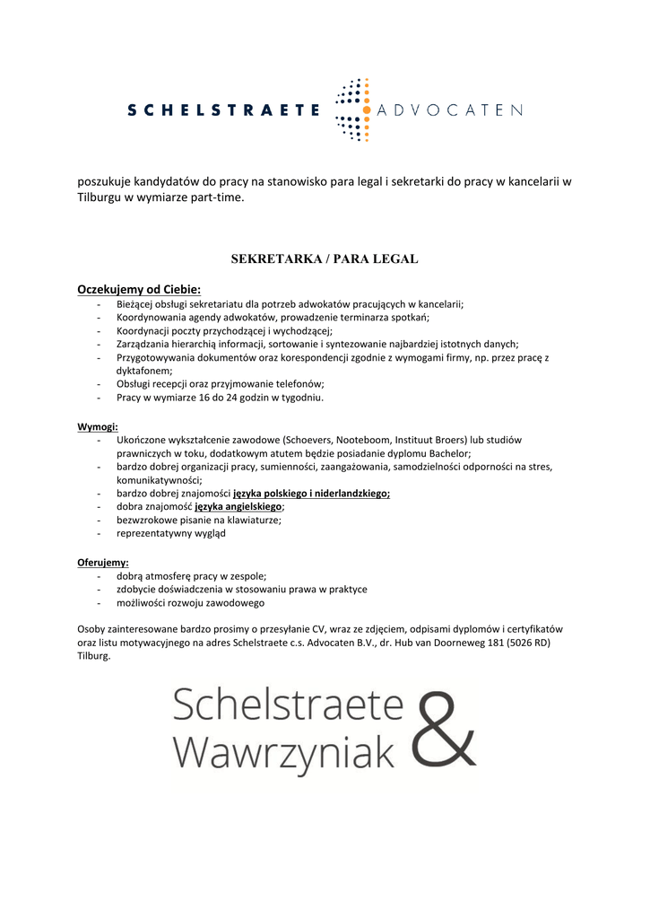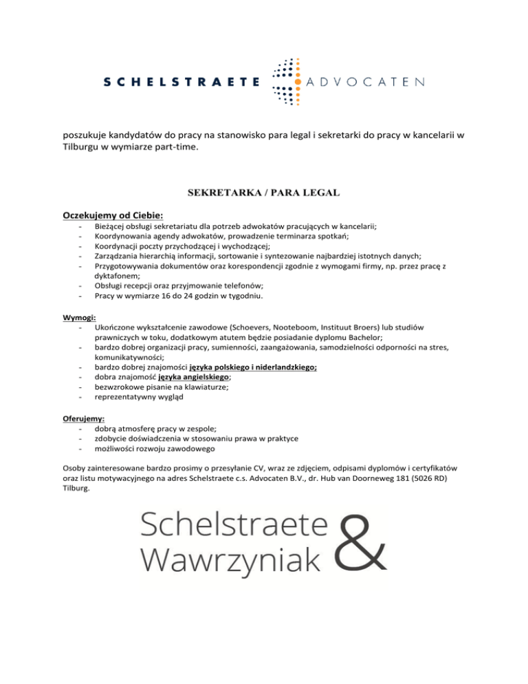 poszukuje kandydatów do pracy na stanowisko para legal i sekretarki do pracy w kancelarii w Tilburgu w wymiarze part-time. SEKRETARKA / PARA LEGAL Oczekujemy od Ciebie: - Bieżącej obsługi sekretariatu dla potrzeb adwokatów pracujących w kancelarii; Koordynowania agendy adwokatów, prowadzenie terminarza spotkań; Koordynacji poczty przychodzącej i wychodzącej; Zarządzania hierarchią informacji, sortowanie i syntezowanie najbardziej istotnych danych; Przygotowywania dokumentów oraz korespondencji zgodnie z wymogami firmy, np. przez pracę z dyktafonem; Obsługi recepcji oraz przyjmowanie telefonów; Pracy w wymiarze 16 do 24 godzin w tygodniu. Wymogi: - Ukończone wykształcenie zawodowe (Schoevers, Nooteboom, Instituut Broers) lub studiów prawniczych w toku, dodatkowym atutem będzie posiadanie dyplomu Bachelor; - bardzo dobrej organizacji pracy, sumienności, zaangażowania, samodzielności odporności na stres, komunikatywności; - bardzo dobrej znajomości języka polskiego i niderlandzkiego; - dobra znajomość języka angielskiego; - bezwzrokowe pisanie na klawiaturze; - reprezentatywny wygląd Oferujemy: - dobrą atmosferę pracy w zespole; - zdobycie doświadczenia w stosowaniu prawa w praktyce - możliwości rozwoju zawodowego Osoby zainteresowane bardzo prosimy o przesyłanie CV, wraz ze zdjęciem, odpisami dyplomów i certyfikatów oraz listu motywacyjnego na adres Schelstraete c.s. Advocaten B.V., dr. Hub van Doorneweg 181 (5026 RD) Tilburg.