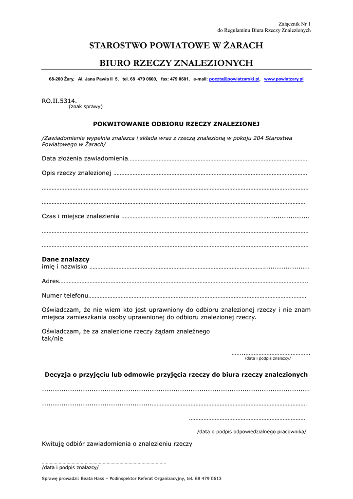 Załącznik Nr 1 do Regulaminu Biura Rzeczy Znalezionych STAROSTWO POWIATOWE W śARACH BIURO RZECZY ZNALEZIONYCH 68-200 Żary, Al. Jana Pawła II 5, tel. 68 479 0600, fax: 479 0601, e-mail: [email protected], www.powiatzary.pl RO.II.5314. (znak sprawy) POKWITOWANIE ODBIORU RZECZY ZNALEZIONEJ /Zawiadomienie wypełnia znalazca i składa wraz z rzeczą znalezioną w pokoju 204 Starostwa Powiatowego w Żarach/ Data złożenia zawiadomienia………………………………………………………………………………………………… Opis rzeczy znalezionej ………………………………………………………………………………………………………… ………………………………………………………………………………………………………………………………………………… ………………………………………………………………………………………………………………………………………………. Czas i miejsce znalezienia ……………………………………………………………………………….................... ………………………………………………………………………………………………………………………………………………… ………………………………………………………………………………………………………………………………………………… Dane znalazcy imię i nazwisko ………………………………………………………………………………………………..................... Adres………………………………………………………………………………………………………………………………………. Numer telefonu……………………………………………………………………………………………………………………… Oświadczam, że nie wiem kto jest uprawniony do odbioru znalezionej rzeczy i nie znam miejsca zamieszkania osoby uprawnionej do odbioru znalezionej rzeczy. Oświadczam, że za znalezione rzeczy żądam znaleźnego tak/nie ……..…………………………………. /data i podpis znalazcy/ Decyzja o przyjęciu lub odmowie przyjęcia rzeczy do biura rzeczy znalezionych ............................................................................................................................ ...................................................…………………………………………………………………………………… ……………………………………………………………… /data o podpis odpowiedzialnego pracownika/ Kwituję odbiór zawiadomienia o znalezieniu rzeczy …………………………………………………………………………………… /data i podpis znalazcy/ Sprawę prowadzi: Beata Hass – Podinspektor Referat Organizacyjny, tel. 68 479 0613