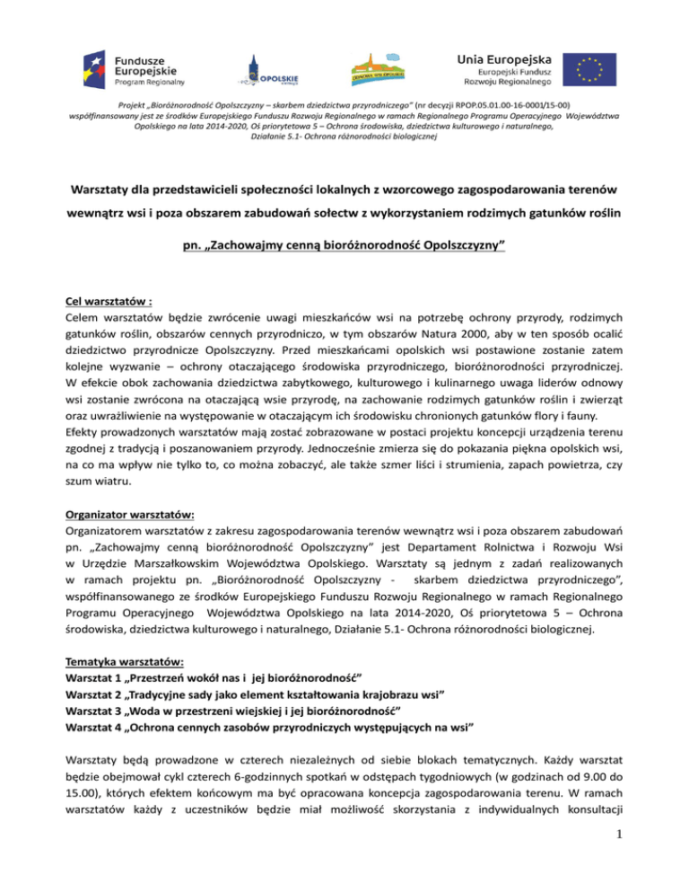 Projekt „Bioróżnorodność Opolszczyzny – skarbem dziedzictwa przyrodniczego” (nr decyzji RPOP.05.01.00-16-0001/15-00) współfinansowany jest ze środków Europejskiego Funduszu Rozwoju Regionalnego w ramach Regionalnego Programu Operacyjnego Województwa Opolskiego na lata 2014-2020, Oś priorytetowa 5 – Ochrona środowiska, dziedzictwa kulturowego i naturalnego, Działanie 5.1- Ochrona różnorodności biologicznej Warsztaty dla przedstawicieli społeczności lokalnych z wzorcowego zagospodarowania terenów wewnątrz wsi i poza obszarem zabudowań sołectw z wykorzystaniem rodzimych gatunków roślin pn. „Zachowajmy cenną bioróżnorodność Opolszczyzny” Cel warsztatów : Celem warsztatów będzie zwrócenie uwagi mieszkańców wsi na potrzebę ochrony przyrody, rodzimych gatunków roślin, obszarów cennych przyrodniczo, w tym obszarów Natura 2000, aby w ten sposób ocalić dziedzictwo przyrodnicze Opolszczyzny. Przed mieszkańcami opolskich wsi postawione zostanie zatem kolejne wyzwanie – ochrony otaczającego środowiska przyrodniczego, bioróżnorodności przyrodniczej. W efekcie obok zachowania dziedzictwa zabytkowego, kulturowego i kulinarnego uwaga liderów odnowy wsi zostanie zwrócona na otaczającą wsie przyrodę, na zachowanie rodzimych gatunków roślin i zwierząt oraz uwrażliwienie na występowanie w otaczającym ich środowisku chronionych gatunków flory i fauny. Efekty prowadzonych warsztatów mają zostać zobrazowane w postaci projektu koncepcji urządzenia terenu zgodnej z tradycją i poszanowaniem przyrody. Jednocześnie zmierza się do pokazania piękna opolskich wsi, na co ma wpływ nie tylko to, co można zobaczyć, ale także szmer liści i strumienia, zapach powietrza, czy szum wiatru. Organizator warsztatów: Organizatorem warsztatów z zakresu zagospodarowania terenów wewnątrz wsi i poza obszarem zabudowań pn. „Zachowajmy cenną bioróżnorodność Opolszczyzny” jest Departament Rolnictwa i Rozwoju Wsi w Urzędzie Marszałkowskim Województwa Opolskiego. Warsztaty są jednym z zadań realizowanych w ramach projektu pn. „Bioróżnorodność Opolszczyzny skarbem dziedzictwa przyrodniczego”, współfinansowanego ze środków Europejskiego Funduszu Rozwoju Regionalnego w ramach Regionalnego Programu Operacyjnego Województwa Opolskiego na lata 2014-2020, Oś priorytetowa 5 – Ochrona środowiska, dziedzictwa kulturowego i naturalnego, Działanie 5.1- Ochrona różnorodności biologicznej. Tematyka warsztatów: Warsztat 1 „Przestrzeń wokół nas i jej bioróżnorodność” Warsztat 2 „Tradycyjne sady jako element kształtowania krajobrazu wsi” Warsztat 3 „Woda w przestrzeni wiejskiej i jej bioróżnorodność” Warsztat 4 „Ochrona cennych zasobów przyrodniczych występujących na wsi” Warsztaty będą prowadzone w czterech niezależnych od siebie blokach tematycznych. Każdy warsztat będzie obejmował cykl czterech 6-godzinnych spotkań w odstępach tygodniowych (w godzinach od 9.00 do 15.00), których efektem końcowym ma być opracowana koncepcja zagospodarowania terenu. W ramach warsztatów każdy z uczestników będzie miał możliwość skorzystania z indywidualnych konsultacji 1 Projekt „Bioróżnorodność Opolszczyzny – skarbem dziedzictwa przyrodniczego” (nr decyzji RPOP.05.01.00-16-0001/15-00) współfinansowany jest ze środków Europejskiego Funduszu Rozwoju Regionalnego w ramach Regionalnego Programu Operacyjnego Województwa Opolskiego na lata 2014-2020, Oś priorytetowa 5 – Ochrona środowiska, dziedzictwa kulturowego i naturalnego, Działanie 5.1- Ochrona różnorodności biologicznej (prowadzonych przez ekspertów) aby dopracować szczegółowo opracowane koncepcje wraz z modelowym projektem zagospodarowania wybranego terenu ze szczególnym uwzględnieniem doboru nasadzeń i pielęgnacji rodzimych gatunków roślin. Warsztat 1 „Przestrzeń wokół nas i jej bioróżnorodność ” (zieleń w zagrodach, przedogródki, tereny wspólne wsi) – możliwości zwiększania bioróżnorodności Uczestnik warsztatu uzyska informację nt.: projektów przedstawiających ciekawe rozwiązania projektowe z poszanowaniem tradycyjnych sposobów zagospodarowania dla regionu opolskiego, rodzimych gatunków drzew, krzewów i roślin zielnych zalecanych do stosowania, a także gatunków i odmian inwazyjnych, które nie powinny być w projektach preferowanych, sposobów kształtowania tradycyjnych ogrodów, przykładowych kompozycji kwiatowych o dużej różnorodności gatunkowej, połączenia gatunków ozdobnych z użytkowymi, wielopiętrowość i śmiałe zestawienia kolorystyczne, możliwości kształtowania terenów zielonych tak aby zachęcić rożne gatunki zwierząt do pojawienia się na danym terenie, w tym m.in. motyli, pszczół, trzmieli (enklawy dla owadów i motyli), tworzenie małej infrastruktury bytowej przyjaznej dla zwierząt (karmniki i budki lęgowe dla ptaków, schrony dla jeży, nietoperzy, hotele dla owadów), umiejscowienia elementów małej architektury ogrodowej takiej jak: ławki, kosze, edukacyjne tablice informacyjne, stojaki na rowery, w poszanowaniu otaczającej przyrody, zasad tworzenia kosztorysu realizacji koncepcji. W trakcie warsztatów zaprezentowane zostaną także wzorcowe koncepcje zagospodarowania terenów zielonych wewnątrz wsi (przykłady krajowe oraz zagraniczne). Opracowanie koncepcji zagospodarowania wsi powinno stać się wzorem do naśladowania dla mieszkańców i rozpocząć proces przekształcania zieleni w przydomowych ogrodach z poszanowaniem rodzimej roślinności i w celu zachowania dziedzictwa przyrodniczego Opolszczyzny. Warsztat 2 „Tradycyjne sady jako element kształtowania krajobrazu wsi ” Uczestnik warsztatu uzyska informację nt.: sposobów zakładania sadu: wybór odpowiedniej lokalizacji, ze względu na warunki fizjograficzne, w tym m.in. poziom nasłonecznienia, podłoże, analizę otoczenia, gatunków rodzimych drzew owocowych występują