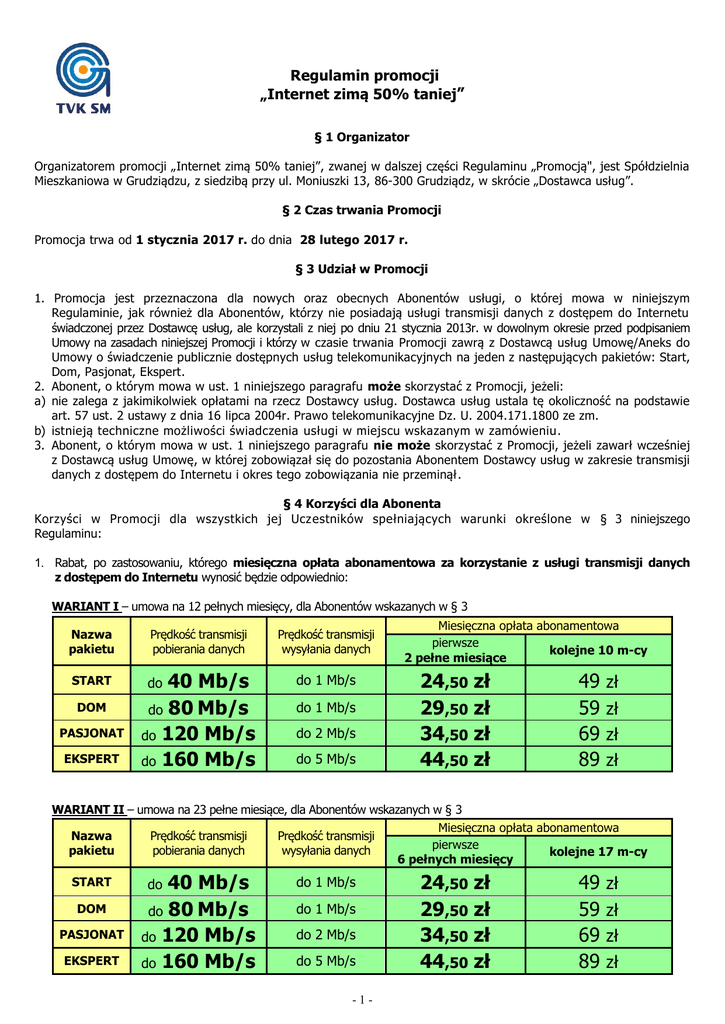 Regulamin promocji „Internet zimą 50% taniej” § 1 Organizator Organizatorem promocji „Internet zimą 50% taniej”, zwanej w dalszej części Regulaminu „Promocją", jest Spółdzielnia Mieszkaniowa w Grudziądzu, z siedzibą przy ul. Moniuszki 13, 86-300 Grudziądz, w skrócie „Dostawca usług”. § 2 Czas trwania Promocji Promocja trwa od 1 stycznia 2017 r. do dnia 28 lutego 2017 r. § 3 Udział w Promocji 1. Promocja jest przeznaczona dla nowych oraz obecnych Abonentów usługi, o której mowa w niniejszym Regulaminie, jak również dla Abonentów, którzy nie posiadają usługi transmisji danych z dostępem do Internetu świadczonej przez Dostawcę usług, ale korzystali z niej po dniu 21 stycznia 2013r. w dowolnym okresie przed podpisaniem Umowy na zasadach niniejszej Promocji i którzy w czasie trwania Promocji zawrą z Dostawcą usług Umowę/Aneks do Umowy o świadczenie publicznie dostępnych usług telekomunikacyjnych na jeden z następujących pakietów: Start, Dom, Pasjonat, Ekspert. 2. Abonent, o którym mowa w ust. 1 niniejszego paragrafu może skorzystać z Promocji, jeżeli: a) nie zalega z jakimikolwiek opłatami na rzecz Dostawcy usług. Dostawca usług ustala tę okoliczność na podstawie art. 57 ust. 2 ustawy z dnia 16 lipca 2004r. Prawo telekomunikacyjne Dz. U. 2004.171.1800 ze zm. b) istnieją techniczne możliwości świadczenia usługi w miejscu wskazanym w zamówieniu. 3. Abonent, o którym mowa w ust. 1 niniejszego paragrafu nie może skorzystać z Promocji, jeżeli zawarł wcześniej z Dostawcą usług Umowę, w której zobowiązał się do pozostania Abonentem Dostawcy usług w zakresie transmisji danych z dostępem do Internetu i okres tego zobowiązania nie przeminął. § 4 Korzyści dla Abonenta Korzyści w Promocji dla wszystkich jej Uczestników spełniających warunki określone w § 3 niniejszego Regulaminu: 1. Rabat, po zastosowaniu, którego miesięczna opłata abonamentowa za korzystanie z usługi transmisji danych z dostępem do Internetu wynosić będzie odpowiednio: WARIANT I – umowa na 12 pełnych miesięcy, dla Abonentów wskazanych w § 3 Nazwa pakietu Prędkość transmisji pobierania danych Prędkość transmisji wysyłania danych START 40 Mb/s do 80 Mb/s do 120 Mb/s do 160 Mb/s do 1 Mb/s DOM PASJONAT EKSPERT do do 1 Mb/s do 2 Mb/s do 5 Mb/s Miesięczna opłata abonamentowa pierwsze kolejne 10 m-cy 2 pełne miesiące 24,50 zł 29,50 zł 34,50 zł 44,50 zł 49 59 69 89 zł zł zł zł WARIANT II – umowa na 23 pełne miesiące, dla Abonentów wskazanych w § 3 Miesięczna opłata abonamentowa Nazwa Prędkość transmisji Prędkość transmisji pierwsze pakietu pobierania danych wysyłania danych kolejne 17 m-cy 6 pełnych miesięcy START DOM PASJONAT EKSPERT 40 Mb/s do 80 Mb/s do 120 Mb/s do 160 Mb/s do do 1 Mb/s do 1 Mb/s do 2 Mb/s do 5 Mb/s -1- 24,50 zł 29,50 zł 34,50 zł 44,50 zł 49 59 69 89 zł zł zł zł WARIANT III – umowa na 36 pełnych miesięcy, dla obecnych Abonentów Internetu oraz dla Abonentów, którzy nie posiadają usługi transmisji danych z dostępem do Internetu świadczonej przez Dostawcę usług, ale korzystali z niej po dniu 21 stycznia 2013r. w dowolnym okresie przed podpisaniem Umowy na zasadach niniejszej Promocji Nazwa pakietu Prędkość transmisji pobierania danych Prędkość transmisji wysyłania danych START 40 Mb/s do 80 Mb/s do 120 Mb/s do 160 Mb/s do 1 Mb/s DOM PASJONAT EKSPERT do do 1 Mb/s do 2 Mb/s do 5 Mb/s Miesięczna opłata abonamentowa pierwsze kolejne 24 m-ce 12 pełnych miesięcy 24,50 zł 29,50 zł 34,50 zł 44,50 zł 49 59 69 89 zł zł zł zł W odniesieniu do nowych Abonentów oraz Abonentów, którzy nie posiadają usługi transmisji danych z dostępem do Internetu świadczonej przez Dostawcę usług, ale korzystali z niej po dniu 21 stycznia 2013r. w dowolnym okresie przed podpisaniem Umowy na zasadach niniejszej Promocji, Dostawca usług nie pobierze opłaty abonamentowej za korzystanie z usługi transmisji danych z dostępem do Internetu w miesiącu zawarcia Umowy, o której mowa w § 3 ust. 1 niniejszego Regulaminu (niezależnie od długości jego trwania). 2. Rabat, po zastosowaniu, którego jednorazowa opłata za przyznanie Abonamentu i aktywację Modemu umożliwiająca podłączenie jednego Terminala abonenckiego wynosić będzie: a) w przypadku wyboru przez Abonenta Wariantu I - 29,90 zł, b) w przypadku wyboru przez Abonenta Wariantu II - 19,90 zł, c) w przypadku wyboru przez Abonenta Wariantu III - 9,90 zł. Od Uczestnika korzystającego z usługi transmisji danych z dostępem do Internetu w momencie podpisywania Umowy, o której mowa w § 3 ust. 1 niniejszego Regulaminu, nie będzie pobierana jednorazowa opłata za przyznanie Abonamentu i aktywację Modemu umożliwiająca podłączenie jednego Terminala abonenckiego. 3. Obniżenie w momencie podpisywania Umowy, o której mowa w § 3 ust. 1 jednorazowej opłaty za zmianę pakietu do wysokości 14,90 zł. §5 Prawa i obowiązki Uczestnika Promocji 1. Warunkiem przyznania korzyści wskazanych w § 4 niniejszego Regulaminu, jest zobowiązanie się Uczestnika Promocji do pozostania Abonentem Operatora w zakresie usługi transmisji danych z dostępem do Internetu w okresie 13 miesięcy kalendarzowych przy wyborze Wariantu I (wliczając w to miesiąc zawarcia Umowy niezależnie od długości jego trwania) lub 24 miesięcy kalendarzowych przy wyborze Wariantu II (wliczając w to miesiąc zawarcia Umowy niezależnie od długości jego trwania) lub 37 miesięcy kalendarzowych przy wyborze Wariantu III (wliczając w to miesiąc zawarcia Umowy niezależnie od długości jego trwania) liczonych od dnia zawarcia Umowy, o której mowa w § 3 ust. 1 z zastrzeżeniem § 5 ust. 6. 2. Warunkiem przyznania korzyści określonych w § 4 niniejszego Regulaminu, jest wyrażenie zgody przez Uczestnika Promocji na otrzymywanie faktur w formie elektronicznej (e-faktur) na adres e-mail określony w Umowie o świadczenie publicznie dostę