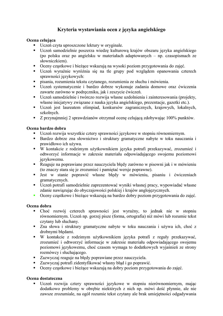 Kryteria wystawiania ocen z języka angielskiego Ocena celująca Uczeń czyta uproszczone lektury w oryginale. Uczeń samodzielnie poszerza wiedzę kulturową krajów obszaru języka angielskiego (po polsku oraz po angielsku w materiałach adaptowanych – np. czasopismach ze słowniczkiem). Oceny cząstkowe i bieżące wskazują na wysoki poziom przygotowania do zajęć. Uczeń wyraźnie wyróżnia się na tle grupy pod wzglądem opanowania czterech sprawności językowych: pisania, rozumienia tekstu czytanego, rozumienia ze słuchu i mówienia. Uczeń systematycznie i bardzo dobrze wykonuje zadania domowe oraz ćwiczenia zawarte zarówno w podręczniku, jak i zeszycie ćwiczeń. Uczeń samodzielnie i twórczo rozwija własne uzdolnienia i zainteresowania (projekty, własne inicjatywy związane z nauka języka angielskiego, prezentacje, gazetki etc.). Uczeń jest laureatem olimpiad, konkursów zagranicznych, krajowych, lokalnych, szkolnych. Z przynajmniej 2 sprawdzianów otrzymał ocenę celującą zdobywając 100% punktów. Ocena bardzo dobra Uczeń rozwija wszystkie cztery sprawności językowe w stopniu równomiernym. Bardzo dobrze zna słownictwo i struktury gramatyczne nabyte w toku nauczania i prawidłowo ich używa. W kontakcie z rodzimym użytkownikiem języka potrafi przekazywać, zrozumieć i odtworzyć informacje w zakresie materiału odpowiadającego swojemu poziomowi językowemu. Reaguje na poprawiane przez nauczyciela błędy zarówno w pisowni jak i w mówieniu (to znaczy stara się je zrozumieć i pamiętać wersje poprawne). Jest w stanie poprawić własne błędy w mówieniu, pisaniu i ćwiczeniach gramatycznych. Uczeń potrafi samodzielnie zaprezentować wyniki własnej pracy, wypowiadać własne zdanie nawiązując do obyczajowości polskiej i krajów anglojęzycznych. Oceny cząstkowe i bieżące wskazują na bardzo dobry poziom przygotowania do zajęć. Ocena dobra Choć rozwój czterech sprawności jest wyraźny, to jednak nie w stopniu równomiernym. Uczeń np. gorzej pisze (forma, ortografia) niż mówi lub rozumie tekst czytany lub słuchany. Zna słowa i struktury gramatyczne nabyte w toku nauczania i używa ich, choć z drobnymi błędami. W kontakcie z rodzimym użytkownikiem języka potrafi z reguły przekazywać, zrozumieć i odtworzyć informacje w zakresie materiału odpowiadającego swojemu poziomowi językowemu, choć czasem wymaga to dodatkowych wyjaśnień ze strony rozmówcy i słuchającego. Zazwyczaj reaguje na błędy poprawiane przez nauczyciela. Zazwyczaj potrafi zidentyfikować własny błąd i go poprawić. Oceny cząstkowe i bieżące wskazują na dobry poziom przygotowania do zajęć. Ocena dostateczna Uczeń rozwija cztery sprawności językowe w stopniu nierównomiernym, mając dodatkowo problemy w obrębie niektórych z nich np. mówi dość płynnie, ale nie zawsze zrozumiale, na ogół rozumie tekst czytany ale brak umiejętności odgadywania znaczeń struktur, fraz lub słownictwa z kontekstu powoduje, że pewne fragmenty są dla niego zupełnie niezrozumiale. Raczej zna struktury gramatyczne i słownictwo nabyte w toku nauczania i używa ich w miarę sprawnie lub zna je dość dobrze, lecz nie używa w mowie i piśmie. W kontakcie z rodzimym użytkownikiem języka stosuje wypowiedzi proste i krótkie oczekując podobnych ze strony rozmówcy. Sporadycznie nie dochodzi jednak do komunikacji. Czasem reaguje na błędy poprawiane przez nauczyciela. Raczej umie poprawić swój błąd, jeżeli jest zasygnalizowany przez nauczyciela. Oceny cząstkowe i bieżące wskazują na dostateczny poziom przygotowania do zajęć. Ocena dopuszczająca Uczeń rozwija cztery sprawności językowe w stopniu ograniczonym, bazując raczej na umiejętnościach nabytych we wcześniejszym stadium nauki. Zna niektóre struktury gramatyczne i słownictwo nabyte w toku nauczania i używa ich, jednak czasami nawiązanie komunikacji jest niemożliwe. W kontakcie z rodzimym użytkownikiem języka stosuje wypowiedzi bardzo proste i krótkie, oczekując podobnych ze strony rozmówcy Rzadko reaguje na błędy poprawiane przez nauczyciela. Raczej nie jest w stanie zidentyfikować własnego błędu. Oceny cząstkowe i bieżące wskazują na niski poziom przygotowania do zajęć i niesystematyczność. Ocena niedostateczna Uczeń nie opanował wiadomości i umiejętności określonych wymaganiami edukacyjnymi na poziomie grupy, w której się znajduje.