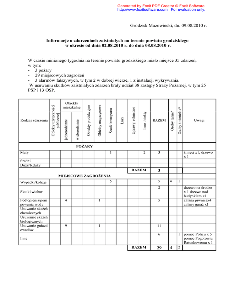 Generated by Foxit PDF Creator © Foxit Software http://www.foxitsoftware.com For evaluation only. Grodzisk Mazowiecki, dn. 09.08.2010 r. Informacje o zdarzeniach zaistniałych na terenie powiatu grodziskiego w okresie od dnia 02.08.2010 r. do dnia 08.08.2010 r. 2 3 RAZEM 3 Osoby śmiertelne* RAZEM Osoby ranne* Inne obiekty Uprawy, rolnictwo Lasy Środki transportu Obiekty magazynowe Obiekty produkcyjne wielorodzinne Obiekty mieszkalne jednorodzinne Rodzaj zdarzenia Obiekty użyteczności publicznej W czasie minionego tygodnia na terenie powiatu grodziskiego miało miejsce 35 zdarzeń, w tym: - 3 pożary - 29 miejscowych zagrożeń - 3 alarmów fałszywych, w tym 2 w dobrej wierze, 1 z instalacji wykrywania. W usuwaniu skutków zaistniałych zdarzeń brały udział 38 zastępy Straży Pożarnej, w tym 25 PSP i 13 OSP. Uwagi POŻARY Mały 1 śmieci x1; drzewo x1 Średni Duży/b.duży Wypadki/kolizje MIEJSCOWE ZAGROŻENIA 5 5 4 2 drzewo na drodze x 1 drzewo nad budynkiem x1 zalana piwnicax4 zalany garaż x1 Skutki wichur Podtopienia/pom powania wody Usuwanie skażeń chemicznych Usuwanie skażeń biologicznych Usuwanie gniazd owadów 4 1 5 9 1 11 6 Inne RAZEM 29 1 4 1 pomoc Policji x 5 pomoc Pogotowiu Ratunkowemu x 1 2 Generated by Foxit PDF Creator © Foxit Software http://www.foxitsoftware.com For evaluation only. Pożary: 07.08.2010r. Kozerki ul. Gen. Orlicz-Dreszera – Pożar samochodu osobowego. Po dojeździe na miejsce zdarzenia stwierdzono pożar na posesji samochodu osobowego marki BMW. Samochód objęty był całkowicie płomieniami. Działania ratowników polegały na podaniu prądu wody na palące się auto. Po ugaszeniu zakręcono zawór gazu butli LPG. Spaleniu uległo całkowicie wnętrze pojazdu oraz część bagażowa. W działaniach ratowniczogaśniczych brał udział 1 zastęp JRG. MZ: 02.08.2010r. Cegłów wypadek samochodu osobowego i ciągnika rolniczego Po przyjeździe zastępu JRG na miejsce zdarzenia stwierdzono, że w pobliżu skrzyżowania dróg na lewym pasie drogi Cegłów-Izdebno Kościelne znajdują się dwa pojazdy (samochód osobowy i ciągnik rolniczy), które zderzyły się czołowo. Przed przybyciem zastępu JRG na miejscu zdarzenia była załoga Pogotowia Ratunkowego, która zabrała poszkodowanego kierowcę z samochodu osobowego marki VW Golf do szpitala. Kierowca ciągnika rolniczego pozostał na miejscu zdarzenia (nie doznał żadnych obrażeń). Działania zastępu JRG polegały na zabezpieczeniu miejsca zdarzenia, odłączeniu akumulatora, zakręceniu zaworu w butli instalacji gazowej LPG w samochodzie osobowym, usunięciu z jezdni wyciekłych z pojazdu osobowego płynów eksploatacyjnych przy użyciu sorbentu oraz zebraniu szkieł i potłuczonych elementów karoserii pojazdu. W wyniku wypadku w samochodzie osobowym został głównie zniszczony przód pojazdu (przedział silnikowy), a w ciągniku rolniczym przednie zawieszenie. W działaniach ratowniczo-gaśniczych brał udział 1 zastęp JRG. 03.08.2010r. Żabia Wola – potrącony pieszy Po przyjeździe na miejsce zdarzenia zastano w obrębie stacji paliw Schell potrąconego przez samochód osobowy przytomnego pieszego mężczyznę. Na miejscu obecne było Pogotowie Ratunkowe oraz Policja. Działania Straży Pożarnej polegały jedynie na zabezpieczeniu miejsca zdarzenia. Potrącony pieszy został zabrany przez zespół Pogotowia Ratunkowego. W działaniach ratowniczo-gaśniczych brał udział 1 zastęp JRG. 05.08.2010r. Grodzisk Maz. ul. Teligi – wypadek drogowy dwóch sam. osobowych Po dojeździe zastępu na miejsce zdarzenia stwierdzono wypadek dwóch samochodów osobowych. Dwie osoby poszkodowane, przytomne znajdowały się pod opieką Pogotowia Ratunkowego. Działania zastępu Straży Pożarnej polegały na zabezpieczeniu miejsca zdarzenia, odłączeniu instalacji elektrycznej w pojazdach, zakręceniu instalacji gazowej w jednym z pojazdów, kierowaniu ruchem drogowym, zebrania płynów eksploatacyjnych za pomocą sorbentu oraz usunięciu drobnych elementów karoserii i szkła z jezdni. W działaniach ratowniczo-gaśniczych brał udział 1 zastęp JRG. 05.08.2010r. Odrano Wola ul. Lazurowa – zabezpieczenie miejsca wybuchu Po dojeździe na miejsce zdarzenia na prośbę patrolu policyjnego z Komendy Powiatowej Policji w Grodzisku Mazowieckim zabezpieczono teren o powierzchni 50m x 50m, na którym znajdowały się rozkawałkowane zwłoki mężczyzny. Prawdopodobnie popełnił samobójstwo poprzez detonację ładunku wybuchowego. W działaniach ratowniczo-gaśniczych brał udział 1 zastęp JRG. 05.08.2010r. Grodzisk Maz. ul. Wileńska – pomoc Policji (podejrzenie ładunku wybuchowego). Po dojeździe zastępu JRG na miejsce zdarzenia zabezpieczono teren akcji poprzez ewakuacje mieszkańców pięciu budynków jednorodzinnych znajdujących się w najbliższym sąsiedztwie Generated by Foxit PDF Creator © Foxit Software http://www.foxitsoftware.com For evaluation only. przeszukiwanego budynku przez pirotechników policyjnych. Na ulicy Wileńskiej Pogotowie Energetyczne z Grodziska Maz. odłączyło dopływ energii elektrycznej. W zabezpieczeniu miejsca zdarzenia brało również udział zastęp z OSP w Książenicach oraz Pogotowie Gazowe z Warszawy. Działania pirotechników zostały zabezpieczone poprzez rozwinięcie dwóch linii gaśniczych oraz czterech ratowników zabezpieczonych sprzętem ochrony dróg oddechowych. Na miejscu zdarzenia obecne było Pogotowie Ratunkowe z Grodziska Maz., Policja (w tym trzy samochody specjalne). W przeszukiwanym budynku pirotechnicy znaleźli materiały wybuchowe, które zostały złożone w samochodzie specjalnym. Następnie samochód specjalny w asyście zastępu z JRG Pruszków, Pogotowia Ratunkowego z Grodziska Mazowieckiego oraz patrolu Policji z Komendy Powiatowej Policji w Grodzisku Mazowieckim odjechał z miejsca zdarzenia do miejscowości Zielonka celem wykonania kontrolowanej detonacji zabezpieczonych materiałów niebezpiecznych. W działaniac