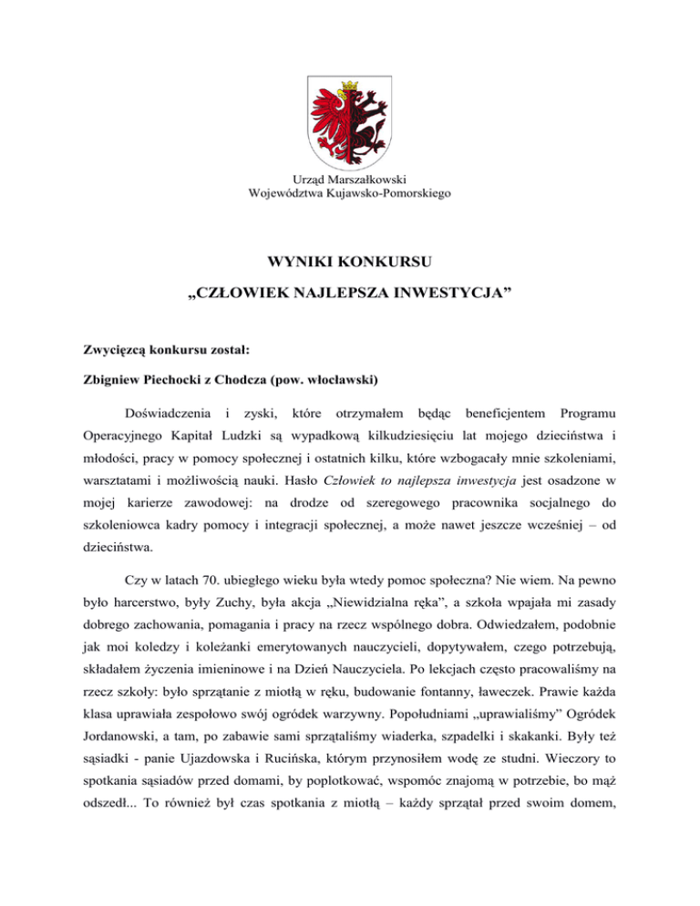 Urząd Marszałkowski Województwa Kujawsko-Pomorskiego WYNIKI KONKURSU „CZŁOWIEK NAJLEPSZA INWESTYCJA” Zwycięzcą konkursu został: Zbigniew Piechocki z Chodcza (pow. włocławski) Doświadczenia i zyski, które otrzymałem będąc beneficjentem Programu Operacyjnego Kapitał Ludzki są wypadkową kilkudziesięciu lat mojego dzieciństwa i młodości, pracy w pomocy społecznej i ostatnich kilku, które wzbogacały mnie szkoleniami, warsztatami i możliwością nauki. Hasło Człowiek to najlepsza inwestycja jest osadzone w mojej karierze zawodowej: na drodze od szeregowego pracownika socjalnego do szkoleniowca kadry pomocy i integracji społecznej, a może nawet jeszcze wcześniej – od dzieciństwa. Czy w latach 70. ubiegłego wieku była wtedy pomoc społeczna? Nie wiem. Na pewno było harcerstwo, były Zuchy, była akcja „Niewidzialna ręka”, a szkoła wpajała mi zasady dobrego zachowania, pomagania i pracy na rzecz wspólnego dobra. Odwiedzałem, podobnie jak moi koledzy i koleżanki emerytowanych nauczycieli, dopytywałem, czego potrzebują, składałem życzenia imieninowe i na Dzień Nauczyciela. Po lekcjach często pracowaliśmy na rzecz szkoły: było sprzątanie z miotłą w ręku, budowanie fontanny, ławeczek. Prawie każda klasa uprawiała zespołowo swój ogródek warzywny. Popołudniami „uprawialiśmy” Ogródek Jordanowski, a tam, po zabawie sami sprzątaliśmy wiaderka, szpadelki i skakanki. Były też sąsiadki - panie Ujazdowska i Rucińska, którym przynosiłem wodę ze studni. Wieczory to spotkania sąsiadów przed domami, by poplotkować, wspomóc znajomą w potrzebie, bo mąż odszedł... To również był czas spotkania z miotłą – każdy sprzątał przed swoim domem, podlewał kwiaty, grabił. My, dzieciaki robiliśmy festiwale piosenki, podchody, bawiliśmy się w „chowanego”, państwa – miasta, klasy, a potem długo siedzieliśmy na rowie, pod rozłożystymi topolami. Chyba najbardziej dumny byłem z tego, że ja – kilkunastolatek mogłem uczestniczyć w życiu starszych kolegów. Pamiętam moją dumę z możliwości przysłuchiwania się ich ważnym, życiowym rozmowom. Wakacje u babci na wsi to wspomnienia zabaw tanecznych, które organizowali sami mieszkańcy: stroili w kwiaty miejsce w pobliskim lasku, sami włączali płyty lub ustawiali przyczepę ciągnika umajoną gałęziami jako scenę dla zespołu. Taki z pozoru inny, nieznany dziś świat: integracja, świadomość odpowiedzialności za siebie i za miejsce, w którym żyję. Prawie dorosłość, to czas dużej aktywności w moim życiu: praca społeczna w Klubie Prasy i Książki Ruch – pięknym obiekcie wybudowanym w czynie społecznym przez naszych rodziców. Tam zdobywaliśmy szlify obywatelskie przygotowując „wieczory poezji miłosnej”, „teatry przy kawie”, wygrywając konkursy wojewódzkie, organizując dyskoteki, dyskutując o filmie obejrzanym na jedynym w okolicy „kolorowym telewizorze”. Wszystko przygotowywaliśmy sami, pod okiem pani Tereni pracującej w naszej namiastce domu kultury. Do tego kuligi, ogniska, sadzenie krzewów, grabienie liści. Przygotowywaliśmy to niewielką, kilkuosobową grupą zapaleńców. Spotkania były dla wszystkich mieszkańców, a imprezy gromadziły tłumy. To była niezwykła satysfakcja i poczucie bycia potrzebnym społecznie. Kilka tygodni po ukończeniu szkoły (czemu technikum chemiczne? nie wiem) nie miałem kłopotu, by wybrać zawód; kiedy ponad 30 lat temu otrzymałem propozycję pracy w pomocy społecznej – decyzję podjąłem niemalże natychmiast. W końcu podrzucona staruszce choinka na Boże Narodzenie, czy przynoszenie wody ze studni zobowiązuje nie tylko „niewidzialną rękę”! Z perspektywy lat, moje pierwsze kroki pomagania to niezwykle amatorskie podejście do wspierania: brak narzędzi i technik, a także specyfika funkcjonowania pomocy społecznej w strukturach służby zdrowia: jedno biurko, trzech pracowników, kontrole Sanepidu. Taki „medyczny” pracownik socjalny w białym fartuchu. Na szczęście - bez pielęgniarskiego czepka. Wówczas pracownikiem pomocy społecznej mógł zostać każdy, a to znaczyło, że każdy pracował tak, jak potrafił, jak czuł, jak umiał, jak mu pokazano... Szlify miało dawać studium zawodowe, już wówczas nazywane - o ironio! „szkółką pracowników socjalnych”. Zmiany nastąpiły rewolucyjnie w 1990 roku; niestety, przemiana nie wyposażyła pracowników socjalnych w wiedzę o narzędziach, metodach, modelach, technikach pomagania. Pojawił się natomiast nowy pracodawca – samorząd terytorialny oraz nowe kategorie wspomaganych i model rozdawnictwa, wyręczania podopiecznych. Niezwykły przełom - po blisko dwudziestu latach – przyniosły środki Europejskiego Funduszu Społecznego. Pozwoliły mi zdobywać warsztat pracy: zdobywać, a nie doskonalić, bo warsztatu, jak pokazywało życie - jeszcze nie miałem. To była dla mnie rewolucja zupełnie nowa jakość i nowa wartość merytoryczna szkoleń. Nawet nie przewidywałem, jak bardzo wpłynie na moje życie zawodowe, na sposób pomagania, na relację z innymi ludźmi, wreszcie - na nabywanie przekonania, że moja intuicja nie jest ani metodą, ani warsztatem. Pierwsze doświadczenia zdobyłem już w 1997 roku w ramach PIW EQUAL. Szkolenie Skuteczny pracownik socjalny” w Instytucie Psychosomatycznym w Warszawie w sposób dynamiczny i nowoczesny pokazało mi, czym powinna być praca socjalna. Pierwsze warsztaty, dyskusje, doświadczanie asertywności, praca w grupie, a nawet – dziś to wiem – elementy superwizji. Tam przyjeżdżali pracownicy socjalni z całej Polski! Absolwenci kilku edycji spotkali się później w Szczyrku, by razem z niesamowitymi, natchnionymi wykładowcami podsumować kilka miesięcy nauki, dowiedzieć się, co nowego przed nami w programowaniu 2007 – 2014. Wielkiego „boomu” nabywania umiejętności doświadczyłem pierwszy raz na szkoleniu „Praca z