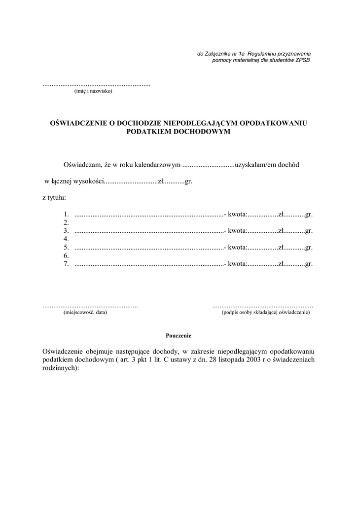 do Załącznika nr 1a Regulaminu przyznawania pomocy materialnej dla studentów ZPSB ............................................................ (imię i nazwisko) OŚWIADCZENIE O DOCHODZIE NIEPODLEGAJĄCYM OPODATKOWANIU PODATKIEM DOCHODOWYM Oświadczam, że w roku kalendarzowym .............................uzyskałam/em dochód w łącznej wysokości..............................zł............gr. z tytułu: 1. 2. 3. 4. 5. 6. 7. ...................................................................................- kwota:.................zł............gr. ...................................................................................- kwota:.................zł............gr. ...................................................................................- kwota:.................zł............gr. ...................................................................................- kwota:.................zł............gr. ..................................................... ........................................................ (miejscowość, data) (podpis osoby składającej oświadczenie) Pouczenie Oświadczenie obejmuje następujące dochody, w zakresie niepodlegającym opodatkowaniu podatkiem dochodowym ( art. 3 pkt 1 lit. C ustawy z dn. 28 listopada 2003 r o świadczeniach rodzinnych):