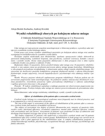 Przegląd Medyczny Uniwersytetu Rzeszowskiego Rzeszów 2006, 4, 265–270 Alicja Bożek-Sochacka, Andrzej Kwolek Wyniki rehabilitacji chorych po kolejnym udarze mózgu Z Oddziału Rehabilitacji Szpitala Wojewódzkiego nr 2 w Rzeszowie Z Instytutu Fizjoterapii Uniwersytetu Rzeszowskiego Ordynator Oddziału: dr hab. med. prof. UR A. Kwolek Udar mózgu jest najczęstszym zespołem neurologicznym w klinicznej praktyce, a przebyty udar mózgu jest czynnikiem ryzyka kolejnego udaru. Celem pracy jest ocena wyników rehabilitacji pacjentów po kolejnym udarze mózgu oraz analiza występujących modyfikowalnych czynników ryzyka udaru. Oceniano stopień niedowładu (test Brunnström), nasilenie spastyczności (skala Ashworth’a), sprawność funkcjonalną, wydolność krążenia, stan psychiczny, czynność zwieraczy, kontakt z otoczeniem i czynniki ryzyka. Oceny stanu pacjentów dokonywano w dniu przyjęcia oraz w dniu wypisu z oddziału (średni czas pobytu w oddziale 25 dni). Badaniami objęto 32 pacjentów, którzy przebyli kolejny udar mózgu oraz 16 pacjentów rehabilitowanych w tym samym czasie po przebytym pierwszym udarze mózgu (grupa kontrolna). Rehabilitację w obu grupach prowadzono uwzględniając w planowaniu opinię całego zespołu rehabilitacyjnego. Dostosowany do możliwości pacjenta kompleksowy program obejmował metody z zakresu kinezyterapii, fizykoterapii, terapii zajęciowej, ćwiczeń logopedycznych i psychoterapii oraz edukację rodziny i pacjenta. Wyniki: Wszyscy pacjenci ukończyli zaplanowany program rehabilitacji. Podczas pobytu nie obserwowano pogorszenia stanu neurologicznego. Na podstawie analizy statystycznej określonych wcześniej parametrów, stwierdzono pozytywny wpływ prowadzonej rehabilitacji w zakresie samoobsługi i ogólnej sprawności fizycznej w obu grupach. Wnioski: W trakcie rehabilitacji szpitalnej u żadnego pacjenta nie obserwowano pogorszenia stanu neurologicznego. Przebyty kolejny udar mózgu nie stanowi przeciwwskazania do prowadzenia rehabilitacji. Słowa kluczowe: udar mózgu wielokrotny, rehabilitacja, wyniki, czynniki ryzyka udaru. Effects of rehabilitation of the patients after a consecutive cerebral stroke Cerebral stroke belongs to a neurological syndromes most frequently met in clinical practice, and is accompanied by a risk of consecutive occurrence. The aim of this paper is assessment of the effects of rehabilitation of the patients after a consecutive cerebral stroke and analysis of modified risk factors. The subject of assessment was degree of paresis (Brunnström test), intensity of spasticity (Ashworth's scale), functional efficiency, circulation competence, mental state, sphincter function, contact with environment and risk factors. Assessments of patients were performed in days of admission and discharge from hospital (average time of stay in hospital was 25 days). The studies comprised 32 patients who underwent a consecutive cerebral stroke and 16 patients rehabilitated after first cerebral stroke (control group). Rehabilitation in both group was carried out in accordance with a plan approved by the rehabilitation team. A complex rehabilitation program included kinesitherapy methods, physiotherapy, occupational therapy, speech therapy, psychotherapy and family education. 265 Results: All patients completed planned rehabilitation program. During stay in hospital no neurological symptoms of deterioration were observed. The statistical analysis of determined parameters has confirmed a positive influence of rehabilitation procedures on self-service and general physical efficiency in both groups of patients. Conclusions: In the course of rehabilitation none of the patients has shown symptoms of neurological deterioration. In case of consecutive cerebral stroke there is no contraindication for administration of rehabilitation Key words: multiple cerebral stroke, rehabilitation, results, risk factors for cerebral stroke nych, które mają tendencję do nawrotów [6, 7, 8]. Kontrola gospodarki lipidowej i węglowodanowej to kolejne 35% czynników ryzyka poddających się leczeniu [1, 7]. Głównym celem profilaktyki pierwotnej jest modyfikacja czynników ryzyka zależnych (nadciśnienie tętnicze, choroby serca, zwężenie tętnicy szyjnej, hiperlipidemie, przejściowe ataki niedokrwienne, mała aktywność fizyczna, palenie tytoniu) oraz rozważenie dodatkowych czynników ryzyka udaru mózgu (migrena; stosowanie doustnych środków antykoncepcyjnych; otyłość; nadużywanie alkoholu; stres; bezdechy podczas snu; nadużywanie substancji nielegalnych, np. kokaina amfetamina; zakażenia, np. Chlamydia pneumoniae, Helicobacter pylori, podwyższone stężenie homocysteiny, przeciwciała fosfolipidowe, niedobory białek S i C, mutacja genu dla czynnika V Leiden) [5]. U chorych po epizodzie udaru mózgu należy skoncentrować się na profilaktyce wtórnej oraz ciągłej, kompleksowej rehabilitacji. Zastosowanie w tej grupie profilaktyki wtórnej (antykoagulanty, polopiryna, tiklopidyna, endarterektomia szyjna w ciężkim objawowym zwężeniu tętnicy szyjnej) może znacznie spowolnić postęp choroby oraz częściowo zabezpieczyć chorego przed ponownym udarem [2, 3, 4, 6]. Celem pracy jest ocena wyników rehabilitacji szpitalnej chorych po kolejnym udarze mózgu hospitalizowanych w oddziale rehabilitacji oraz analiza występujących modyfikowalnych czynników ryzyka udaru. Udary mózgu stanowią jeden z najważniejszych problemów współczesnej medycyny i są najczęstszymi zespołami dotyczącymi ośrodkowego układu nerwowego. Według definicji WHO (1976) udar mózgu to najczęstszy zespół kliniczny charakteryzujący się nagłym wystąpieniem ogniskowego, a czasem również uogólnionego zaburzenia czynności mózgu, bądź prowadzący do śmierci, trwający dłużej niż 24 godziny i niemający innej przyczyny niż naczyniowa [1]. Udar mózgu stanowi poważne zagrożenie dla życia i zdrowia, zajmuje trzecie miejsce wśród przyc