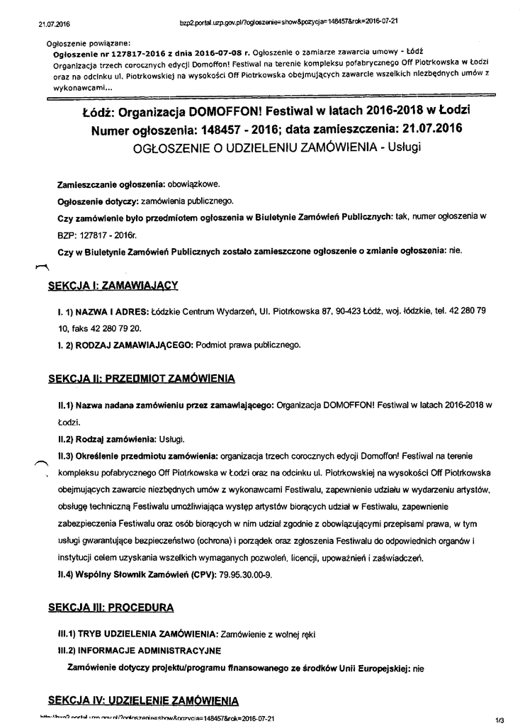 bzp2.portal.uzp.gov.pl/?ogloszenie=show&pozycja=148457&rok=2016-07-21 21.07.2016 Ogłoszenie powiązane; Ogłoszenie nr 127817-2016 z dnia 2016-07-08 r. Ogłoszenie o z a m i a r z e zawarcia umowy - Łódź O r g a n i z a c j a trzech c o r o c z n y c h edycji Domoffon! Festiwai na terenie k o m p l e k s u pofabrycznego Off P i o t r k o w s k a w Łodzi o r a z na o d c i n k u ul. Piotrkowskiej na w y s o k o ś c i Off P i o t r k o w s k a o b e j m u j ą c y c h zawarcie wszelkich n i e z b ę d n y c h umów z wykonawcami... Łódź: Organizacja DOMOFFON! Festiwal w latach 2016-2018 w Łodzi Numer ogłoszenia: 148457 - 2016; data zamieszczenia: 21.07.2016 OGŁOSZENIE O UDZIELENIU ZAMÓWIENIA - Usługi Zamieszczanie ogłoszenia: obowiązkovye. Ogłoszenie dotyczy: zamówienia publicznego. C z y zamówienie było przedmiotem ogłoszenia w Biuietynie Zamówień Pubiicznych: tak, numer ogłoszenia w BZP: 127817-2016r. C z y w Biuietynie Zamówień Pubiicznych zostało zamieszczone ogłoszenie o zmianie ogłoszenia: nie. SEKCJA i: ZAMAWIAJĄCY i. 1) NAZWA I A D R E S : Łódzkie Centrum Wydarzeń, Ul. Piotrkowska 87, 90-423 Łódź, woj. łódzkie, tel. 42 280 79 10, faks 42 280 79 20. I. 2) R O D Z A J ZAMAWiAJĄCEGO: Podmiot prawa publicznego. SEKCJA II: PRZEDMIOT ZAMÓWIENIA 11.1) Nazwa nadana zamówieniu przez zamawiającego: Organizacja DOMOFFON! Festiwal w latach 2016-2018 w Łodzi. 11.2) Rodzaj zamówienia: Usługi. II. 3) Okreśienie przedmiotu zamówienia: organizacja trzech corocznych edycji Domoffon! Festiwal na terenie . kompleksu pofabrycznego Off Piotrkowska w Łodzi oraz na odcinku ul. Piotrkowskiej na wysokości Off Piotrkowska obejmujących zawarcie niezbędnych umów z wykonawcami Festiwalu, zapewnienie udziału w wydarzeniu artystów, obsługę techniczną Festiwalu umożliwiająca występ artystów biorących udział w Festiwalu, zapewnienie zabezpieczenia Festiwalu oraz osób biorących w nim udział zgodnie z obowiązującymi przepisami prawa, w tym usługi gwarantujące bezpieczeństwo (ochrona) i porządek oraz zgłoszenia Festiwalu do odpowiednich organów i instytucji celem uzyskania wszelkich wymaganych pozwoleń, licencji, upoważnień i zaświadczeń. II. 4) Wspólny Słownik Zamówień (CPV): 79.95.30.00-9. S E K C M III: PROCEDURA iil.1) T R Y B U D Z I E L E N I A ZAMÓWIENIA: Zamówienie z wolnej ręki III. 2) I N F O R M A C J E A D M I N I S T R A C Y J N E Zamówienie dotyczy projektu/programu finansowanego ze środków Unii Europejskiej: nie SEKCJA IV: UDZIELENIE ZAMÓWIENIA Ułł„.;/K,„0 , „ „ n^, nl/9nnlr«7oni(>=Rh(TwArXMVCia=148457&rok=2016-07-21 1/3 -2"" tap2.ipcfta(jijzp.gcw.pil/?og(!oszBnie=Silw8fKK IV.1) DATA UDZIELENIA ZAMÓWIENIA: 15.07.2016. IV.2) U C Z B A OTRZYMANYCH OFERT: 1. IV.Ą U C Z B A ODRZUCONYCH OFERT: 0. IV.4) NAZWA I A D R E S WYKONAWCY, KTÓREMU UDZIELONO ZAMÓWIENIA: Wielobranżowa Spółdzielnia Socjalna Ogniwo, ul. Piotrt(.owska 138/140, 90^062 Łódź. ikraj/woj. łódzkie. IV.S)ś«a«ainkowa, wartość zamióiiMenia (bez VAJ): 782926,83 PLN. I V . 6 ) l l ł F 0 R M A C J A O CENIE W Y B R A N E J OFERTY ORAZ O OFERTACH Z NAJNIŻSZĄ I N A J W Y Ż S Z Ą C E N Ą Cena 'wybranej oferty: 360000,'00 Oferta 'Z najniższą ceną: 360000.001 'Ofeirta z najwyższą mną: 360000.00 'Wafuta: P L N ' . ZAtACZNIK I Uzasadnienie udzielenia zaiiinówienia w trybie negocjacji bez ogłoszenia, zamówienia z wolnej ręki albo zapytania o cenę ^ 1. Podstawa prawna ••postępowanie ^prowadzonejest w 'tiybiezamów'ienie z wolnej ręki na ipodstawie ant. 67 ust. 1 pkt 1 lit. ib ustawy Z dria 29 stycznia '2004^ - Prawo zamiówień publicznych. 2. UZiead'ni'enia wyboru trybu Należy ,podać uz^asadnienie faktyczne i prawne wybom trybu oraz, wyjaśnić, dlaczego udzielenie zamówienia jest zgodne z pizepjs,ami. ,'ZS0dtłie, z art. 66 i art,., 67. ust. 1 pkt. 1, lit. b ustawy P,ZP„ Zaim,awia|ący może udzielić zarnwiienia z wolnej ręki. po negocj^acfach ty,lto z jedlnym wykonawcą, jeżeli usługa może być ś'wiadczona tylko pirzez jednego wykonawcę z prz'yczyn ,związ,'anych z 'Ochroną praw wyłącznych, •wy,nik,ających z od,rębnych przepis^ów. Łódzkie Centmm W'ydlai2,eń jest samorządową i,ns,tyt,uc|ą kultury, której o,rgani2,a:torem Jest Miasto Łódź. Do jej poctetawowych 'Z^adań należy ołg'anizowanie pirz',edsięw2ięć ,airtystycznych,, kulturalnych i :rozrywkowych o ^ Charakterze lokalnym, krajowym i międzynarodowym', w tymi ikraiowych i miiędzynarodowych f'estiw,ali i pez60gfićm, spektakli, koncertów, wystaw, warsztatów, k^onferencji, cyklicznych •wydairze',ń miejskich, jlak również wspierarie realfeacji i promocji wyd^aizeń kulturalnych oiganizowanych na terenie Łodzi. ,Jednym z celów realizowanych prz^ez Łódz,k,ie Cenl',mm Wydarzeń |'est promocja mii,asła Łodzi w kraju i ,z„agirainicą popifZ'ez organizację i wspieranie organfz,acji wydarzeń ,artystycz,nych i kulturalnych oraz, innych 'walorów miasta Łodzi. MliąC'' ,na uwadz',e ,koniecz,nośćre,al'iz,'acjiipowyższych celów i zadań. Łódzkie C'entiajimi Wy'daEeń udzielito zamówienia ,na oiganiz^ację Festiw,alu DO'MOFFON! 'W latach 2016-2018 w Łodzi '(3 edy'C|e). Wykona,wca, WMIdbranłowa Spółdż,jelna Socjalna Ogn,i''W'0,, 'wpisana do rejest,m prz<edsi'ęhiorców prowadzonego prz,ez 'Sąd Rejonowy dla Łodżi-Siódmieścia w Łodzi ,XX' 'W'ydz,i,al GoS;pod'arc'zy Kraiow'ego Rejestiru Sądowego pod numerem '0000399091, jest, pomysłodawcą F'estiw,alu DOMOFFON! 'w Łodzi, który |'es,t |'ej projektemi autoirskim'., Konoepcja 'festiwalu, S'tW''Oirzona p,rz',ez', wykonawcę, podlega ochronie na m'Ocy prz'epi,sów odirębnych. Fes!i'w,ail będzie realiżow,any' zgodnie z program'em opracowanym prz,ez, 'wykonawcę, do którego Zigodnie z, ustawą z 'dnia 4 imefO f994' r. o prawie autorskim' I praw,ach pokrewnych, pr2'y,sluguj,ą wyłączne prawa, ,aul','Oirsk,ie miajątkowe. 21.07.2016 bzp2.portal.uzp.gov.pl/?ogl