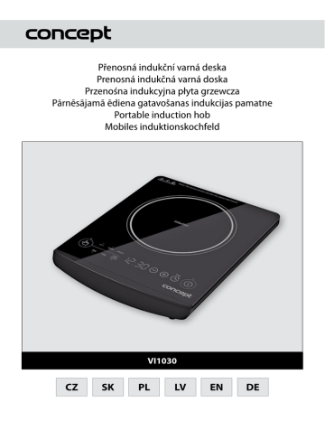 Přenosná indukční varná deska Prenosná indukčná varná doska Przenośna indukcyjna płyta grzewcza Pārnēsājamā ēdiena gatavošanas indukcijas pamatne Portable induction hob Mobiles induktionskochfeld VI1030 CZ SK PL LV EN DE CZ PODĚKOVÁNÍ Děkujeme Vám, že jste si zakoupili výrobek značky Concept a přejeme Vám, abyste byli s naším výrobkem spokojeni po celou dobu jeho používání. Před prvním použitím prostudujte pozorně celý návod k obsluze a potom si jej uschovejte. Zajistěte, aby i ostatní osoby, které budou s výrobkem manipulovat, byly seznámeny s tímto návodem. Co znamená vaření s indukcí? Vaření s indukcí je založené na zcela odlišném principu než obvyklé způsoby ohřevu. Teplo se indukcí vytváří přímo ve varné nádobě, přičemž varná zóna zůstává studená. Ve srovnání s jinými metodami ohřevu má tento způsob řadu výhod: 1. Úspora času při vaření a pečení Neohřívá se sklokeramická deska, ale přímo varná nádoba. Nedochází k velkým tepelným ztrátám a účinnost je tedy vyšší než při jiných metodách ohřevu. 2. Úspora energie Je prokázáno, že při vaření s indukcí se spotřebuje méně elektrické energie než při jiných metodách vaření. 3. Kontrolovaný přívod tepla a více bezpečnosti Varná deska předává teplo nebo přerušuje jeho přívod bezprostředně po nastavení výkonu. Jakmile varnou nádobu sejmete z varné desky, ohřev se přeruší, aniž byste varnou zónu předem vypínali. Po ukončení vaření je na sklokeramické desce jen zbytkové teplo z varné nádoby. Přesto nedoporučujeme ponechávat na desce jakékoliv předměty bez dozoru. Pozn.: Aby se zamezilo nechtěnému ohřevu, např. při položení kovových nástrojů na desku, systém se aktivuje až při určité velikosti dna nádobí. POZOR! Tento spotřebič odpovídá směrnici o bezpečnosti a elektromagnetické kompatibilitě, přesto by se neměly v dosahu spotřebiče pohybovat osoby s kardiostimulátorem. K nesprávné funkci by mohlo docházet také u dalších přístrojů, jako jsou např. naslouchátka. Pokud je spotřebič zapnutý, nepřibližujte k němu magneticky citlivé předměty (diskety, kreditní karty, magnetofonové pásky apod.). Technické parametry Napětí Max. příkon Průměr varné zóny Průměr použitelného nádobí Hmotnost Hlučnost ventilátoru 220-240 V ~ 50 Hz 2000 W 200 mm 120 – 260 mm 1,65 kg < 60 dB(A) Výrobce si vyhrazuje právo na případné technické změny, tiskové chyby a odlišnosti ve vyobrazení bez předchozího upozornění. VI1030 1 CZ DŮLEŽITÁ UPOZORNĚNÍ: • Nepoužívejte spotřebič jinak, než je popsáno v tomto návodu. • Před prvním použitím odstraňte ze spotřebiče všechny obaly a marketingové materiály. • Ověřte, zda připojované napětí odpovídá hodnotám na typovém štítku spotřebiče. Používejte pouze zásuvky elektrického napětí s ochranným kolíkem. • Nezapojujte spotřebič do rozbočovacích zásuvek a prodlužovacích přívodů. • Nenechávejte spotřebič bez dozoru, pokud je zapnutý, popřípadě zapojený do zásuvky elektrického napětí. • Spotřebič umístěte pouze na stabilní a tepelně odolný povrch stranou od jiných zdrojů tepla. • Nezakrývejte spotřebič, hrozí nebezpečí přehřátí. • Na okraj sklokeramické varné desky nic nepokládejte. • Spotřebič nesmí být umístěn přímo před nebo pod elektrickou zásuvkou. • Varná nádoba na zapnuté varné zóně musí obsahovat tekutinu nebo pokrm. • Nepřenášejte spotřebič zapnutý, horký nebo s horkým pokrmem. • Nedotýkejte se horkého povrchu. Používejte držadla a ovládací tlačítka. Pokud manipulujete s horkými nádobami, používejte kuchyňské rukavice (chňapky). • Dodržujte bezpečnou vzdálenost spotřebiče, minimálně 20 cm od hořlavých materiálů, jako je nábytek, záclony, závěsy, přikrývky, papír, oblečení apod. • Udržujte spotřebič v čistotě, nedovolte, aby cizí tělesa pronikla do otvorů mřížek. Mohla by způsobit zkrat, poškodit spotřebič nebo způsobit požár. • Odpojte spotřebič ze zásuvky elektrického napětí, není-li používán. • Při vypojování spotřebiče ze zásuvky elektrického napětí nikdy netahejte za přívodní kabel, ale uchopte zástrčku a tahem ji vypojte. • Nedovolte dětem a nesvéprávným osobám se spotřebičem manipulovat, používejte ho mimo jejich dosahu. • Osoby se sníženou pohybovou schopností, se sníženým smyslovým vnímáním, s nedostatečnou duševní způsobilostí nebo osoby neseznámené s obsluhou musí používat spotřebič jen pod dozorem zodpovědné seznámené osoby. • Dbejte zvýšené opatrnosti, pokud je spotřebič používán v blízkosti dětí. • Nedovolte, aby byl spotřebič používán jako hračka. • Zabraňte tomu, aby přívodní kabel volně visel přes hranu pracovní desky, kde by na něho mohly dosáhnout děti. • Nepoužívejte spotřebič ve venkovním prostředí nebo na mokrém povrchu, hrozí nebezpečí úrazu elektrickým proudem. • Nepoužívejte spotřebič s poškozeným přívodním kabelem či zástrčkou, nechte závadu neprodleně odstranit autorizovaným servisním střediskem. • Nepoužívejte jiné příslušenství, než je doporučeno výrobcem. • Nepoužívejte varné nádobí a příslušenství, které má poškozenou povrchovou úpravu, je opotřebované, případně má jiné defekty. • Netahejte a nepřenášejte spotřebič za přívodní kabel. • Držte spotřebič stranou od zdrojů tepla, jako jsou radiátory, trouby a podobně. Chraňte jej před přímým slunečním zářením, vlhkostí. • Nesahejte na spotřebič vlhkýma nebo mokrýma rukama. • V průběhu vaření se mohou pokrmy, jako polévky, omáčky nebo nápoje zahřát a velmi rychle přetéci. Proto doporučujeme vař