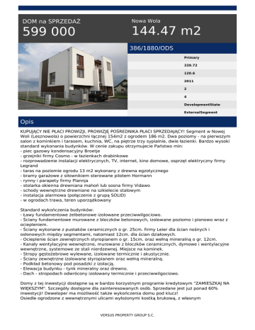 DOM na SPRZEDAŻ 599 000 Nowa Wola 144.47 m2 386/1880/ODS Primary 339.72 120.6 2011 2 4 DevelopmentState ExternalSegment Opis KUPUJĄCY NIE PŁACI PROWIZJI, PROWIZJĘ POŚREDNIKA PŁACI SPRZEDAJĄCY! Segment w Nowej Woli (Lesznowola) o powierzchni łącznej 154m2 z ogrodem 186 m2. Dwa poziomy - na pierwszym salon z kominkiem i tarasem, kuchnia, WC, na piętrze trzy sypialnie, dwie łazienki. Bardzo wysoki standard wykonania budynków. W cenie zakupu otrzymujecie Państwo min: - piec gazowy kondensacyjny Broetje - grzejniki firmy Cosmo - w łazienkach drabinkowe - rozprowadzenie instalacji elektrycznych, TV, internet, kino domowe, osprzęt elektryczny firmy Legrand - taras na poziomie ogrodu 13 m2 wykonany z drewna egzotycznego - bramy garażowe z siłownikiem sterowane pilotem Hormann - rynny i parapety firmy Plannja - stolarka okienna drewniana mahoń lub sosna firmy Vidawo - schody wewnętrzne drewniane na szkielecie stalowym - instalacja alarmowa (połączenie z grupą SOLID) - w ogrodach trawa, teren uporządkowany Standard wykończenia budynków: - Ławy fundamentowe żelbetonowe izolowane przeciwwilgociowo. - Ściany fundamentowe murowane z bloczków betonowych, izolowane poziomo i pionowo wraz z ociepleniem. - Ściany wykonane z pustaków ceramicznych o gr. 25cm. firmy Leier dla ścian nośnych i osłonowych między segmentami, natomiast 12cm. dla ścian działowych. - Ocieplenie ścian zewnętrznych styropianem o gr. 15cm. oraz wełną mineralną o gr. 12cm. - Kanały wentylacyjne wewnętrzne, murowane z bloczków ceramicznych, dymowe i wentylacyjne wewnętrzne, systemowe ze stali nierdzewnej. Miejsce na kominek. - Stropy gęstożebrowe wylewane, izolowane termicznie i akustycznie. - Ściany zewnętrzne izolowane styropianem oraz wełną mineralną. - Podkład betonowy pod posadzki z izolacją. - Elewacja budynku - tynk mineralny oraz drewno. - Dach - stropodach odwrócony izolowany termicznie i przeciwwilgociowo. Domy z tej inwestycji dostępne są w bardzo korzystnym programie kredytowym "ZAMIESZKAJ NA WIĘKSZYM". Szczegóły dostępne dla zainteresowanych osób. Sprzedane jest już ponad 60% inwestycji! Deweloper ma możliwość także wykończenia domu pod klucz! Osiedle ogrodzone z wewnętrznymi ulicami wyłożonymi kostką brukową, z własnym VERSUS PROPERTY GROUP S.C. automatycznym oświetleniem ulic. Zainstalowany system monitoringu połączony z agencją ochrony mienia. W niedalekiej odległości sklepy, szkoły, przedszkola, centra handlowe. Okolica zapewnia spokój, nie ma możliwości, aby nagle wyrosły nowe wysokie budynki w bezpośrednim sąsiedztwie. Duży atut - bliskość trasy S7 - zapewni doskonałe połączenie z Warszawą. W ofercie naszego biura także inne segmenty z tej inwestycji. Zapraszamy do kontaktu telefonicznego lub mailowego. Zapraszamy do naszego biura w Piasecznie, ul. Pomorska 22. Nasi pracownicy są do Państwa dyspozycji od 10:00 do 18:00 (pon-pt), w sobotę od 10:00 do 13:00. Kontakt telefoniczny w sprawie ofert codziennie od godziny 8:00 do 22:00 tel. 664 476 532 W celu zapoznania się z naszą pełną ofertą nieruchomości zapraszamy na naszą stronę www.versusgroup.pl Niniejsze ogłoszenie nie stanowi oferty w rozumieniu przepisów Kodeksu Cywilnego oraz innych właściwych przepisów prawnych, a dane w niej zawarte mają jedynie charakter informacyjny. Marta Tempińska tel. 881 910 278 email: [email protected] VERSUS PROPERTY GROUP S.C. Powered by TCPDF (www.tcpdf.org)