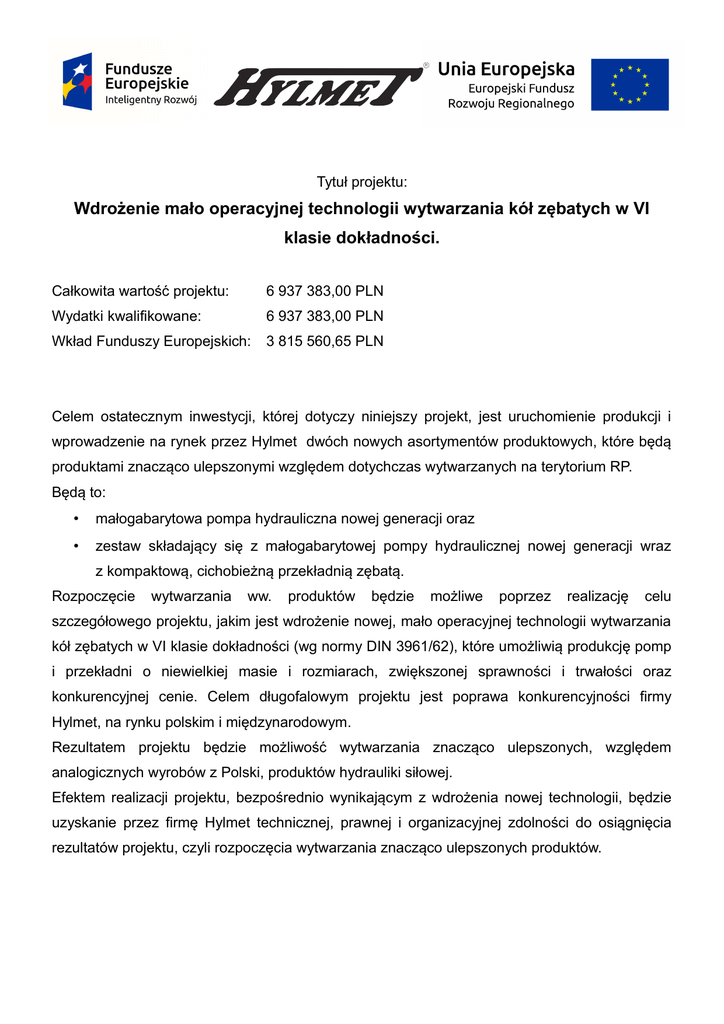 Tytuł projektu: Wdrożenie mało operacyjnej technologii wytwarzania kół zębatych w VI klasie dokładności. Całkowita wartość projektu: 6 937 383,00 PLN Wydatki kwalifikowane: 6 937 383,00 PLN Wkład Funduszy Europejskich: 3 815 560,65 PLN Celem ostatecznym inwestycji, której dotyczy niniejszy projekt, jest uruchomienie produkcji i wprowadzenie na rynek przez Hylmet dwóch nowych asortymentów produktowych, które będą produktami znacząco ulepszonymi względem dotychczas wytwarzanych na terytorium RP. Będą to: • małogabarytowa pompa hydrauliczna nowej generacji oraz • zestaw składający się z małogabarytowej pompy hydraulicznej nowej generacji wraz z kompaktową, cichobieżną przekładnią zębatą. Rozpoczęcie wytwarzania ww. produktów będzie możliwe poprzez realizację celu szczegółowego projektu, jakim jest wdrożenie nowej, mało operacyjnej technologii wytwarzania kół zębatych w VI klasie dokładności (wg normy DIN 3961/62), które umożliwią produkcję pomp i przekładni o niewielkiej masie i rozmiarach, zwiększonej sprawności i trwałości oraz konkurencyjnej cenie. Celem długofalowym projektu jest poprawa konkurencyjności firmy Hylmet, na rynku polskim i międzynarodowym. Rezultatem projektu będzie możliwość wytwarzania znacząco ulepszonych, względem analogicznych wyrobów z Polski, produktów hydrauliki siłowej. Efektem realizacji projektu, bezpośrednio wynikającym z wdrożenia nowej technologii, będzie uzyskanie przez firmę Hylmet technicznej, prawnej i organizacyjnej zdolności do osiągnięcia rezultatów projektu, czyli rozpoczęcia wytwarzania znacząco ulepszonych produktów.