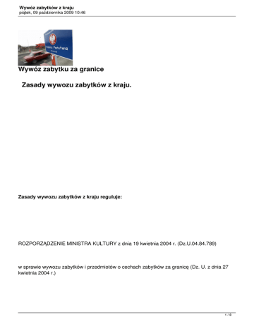 Wywóz zabytków z kraju piątek, 09 października 2009 10:46 Wywóz zabytku za granice Zasady wywozu zabytków z kraju. Zasady wywozu zabytków z kraju reguluje: ROZPORZĄDZENIE MINISTRA KULTURY z dnia 19 kwietnia 2004 r. (Dz.U.04.84.789) w sprawie wywozu zabytków i przedmiotów o cechach zabytków za granicę (Dz. U. z dnia 27 kwietnia 2004 r.) 1/8 Wywóz zabytków z kraju piątek, 09 października 2009 10:46 Przepisy rozporządzenia stosuje się do wywozu zabytków z terytorium Rzeczypospolitej Polskiej na terytorium innego państwa członkowskiego Unii Europejskiej. Rozporządzenie określa tryb składania wniosków i wydawania: - jednorazowego pozwolenia na stały wywóz zabytku za granicę; - jednorazowego pozwolenia na czasowy wywóz zabytku za granicę; - wielokrotnego pozwolenia indywidualnego na czasowy wywóz zabytku za granicę; - wielokrotnego pozwolenia ogólnego na czasowy wywóz zabytku za granicę; - zaświadczeń w odniesieniu do zabytków i przedmiotów o cechach zabytków niewymagających pozwolenia. Przepisy rozporządzenia stosuje się do wywozu zabytków z terytorium Rzeczypospolitej Polskiej na terytorium innego państwa członkowskiego Unii Europejskiej. Zgodnie z art. 6 ust. 1 pkt 2 lit. c w zw. z art. 3 pkt 1 ustawy o ochronie zabytków i opiece nad zabytkami Art. 51. 1. Zabytki mogą być wywożone za granicę na stałe, jeżeli ich wywóz nie spowoduje uszczerbku dla dziedzictwa kulturowego. 2. Zabytki mogą być czasowo wywożone za granicę, jeżeli pozwala na to ich stan zachowania, a osoba fizyczna lub jednostka organizacyjna, w której posiadaniu znajduje się zabytek, daje rękojmię, że nie ulegnie on zniszczeniu lub uszkodzeniu i zostanie przywieziony do kraju przed upływem terminu ważności pozwolenia. 2/8 Wywóz zabytków z kraju piątek, 09 października 2009 10:46 3. Wywóz zabytków za granicę może nastąpić na podstawie: 1. 2. 3. 4. jednorazowego pozwolenia na stały wywóz zabytku za granicę; jednorazowego pozwolenia na czasowy wywóz zabytku za granicę; wielokrotnego pozwolenia indywidualnego na czasowy wywóz zabytku za granicę; wielokrotnego pozwolenia ogólnego na czasowy wywóz zabytków za granicę. Art. 52. 1. Jednorazowe pozwolenie na stały wywóz zabytku za granicę wydaje minister właściwy do spraw kultury i ochrony dziedzictwa narodowego, po zasięgnięciu opinii komisji złożonej ze specjalistów w określonych dziedzinach ochrony zabytków i opieki nad zabytkami. 2. Osoba fizyczna lub jednostka organizacyjna, w której posiadaniu znajduje się zabytek, składa wniosek o wydanie jednorazowego pozwolenia na stały wywóz zabytku za granicę, za pośrednictwem wojewódzkiego konserwatora zabytków. 3. Jeżeli wywóz przedmiotu nie wymaga jednorazowego pozwolenia na stały wywóz za granicę, wojewódzki konserwator zabytków wydaje zaświadczenie, o którym mowa w art. 59 ust. 3. 4. Wywóz zabytku za granicę na podstawie pozwolenia, o którym mowa w ust. 1, może nastąpić nie później niż w terminie 12 miesięcy od dnia wydania tego pozwolenia. Art. 53. 1. Jednorazowe pozwolenie na czasowy wywóz zabytku za granicę wydaje wojewódzki konserwator zabytków na wniosek osoby fizycznej lub jednostki organizacyjnej, w której posiadaniu znajduje się zabytek, mającej zamiar jednorazowo wywieźć za granicę ten zabytek w celach użytkowych lub wystawienniczych albo dla przeprowadzenia prac konserwatorskich. 2. Termin ważności pozwolenia, o którym mowa w ust. 1, nie może być dłuższy niż 3 lata od dnia wydania tego pozwolenia 3/8 Wywóz zabytków z kraju piątek, 09 października 2009 10:46 Wywóz zabytku za granice Ustawa o ochronie zabytków - komentarz Ustawa z dnia 23 lipca o ochronie zabytków i opiece nad zabytkami Art. 3 cytowanej ustawy w pkt 1 i pkt 3 definiuje sformułowania zabytek i zabytek ruchomy: - pkt 1 zabytek - nieruchomość lub rzecz ruchoma, ich części lub zespoły, będące dziełem człowieka lub związane z jego działalnością i stanowiące świadectwo minionej epoki bądź zdarzenia, których zachowanie leży w interesie społecznym ze względu na posiadaną wartość historyczną, artystyczną lub naukową; - pkt 3 zabytek ruchomy - rzecz ruchomą, jej część lub zespół rzeczy ruchomych, o których mowa w pkt 1. Doprecyzowanie obiektów stanowiących przedmiot ochrony ma miejsce w Art. 6 pkt 2. Art. 6.1. Ochronie i opiece podlegają, bez względu na stan zachowania: - pkt 2 zabytki ruchome będące, w szczególności: a) dziełami sztuk plastycznych, rzemiosła artystycznego i sztuki użytkowej, b) kolekcjami stanowiącymi zbiory przedmiotów zgromadzonych i uporządkowanych według koncepcji osób, które tworzyły te kolekcje, 4/8 Wywóz zabytków z kraju piątek, 09 października 2009 10:46 c) numizmatami oraz pamiątkami historycznymi, a zwłaszcza militariami, sztandarami, pieczęciami, odznakami i orderami, d) wytworami techniki, a zwłaszcza urządzeniami, środkami transportu oraz maszynami i narzędziami świadczącymi o kulturze materialnej, charakterystycznymi dla dawnych i nowych form gospodarki, dokumentującymi poziom nauki i rozwoju cywilizacyjnego, e) materiałami bibliotecznymi, o których mowa w art. 5 ustawy z dnia 27 czerwca 1997 r. o bibliotekach (Dz. U. Nr 85, poz.539, z 1998 r. Nr 106, poz.668, z 2001 r Nr 129, poz. 1440 oraz z 2002 r. Nr 113, poz. 984) f) instrumentami muzycznymi, g) wytworami sztuki ludowej i rękodzieła oraz innymi obiektami etnograficznymi, h) przedmiotami upamiętniającymi wydarzenia historyczne bądź działalność wybitnych osobistości lub instytucji; Art. 51 pkt 1- "Zabytki mogą być wywożone za granicę na stałe, jeżeli ich wywóz nie spowoduje uszczerbku dla dziedzictwa kulturowego" - Organem uprawnionym do wydania jednorazowego pozwolenia na stały wywóz zabytku za granicę jest minister właściwy do spraw kultury i ochrony dziedzictwa narodowego. Zgodę wydaje po zasięgnięciu opinii komisji złożonej ze specjalistó