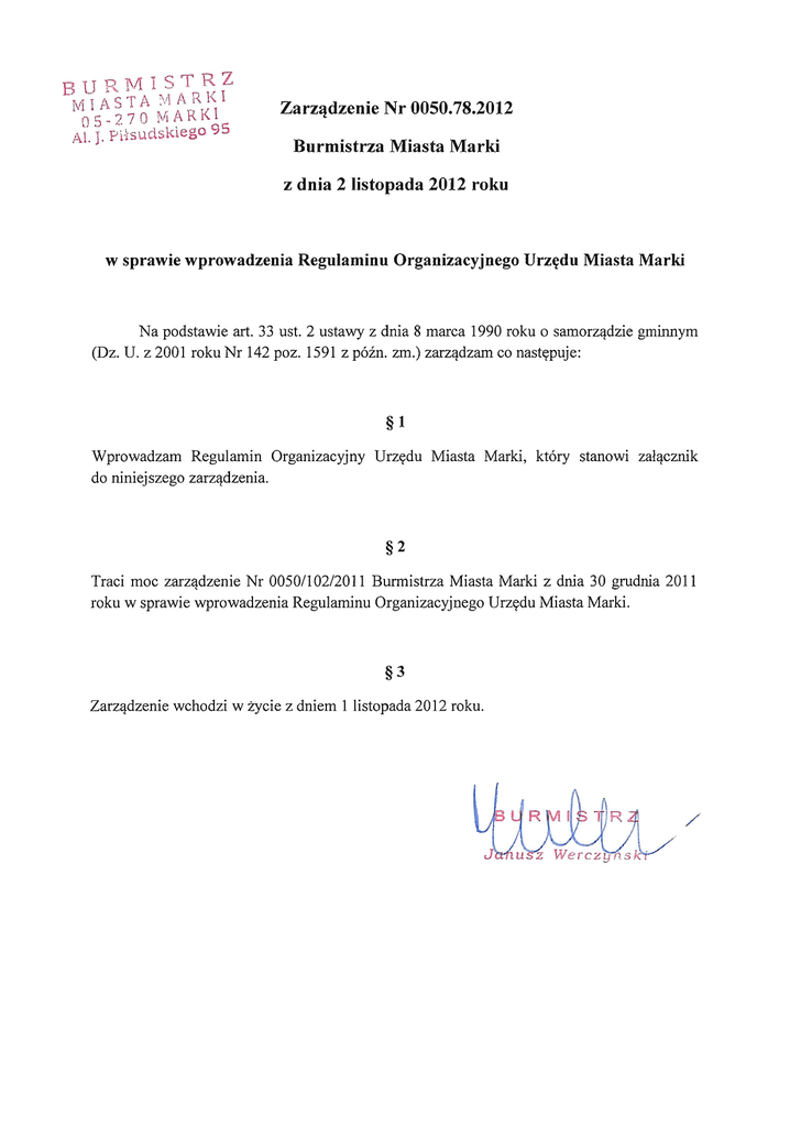 BU RiVl 1S T R Z M IASTA ~/I A R K I 05-270 M~RK I At. J. PHsu d skleg o 95 Zarzadzenie Nr 0050.78.2012 Burmistrza Miasta Marki z dnia 2 listopada 2012 roku w sprawie wprowadzenia Regulaminu Organizacyjnego Urzedu Miasta Marki Na podstawie art. 33 ust. 2 ustawy z dnia 8 marca 1990 roku 0 samorzadzie gminnym (Dz. U. z 2001 roku Nr 142 poz. 1591 z pozn. zm.) zarzadzam co nastepuje: §1 Wprowadzam Regulamin Organizacyjny Urzedu Miasta Marki, kt6ry stanowi zalacznik do niniejszego zarzadzenia. §2 Traci moe zarzadzenie Nr 0050/10212011 Burmistrza Miasta Marki z dnia 30 grudnia 2011 roku w sprawie wprowadzenia Regulaminu Organizacyjnego Urzedu Miasta Marki. §3 Zarzadzenie wchodzi w zycie z dniem 1 listopada 2012 roku. / BURi\ll I S TRZ M I AS T A M A R K I 05·27 0 MAR KI Zal. do Zarzqdzenia Nr 005017812012 Burmistrza Miasta Marki z dnia 2 listopada 2012 roku i\1. 1· P Hsudskieg o 9 5 Regulamin Organizacyjny Urzedu Miasta Marki Rozdzial I Postanowienia og61ne §1 Regulamin okresla zakres dzialania, zadania, organizacje i zasady funkcjonowania poszczeg6lnych wydzialow i innych kom6rek organizacyjnych Urzedu Miasta Marki. §2 1. Urzad jest jednostka budzetowa gminy. 2. Urzad jest pracodawca dla zatrudnionych w nim pracownik6w. 3. Urzad ma siedzibe w Markach przy AI. Marsz. J6zefa Pilsudskiego 95. 4. Terenem dzialania urzedu jest miasto Marki. §3 Czas pracy urzedu reguluje Regulamin Pracy. Rozdzial II Zakres dzialania i zadania Urzedu §4 1. Urzad jest aparatem pomocniczym burmistrza. 2. Do zakresu dzialania urzedu nalezy zapewnienie warunk6w nalezytego wykonywania zadan spoczywajacych na gminie, a w szczegolnosci: 1) zadan wlasnych, 2) zadan zleconych z zakresu administracji rzadowej, 3) zadan zwiazanych z organizacja przygotowan i przeprowadzaniem wybor6w powszechnych i referend6w, 4) zadan z zakresu wlasciwosci powiatu oraz zadan z zakresu wlasciwosci wojew6dztwa na podstawie porozumien z tymi jednostkami, 5) innych zadan publicznych wykonywanych w ramach zawartych um6w. 1 §5 Do zadan urzedu nalezy w szczegolnosci: 1) zalatwianie indywidualnych spraw obywateli, 2) przygotowywanie materialow niezbednych do podejmowania uchwal, zarzadzen, wydawania decyzji, postanowien i innych akt6w z zakresu administracji publicznej oraz podejmowania innych czynnosci prawnych przez organy gminy, 3) wykonywanie czynnosci faktycznych wchodzacych w zakres zadan gminy, 4) zapewnienie organom gminy mozliwosci przyjmowania, rozpatrywania oraz zalatwiania skarg i wniosk6w, 5) wykonywanie budzetu gminy, 6) zapewnienie warunk6w organizacyjnych do odbywania sesji rady i posiedzen jej komisji, 7) prowadzenie zbioru przepis6w gminnych dostepnego do powszechnego wgladu w siedzibie urzedu, 8) wykonywanie prac kancelaryjnych zgodnie z obowiazujaca Instrukcja Kancelaryjna, w tym: a) przyjmowanie, ewidencjonowanie, rozdzial, przekazywanie i wysylanie korespondencji, b) prowadzenie wewnetrznego obiegu akt, c) przechowywanie akt, d) przekazywanie akt do archiw6w, 9) realizacja obowiazkow i uprawnien sluzacych urzedowi jako pracodawcy zgodnie z obowiazujacymi przepisami prawa pracy. Rozdzial III Organizacja urzedu §6 1. W sklad struktury organizacyjnej urzedu wchodza wydzialy i stanowiska samodzielne, zwane dalej kom6rkami organizacyjnymi. 2. Wydzialami kieruja naczelnicy. 3. Burmistrz w drodze zarzadzenia moze utworzyc stanowisko zastepcy naczelnika wydzialu. 4. Strukture organizacyjna urzedu odzwierciedla schemat organizacyjny uwzgledniajacy obowiazujace podporzadkowanie sluzbowe, kt6ry jako zalacznik stanowi integralna czesc regulaminu. 5. Zastepca burmistrza, sekretarz i skarbnik nadzoruja prace kom6rek organizacyjnych podlegajacych im zgodnie ze schematem organizacyjnym. §7 1. W sklad urzedu wchodza nastepujace kom6rki organizacyjne: 1) Burmistrz - sygnatura BM, 2) Zastepca Burmistrza - sygnatura ZB, 3) Skarbnik - sygnatura SK, 4) Sekretarz - sygnatura SE, 5) WydzialOrganizacyjny - sygnatura we, 6) Wydzial Prawny - sygnatura WP, 7) Wydzial Finansowo - Budzetowy - sygnatura WFB, 2 8) Wydzial Infrastruktury - sygnatura WI, 9) Wydzial Teleinformatyki - sygnatura WTI, 10) Wydzial Gospodarki Nieruchomosciami i Planowania Przestrzennego - sygnatura WGN, 11) Wydzial Spraw Obywatelskich - sygnatura WSO, 12) Wydzial Ochrony Srodowiska i Gospodarki Wodnej - sygnatura WOS, 13) Wydzial Spraw Spolecznych - sygnatura WS, 14) Biuro Rady Miasta - sygnatura BRM, 15) Wydzial Monitoringu, Zarzadzania Kryzysowego i Obronnosci- sygnatura MZK, 16) Pelnomocnik ds. ochrony informacji niejawnych - sygnatura OIN, 17) Pelnomocnik ds. profilaktyki i rozwiazywania problem6w alkoholowych - sygnatura SPA 18) Samodzielne stanowisko - Glowny specjalista ds. kontroli wewnetrznej - sygnatura KW, 19) Samodzielne stanowisko - Audytor wewnetrzny - sygnatura AW, 20) Samodzielne stanowisko ds. BHP - sygnatura BHP 2. Kom6rki organizacyjne urzedu przy zalatwianiu spraw oznaczaja pisma i decyzje wlasciwyrni sobie sygnaturami, wskazanymi w ust. 1. Rozdzial IV Zasady funkcjonowania urzedu §8 Urzad dziala w oparciu 0 nastepujace zasady : 1) praworzadnosci, 2) sluzebnosci wobec spolecznosci lokalnej, 3) racjonalnej gospodarnosci, 4) jednoosobowego kierownictwa, 5) kontroli wewnetrznej, 6) podzialu zadan, 7) wspoldzialania, 8) sprawnosci i szybkosci dzialania. §9 1. Gospodarowanie srodkami gminy odbywa sie w spos6b racjonalny, celowy i oszczedny z uwzglednieniem szczeg61nej starannosci. 2. Zakupy i inwestycje dokonywane sa po wyborze najkorzystniejszej oferty, zgodnie z przepisami ustawy Prawo zamowien publicznych i Regulaminem udzielania zamowien publicznych oraz kontroli finansowej proces6w zwiazanych z rozdysponowaniem srodkow publicznych w Urzedzie Miasta Marki. 3 § 10 1. Jednoosobowe kierownictwo polega na jednolitosci polecen i sluzbowego podporzadkowania, podziale czynnosci na poszczeg61nych pracownik6w oraz ich indywidualnej odpowiedzialnosci za wykonanie powierzonych zadan, 2. Urzedem kieruje burmistrz. 3. Burmistrz kieruje praca urzedu poprzez i przy p