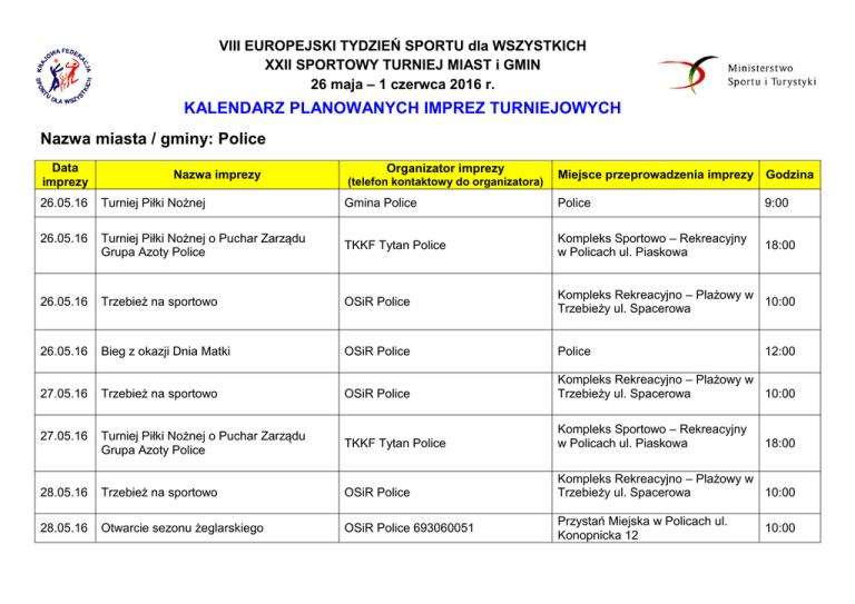VIII EUROPEJSKI TYDZIEŃ SPORTU dla WSZYSTKICH XXII SPORTOWY TURNIEJ MIAST i GMIN 26 maja – 1 czerwca 2016 r. KALENDARZ PLANOWANYCH IMPREZ TURNIEJOWYCH Nazwa miasta / gminy: Police Data imprezy Nazwa imprezy Organizator imprezy (telefon kontaktowy do organizatora) Miejsce przeprowadzenia imprezy Godzina 26.05.16 Turniej Piłki Nożnej Gmina Police Police 9:00 26.05.16 Turniej Piłki Nożnej o Puchar Zarządu Grupa Azoty Police TKKF Tytan Police Kompleks Sportowo – Rekreacyjny w Policach ul. Piaskowa 18:00 26.05.16 Trzebież na sportowo OSiR Police Kompleks Rekreacyjno – Plażowy w 10:00 Trzebieży ul. Spacerowa 26.05.16 Bieg z okazji Dnia Matki OSiR Police Police OSiR Police Kompleks Rekreacyjno – Plażowy w Trzebieży ul. Spacerowa 10:00 12:00 27.05.16 Trzebież na sportowo 27.05.16 Turniej Piłki Nożnej o Puchar Zarządu Grupa Azoty Police TKKF Tytan Police Kompleks Sportowo – Rekreacyjny w Policach ul. Piaskowa 28.05.16 Trzebież na sportowo OSiR Police Kompleks Rekreacyjno – Plażowy w Trzebieży ul. Spacerowa 10:00 28.05.16 Otwarcie sezonu żeglarskiego OSiR Police 693060051 Przystań Miejska w Policach ul. Konopnicka 12 18:00 10:00 Police 28.05.16 Rolkowa sobota OSiR Police 28.05.16 Turniej Piłki Nożnej o Puchar Zarządu Grupa Azoty Police TKKF Tytan Police 28.05.16 Majowy Rajd Rowerowy Sama Rama/OSiR Police 28.05.16 Rajd pieszy po starej fabryce Stowarzyszenie Skarb Police ul. Licealna 29.05.16 Turniej Piłki Nożnej o Puchar Zarządu Grupa Azoty Police TKKF Tytan Police Kompleks Sportowo – Rekreacyjny w Policach ul. Piaskowa 29.05.16 Rodzinny Rajd Rowerowy Sama Rama/OSiR Police 29.05.16 Rajd pieszy po starej fabryce Stowarzyszenie Skarb Police ul. Licealna 29.05.16 Rolkowa niedziela OSiR Police Police 15:00 9:00 Kompleks Sportowo – Rekreacyjny w Policach ul. Piaskowa Police i okolice Police i okolice 15:00 18:00 11:00 12:00 18:00 10:00 12:00 30.05.16 Szkolna Liga Przełajowa Gmina Police Kompleks Sportowo – Rekreacyjny w Policach ul. Piaskowa 97 30.05.16 Police biegają OSiR Police 693060051 Kompleks Sportowo – Rekreacyjny w Policach ul. Piaskowa 97 12:00 Kompleks Sportowo – Rekreacyjny w Policach ul. Piaskowa 97 10:00 30.05.16 Gra Miejska OSiR Police 913175479 30.05.16 Dzień Dziecka Gmina Police 30.05.16 Turniej Piłki Nożnej o Puchar Zarządu Grupa Azoty Police 31.05.16 Turniej Piłki Nożnej o Puchar Zarządu Grupa Azoty Police Przedszkola w Policach 9:00 TKKF Tytan Police Kompleks Sportowo – Rekreacyjny w Policach ul. Piaskowa 18:00 TKKF Tytan Police Kompleks Sportowo – Rekreacyjny w Policach ul. Piaskowa 18:00 31.05.16 Mecze piłkarskie mieszkańców Mieszkańcy Polic Kompleks Sportowo – Rekreacyjny w Policach ul. Piaskowa 97 01.06.16 Dzień Dziecka Gmina Police Szkoły podstawowe, gimnazjalne 9:00 01.06.16 Warsztaty rolkowe OSiR Police 693060051 Police 11:00 01.06.16 Finał turnieju Piłki Nożnej o Puchar Zarządu Grupa Azoty Police TKKF Tytan Police Kompleks Sportowo – Rekreacyjny w Policach ul. Piaskowa 18:00 18:00