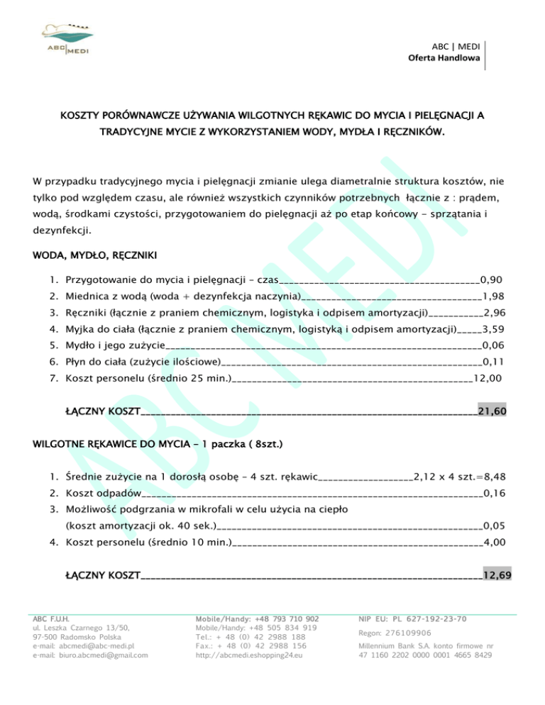ABC | MEDI Oferta Handlowa KOSZTY PORÓWNAWCZE UŻYWANIA WILGOTNYCH RĘKAWIC DO MYCIA I PIELĘGNACJI A TRADYCYJNE MYCIE Z WYKORZYSTANIEM WODY, MYDŁA I RĘCZNIKÓW. W przypadku tradycyjnego mycia i pielęgnacji zmianie ulega diametralnie struktura kosztów, nie tylko pod względem czasu, ale również wszystkich czynników potrzebnych łącznie z : prądem, wodą, środkami czystości, przygotowaniem do pielęgnacji aż po etap końcowy - sprzątania i dezynfekcji. WODA, MYDŁO, RĘCZNIKI 1. Przygotowanie do mycia i pielęgnacji – czas________________________________________0,90 2. Miednica z wodą (woda + dezynfekcja naczynia)____________________________________1,98 3. Ręczniki (łącznie z praniem chemicznym, logistyka i odpisem amortyzacji)___________2,96 4. Myjka do ciała (łącznie z praniem chemicznym, logistyką i odpisem amortyzacji)_____3,59 5. Mydło i jego zużycie_______________________________________________________________0,06 6. Płyn do ciała (zużycie ilościowe)____________________________________________________0,11 7. Koszt personelu (średnio 25 min.)________________________________________________12,00 ŁĄCZNY KOSZT___________________________________________________________________21,60 WILGOTNE RĘKAWICE DO MYCIA – 1 paczka ( 8szt.) 1. Średnie zużycie na 1 dorosłą osobę – 4 szt. rękawic___________________2,12 x 4 szt.=8,48 2. Koszt odpadów____________________________________________________________________0,16 3. Możliwość podgrzania w mikrofali w celu użycia na ciepło (koszt amortyzacji ok. 40 sek.)_____________________________________________________0,05 4. Koszt personelu (średnio 10 min.)__________________________________________________4,00 ŁĄCZNY KOSZT____________________________________________________________________12,69 ABC F.U.H. ul. Leszka Czarnego 13/50, 97-500 Radomsko Polska e-mail: [email protected] e-mail: [email protected] Mobile/Handy: +48 793 710 902 Mobile/Handy: +48 505 834 919 Tel.: + 48 (0) 42 2988 188 Fax.: + 48 (0) 42 2988 156 http://abcmedi.eshopping24.eu NIP EU: PL 62 7 -1 9 2 -2 3 -7 0 Regon: 2 7 6 1 0 9 9 0 6 Millennium Bank S.A. konto firmowe nr 47 1160 2202 0000 0001 4665 8429 ABC | MEDI Oferta Handlowa PODSUMOWANIE Zdecydowane zmniejszenie kosztów budżetu oraz kosztów związanych z fizycznym i fizykalnym przeciążeniem personelu (obciążenie ramion, barek, kręgosłupa, karku i głowy w 25%). Brak kosztów związanych z presją czasu – komfort pracy dla personelu. Odpada dezynfekcja oraz wszystkie koszty z nią związane. Brak kosztów związanych z rozmnażaniem się bakterii poprzez skrzyżowanie jednych zarazków z innymi. Brak dodatkowych obciążeń i dodatkowego czasu związanego ze zmianą pościeli na nową w przypadku rozlania wody w łóżku pacjenta podczas mycia, o co w takich sytuacjach nie trudno. Redukcja czasu do minimum poświęconego na przygotowanie wszystkiego do mycia i pielęgnacji chorego Redukcja czasu do minimum poświęconego na sprzątnięcie po myciu i pielęgnacji chorego. Całkowity brak kosztów związanych z praniem, logistyką i administracją. Natychmiastowa gotowość użycia wilgotnych rękawic do mycia i pielęgnacji. Po otwarciu paczki wystarczy wyjąc i można używać. Możliwość używania na ciepło ( ogrzanie 40 sek. W mikrofali) i na zimno – w zależności od potrzeby. W obu przypadkach skrócony czas pielęgnacji i pracy. Wilgotne rękawice to bardzo bezpieczny produkt o właściwościach dezynfekujących. Posiadają atesty i zostały skontrolowane : ISO 20645 Materiał biodegradowalny – może być kompostowany - Nie potrzeba specjalnego procesu utylizacji Wskazane do utrzymywania higieny. Bardzo cenione na rynku niemieckim ze względu na ich właściwości. ABC F.U.H. ul. Leszka Czarnego 13/50, 97-500 Radomsko Polska e-mail: [email protected] e-mail: [email protected] Mobile/Handy: +48 793 710 902 Mobile/Handy: +48 505 834 919 Tel.: + 48 (0) 42 2988 188 Fax.: + 48 (0) 42 2988 156 http://abcmedi.eshopping24.eu NIP EU: PL 62 7 -1 9 2 -2 3 -7 0 Regon: 2 7 6 1 0 9 9 0 6 Millennium Bank S.A. konto firmowe nr 47 1160 2202 0000 0001 4665 8429 ABC | MEDI Oferta Handlowa Produkt Made In EU. ABC F.U.H. ul. Leszka Czarnego 13/50, 97-500 Radomsko Polska e-mail: [email protected] e-mail: [email protected] Mobile/Handy: +48 793 710 902 Mobile/Handy: +48 505 834 919 Tel.: + 48 (0) 42 2988 188 Fax.: + 48 (0) 42 2988 156 http://abcmedi.eshopping24.eu NIP EU: PL 62 7 -1 9 2 -2 3 -7 0 Regon: 2 7 6 1 0 9 9 0 6 Millennium Bank S.A. konto firmowe nr 47 1160 2202 0000 0001 4665 8429