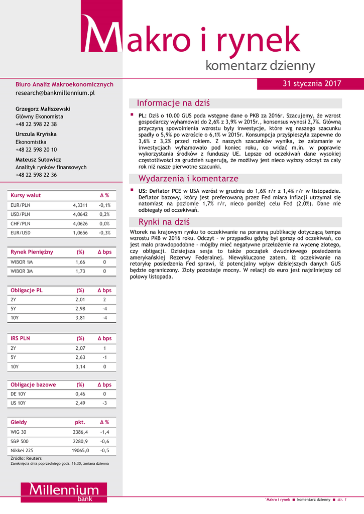 31 stycznia 2017 Biuro Analiz Makroekonomicznych [email protected] Informacje na dziś Grzegorz Maliszewski Główny Ekonomista +48 22 598 22 38 Urszula Kryńska Ekonomistka +48 22 598 20 10 Mateusz Sutowicz Analityk rynków finansowych +48 22 598 22 36 Kursy walut Wydarzenia i komentarze Δ% EUR/PLN 4,3311 -0,1% USD/PLN 4,0642 0,2% CHF/PLN 4,0626 0,0% EUR/USD PL: Dziś o 10.00 GUS poda wstępne dane o PKB za 2016r. Szacujemy, że wzrost gospodarczy wyhamował do 2,6% z 3,9% w 2015r., konsensus wynosi 2,7%. Główną przyczyną spowolnienia wzrostu były inwestycje, które wg naszego szacunku spadły o 5,9% po wzroście o 6,1% w 2015r. Konsumpcja przyśpieszyła zapewne do 3,6% z 3,2% przed rokiem. Z naszych szacunków wynika, że załamanie w inwestycjach wyhamowało pod koniec roku, co widać m.in. w poprawie wykorzystania środków z funduszy UE. Lepsze od oczekiwań dane wysokiej częstotliwości za grudzień sugerują, że możliwy jest nieco wyższy odczyt za cały rok niż nasze pierwotne szacunki. 1,0656 -0,3% Rynek Pieniężny (%) Δ bps WIBOR 1M 1,66 0 WIBOR 3M 1,73 0 Obligacje PL (%) Δ bps 2Y 2,01 2 5Y 2,98 -4 10Y 3,81 -4 IRS PLN (%) Δ bps 2Y 2,07 1 5Y 2,63 -1 10Y 3,14 0 Obligacje bazowe (%) Δ bps DE 10Y 0,46 0 US 10Y 2,49 -3 Giełdy pkt. Δ% WIG 30 2386,4 -1,4 S&P 500 2280,9 -0,6 Nikkei 225 19065,0 -0,5 US: Deflator PCE w USA wzrósł w grudniu do 1,6% r/r z 1,4% r/r w listopadzie. Deflator bazowy, który jest preferowaną przez Fed miara inflacji utrzymał się natomiast na poziomie 1,7% r/r, nieco poniżej celu Fed (2,0%). Dane nie odbiegały od oczekiwań. Rynki na dziś Wtorek na krajowym rynku to oczekiwanie na poranną publikację dotyczącą tempa wzrostu PKB w 2016 roku. Odczyt – w przypadku gdyby był gorszy od oczekiwań, co jest mało prawdopodobne – mógłby mieć negatywne przełożenie na wycenę złotego, czy obligacji. Dzisiejsza sesja to także początek dwudniowego posiedzenia amerykańskiej Rezerwy Federalnej. Niewykluczone zatem, iż oczekiwanie na retorykę posiedzenia Fed sprawi, iż potencjalny wpływ dzisiejszych danych GUS będzie ograniczony. Złoty pozostaje mocny. W relacji do euro jest najsilniejszy od połowy listopada. Źródło: Reuters Zamknięcia dnia poprzedniego godz. 16.30, zmiana dzienna `Makro i rynek komentarz dzienny str. 1 Rynek krajowy Kursy walutowe EUR/PLN i EUR/USD 4,50 1,13 4,45 1,11 4,40 1,09 4,35 1,07 4,30 1,05 4,25 1,03 EURPLN EURUSD /prawa skala/ Źródło: Reuters Złoty z próbą mocniejszego rozegrania na początku nowego tygodnia i to pomimo nieco słabszych nastrojów na świecie będących reakcją między innymi na kontrowersyjną decyzję prezydenta USA dotyczącą zakazu wjazdu obywateli wybranych państw do Stanów Zjednoczonych. Przejściowo kurs EUR/PLN zniżkował do poziomu 4,32 tj. minimum z początku listopada. Aprecjacja polskiej waluty nie była jednak tak wyraźna by w notowaniach kursu USD/PLN móc odwrócić negatywny wpływ drożejącego dolara na globalnym rynku. W rezultacie notowania pary USD/PLN zawróciły z niemal 3miesięcznego minimum. Na krajowym rynku długu poniedziałek był dniem niewielkiego wypłaszczenia krzywej. Dochodowość 2-latki wzrosła bowiem o 2 bps do poziomu 2,01% - czemu mogła sprzyjać wypowiedz członka RPP A.Zubelewicza, który stwierdził, że w lipcu Rada powinna zastanowić się nad terminem i skalą ewentualnych zmian stóp procentowych. Rentowność 10-latki natomiast zmalała o 4 bps do 3,81% kopiując trendy na rynkach bazowych. Rynki zagraniczne Rentowności polskich obligacji [%] Poniedziałek rozpoczął się od próby aprecjacji dolara w relacji do euro, po której kurs EUR/USD wyznaczył poziom 1,0617. Umocnienie amerykańskiej waluty nie było jednak trwałe, gdyż na koniec dnia notowania powróciły w okolice otwarcia tj. 1,07. Relatywnie spokojny przebieg miały wczoraj notowania obligacji bazowych. Niemiecka 10-latka stabilizowała się na poziomie 0,46%. Zmienność towarzyszyła jedynie amerykańskim papierom dłużnym. Wczoraj dochodowość 10-letniego długu USA zniżkowała o 3 bps do 2,49%. 4,2 3,8 3,4 3,0 2,6 2,2 1,8 1,4 Spread PL 10Y vs. DE 10Y 2Y 5Y 10Y Źródło: Reuters Rentowności obligacji USA i Niemiec [%] 2,50 2,00 1,50 1,00 0,50 0,00 -0,50 10Y DE 10Y US Źródło: Reuters Ceny surowców [USD] 1350 60 1300 55 1250 50 1200 45 1150 1100 40 Złoto /lewa skala/ Ropa naftowa Brent Źródło: Reuters `Makro i rynek komentarz dzienny str. 2 Kalendarium Data Kraj Okres Poprzednie dane Aktualne dane Konsensus (prognoza Millenium) Godz. Wskaźnik/Wydarzenie 01/27 10:00 Podaż pieniądza M3 r/r EU Grudzień 4.8% 5.0% 4.9% 01/27 14:30 PKB Annualized q/q USA 4Q 3.5% 1.9% 2.2% 01/27 14:30 Konsumpcja osobista USA 4Q 3.0% 2.5% 2.5% 01/27 16:00 Indeks uniwersytetu Michigan USA Styczeń 98.1 98.5 98.1 01/30 14:00 Inflacja CPI r/r Niemcy Styczeń 1.7% 1.9% 2.0% 01/30 14:30 Dochody osobiste USA Grudzień 0.0% 0.3% 0.4% 01/30 14:30 Wydatki osobiste USA Grudzień 0.2% 0.1% 0.5% 01/30 14:30 PCE Deflator r/r USA Grudzień 1.4% 1.6% 1.7% 01/30 14:30 PCE Core r/r USA Grudzień 1.6% 1.7% 1.7% 01/30 16:00 Sprzedaż domów na rynku wtórnym NSA r/r USA Grudzień 1.4% 1.6% 01/31 08:00 Sprzedaż detaliczna r/r Niemcy Grudzień 3.5% -1.1% 01/31 10:00 PKB r/r Polska 2016 3.6% 2.7% 01/31 11:00 Stopa bezrobocia EU Grudzień 9.8% 9.8% 01/31 11:00 PKB SA r/r EU 4Q 1.7% 1.7% 01/31 11:00 Szacunki inflacji r/r EU Styczeń 1.1% 1.5% 01/31 11:00 Inflacja bazowa r/r EU Styczeń 0.9% 0.9% 01/31 15:00 Indeks CaseShiller r/r NSA USA Listopad 5.10% 5.08% 01/31 16:00 Indeks nastrojów konsumenckich USA Styczeń 113.7 112.8 02/01 09:00 PMI w przemyśle Polska Styczeń 54.3 53.5 02/01 09:55 PMI w przemyśle Niemcy Styczeń 56.5 56.5 02/01 10:00 PMI w przemyśle EU Styczeń 55.1 55.1 02/01 13:00 Liczba podań o kredyt hipoteczny MBA USA Styczeń 4.0% 02/01 14:15 Raport ADP USA Styczeń 153k 165k 02/01 15:45 PMI w przemyśle USA Styczeń 55.1 55.1 02/01 16:00 Indeks ISM w przemyśle U