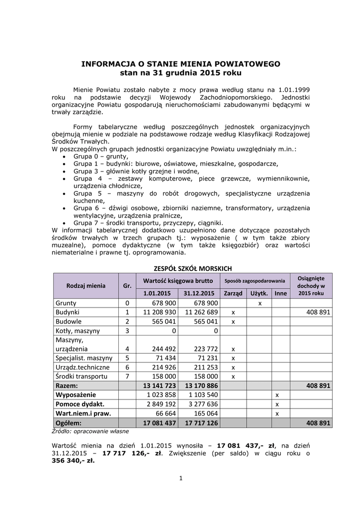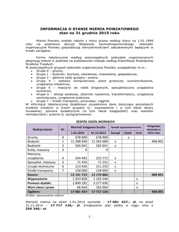 INFORMACJA O STANIE MIENIA POWIATOWEGO stan na 31 grudnia 2015 roku Mienie Powiatu zostało nabyte z mocy prawa według stanu na 1.01.1999 roku na podstawie decyzji Wojewody Zachodniopomorskiego. Jednostki organizacyjne Powiatu gospodarują nieruchomościami zabudowanymi będącymi w trwały zarządzie. Formy tabelaryczne według poszczególnych jednostek organizacyjnych obejmują mienie w podziale na podstawowe rodzaje według Klasyfikacji Rodzajowej Środków Trwałych. W poszczególnych grupach jednostki organizacyjne Powiatu uwzględniały m.in.: Grupa 0 – grunty, Grupa 1 – budynki: biurowe, oświatowe, mieszkalne, gospodarcze, Grupa 3 – głównie kotły grzejne i wodne, Grupa 4 – zestawy komputerowe, piece grzewcze, wymiennikownie, urządzenia chłodnicze, Grupa 5 – maszyny do robót drogowych, specjalistyczne urządzenia kuchenne, Grupa 6 – dźwigi osobowe, zbiorniki naziemne, transformatory, urządzenia wentylacyjne, urządzenia pralnicze, Grupa 7 – środki transportu, przyczepy, ciągniki. W informacji tabelarycznej dodatkowo uzupełniono dane dotyczące pozostałych środków trwałych w trzech grupach tj.: wyposażenie ( w tym także zbiory muzealne), pomoce dydaktyczne (w tym także księgozbiór) oraz wartości niematerialne i prawne tj. oprogramowania. ZESPÓŁ SZKÓŁ MORSKICH Rodzaj mienia Grunty Budynki Budowle Kotły, maszyny Maszyny, urządzenia Specjalist. maszyny Urządz.techniczne Środki transportu Razem: Wyposażenie Pomoce dydakt. Wart.niem.i praw. Ogółem: Wartość księgowa brutto Sposób zagospodarowania 1.01.2015 31.12.2015 Zarząd 0 1 2 3 678 900 11 208 930 565 041 0 678 900 11 262 689 565 041 0 4 5 6 7 244 492 71 434 214 926 158 000 13 141 723 1 023 858 2 849 192 66 664 17 081 437 223 772 71 231 211 253 158 000 13 170 886 1 103 540 3 277 636 165 064 17 717 126 Gr. Użytk. Inne Osiągnięte dochody w 2015 roku x x x 408 891 x x x x 408 891 x x x 408 891 Źródło: opracowanie własne Wartość mienia na dzień 1.01.2015 wynosiła – 17 081 437,- zł, na dzień 31.12.2015 – 17 717 126,- zł. Zwiększenie (per saldo) w ciągu roku o 356 340,- zł. 1 Zmiany wartości środków trwałych dotyczą: Grupa 1 – zwiększenie wartości o 53 759,- zł, w związku z modernizacją 4 pokoi w internacie. Grupa 4 – zmniejszenie wartości o 20 720,- zł w wyniku: kradzieży zestawu komputerowego (otrzymano odszkodowanie) oraz likwidacji zużytych 7 zestawów komputerowych i drukarki. Grupa 5 – zmniejszenie wartości o 203,- zł, w związku z likwidacją dwóch pił. Grupa 6 – zmniejszenie wartości o 3 673,- zł, likwidacja dwóch telewizorów, wieży i DVD. Wyposażenie – zwiększenie wartości (per saldo) o 79 682,- zł zakupiono m.in.: dwa notebooki, sprzęt medyczny (waga osobowa, ciśnieniomierz, termometr bezprzewodowy), dwa projektory z ekranami, chłodziarkę, czajniki, meble dla uczniów (krzesła, ławki, biurka komputerowe), komputery, ,monitory do pracownio symulatora mechaniki okrętowej – łączna wartość zakupionego sprzętu 103 195,- zł, natomiast zlikwidowano w wyniku zużycia: ksero, chłodziarki, stoły, stoliki, głośniki, zasilacz, tapczany – łączna wartość likwidacji 23 513,- zł. Pomoce dydaktyczne – zwiększenie (per saldo) o 428 444,- zł, zlikwidowano m.in.: zestawy komputerowe, radiotelefony, mapy geograficzne, drukarki, monitory, telewizor, projektów – na kwotę 70 517,- zł; rozbudowano istniejący symulator map nawigacyjnych (rozbudowa dotyczy sprzętu i oprogramowania) – wartość 498 961,- zł. Wartości niematerialne i prawne – zwiększenie o 98 400,- zł, z tytułu aktualizacji programu symulatora siłowni okrętowej. ZESPÓŁ SZKÓŁ EKONOMICZNO HOTELARSKICH - jednostka (bez ośrodka GRYF) Wartość księgowa brutto Rodzaj mienia Gr. 1.01.2015 Grunty Budynki Budowle Kotły, maszyny Maszyny, urządzenia Specjalist. maszyny Urządz.techniczne Środki transportu Razem: Wyposażenie Pomoce dydakt. Wart.niem.i praw. Ogółem: 0 1 2 3 4 5 6 7 31.12.2015 621 662 3 748 973 457 877 0 1 687 993 32 711 258 699 115 300 6 923 215 2 191 489 621 662 3 748 973 457 877 0 1 686 400 32 574 261 212 103 800 6 912 498 2 159 143 75 340 9 190 044 90 522 9 162 163 Źródło: opracowanie własne 2 Sposób zagospodarowania Zarząd Użytk. Inne x x x x x x x x x Osiągnięte dochody w 2015 roku 0 191 372 0 0 0 0 0 0 191 372 0 0 0 191 372 ZESPÓŁ SZKÓŁ EKONOMICZNO HOTELARSKICH - Ośrodek GRYF Wartość księgowa brutto Rodzaj mienia Grunty Budynki Budowle Kotły, maszyny Maszyny, urządzenia Specjalist. maszyny Urządz.techniczne Środki transportu Razem: Wyposażenie Pomoce dydakt. Wart.niem.i praw. Ogółem: Sposób zagospodarowania Gr. 0 1 2 3 4 5 6 7 1.01.2015 31.12.2015 7 133 000 7 096 823 0 94 275 17 948 697 320 0 0 15 039 366 249 349 0 0 15 288 715 7 133 000 7 096 823 0 94 275 17 948 697 320 0 0 15 039 366 236 241 0 0 15 275 607 Zarząd Użytk. Inne Osiągnięte dochody w 2015 roku x x x x x x x x x x Źródło: opracowanie własne Wartość mienia na dzień 1.01.2015 wynosiła – 24 478 759,- zł, w tym Ośrodek GRYF 15 288 715,- zł, na dzień 31.12.2015 – 24 437 770,- zł, w tym Ośrodek GRYF 15 275 607,- zł. Zmniejszenie (per saldo) w ciągu roku o 40 989,- zł. Zmiany wartości środków trwałych dotyczą: Grupa 4 – zmniejszenie (per saldo) o 1 593,- zł, zakupiono do ZSEH i CKP: zestawy komputerowe, kotła warzelnego, szaf chłodniczych, sprzętu kuchennego – wartość 89 494,- zł; likwidacja: pieca piekarskiego z parownikiem, zestawy komputerowe, elektronarzędzia – wartość 91 087,- zł. Grupa 5 – zmniejszenie o 137,- zł, likwidacja obkaszarki żyłkowej. Grupa 6 – zwiększenie (per saldo) wartości o 2 513,- zł, zakupiono: sprzęt RTV, telefony komórkowe – wartość 15 084,- zł; likwidacja zużytego sprzętu RTV, sprzętu nagłaśniającego, telefonów komórkowych – wartość 12 571,- zł. Grupa 7 – zmniejszenie o 11 500,- zł, z tytułu likwidacji samochodu osobowego Renaul