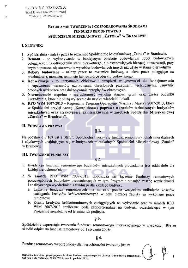 KADA NADZORCZA .;e!.' u Mieszkaniowej j K i "A' Braniewie REGULAMIN TWORZENIA i GOSPODAROWANIA ŚRODKAMI FUNDUSZU REMONTOWEGO SPÓŁDZIELNI MIESZKANIOWEJ „ZATOKA" w BRANIEWIE I. SŁOWNIK: 1. Spółdzielnia - należy przez to rozumieć Spółdzielnię Mieszkaniową „Zatoka" w Braniewie. 2. Remont - to wykonywanie w istniejącym obiekcie budowlanym robót budowlanych polegających na odtworzeniu stanu pierwotnego, a niestanowiących bieżącej konserwacji, przy czym dopuszcza się stosowanie wyrobów budowlanych innych niż użyto w stanie pierwotnym. 3. Roboty budowlane - należy przez to rozumieć budowę, a także prace polegające na przebudowie, montażu, remoncie lub rozbiórce obiektu budowlanego. 4. Konserwacja - to utrzymanie obiektów i urządzeń w gotowości do funkcjonowania i zapewnienia warunków użytkowania określonych przepisami technicznymi, usuwanie drobnych uszkodzeń oraz dokonywanie przeglądów okresowych. 5. Nieruchomość wspólna - nieruchomość wspólna stanowi grunt oraz części budynku i urządzenia, które nie służą wyłącznie do użytku właścicieli lokali. 6. RPO WiM 2007-2013 - Regionalny Program Operacyjny Warmia i Mazury 2007-2013, który w Spółdzielni przyjął nazwę „Kompleksowa poprawa warunków technicznych budynków mieszkalnych oraz atrakcyjności zamieszkiwania w zasobach Spółdzielni Mieszkaniowej „Zatoka" w Braniewie". II. PODSTAWA PRAWNA §1. Na podstawie § 169 ust 2 Statutu Spółdzielni tworzy się fundusz remontowy lokali mieszkalnych i użytkowych znajdujących się w budynkach mieszkalnych Spółdzielni Mieszkaniowej „Zatoka" w Braniewie. III. TWORZENIE FUNDUSZY §2. 1. Ewidencja funduszu remontowego budynków mieszkalnych prowadzona jest oddzielnie dla każdej nieruchomości. 2. W ramach RPO WiM 2007-2013, dopuszcza się łączenie funduszy remontowych poszczególnych budynków uczestniczących w tym Programie stosując zasadę rozdzielności i analitycznego wyodrębnienia funduszu dla każdego budynku. a. Łączenie funduszy remontowych ma na celu przede wszystkim uniknięcie kosztów zaciągania kredytów krótkoterminowych w celu bieżącej zapłaty za wykonane prace remontowe. b. Koszty kredytów krótkoterminowych zaciągniętych na wykonanie prac w ramach RPO WiM 2007-2013 rozliczane będą proporcjonalnie na budynki uczestniczące w tym Programie niezależnie od terminu ich podjęcia. §3. Spółdzielnia zaprzestaje tworzenia funduszu remontowego interwencyjnego w wysokości 10% ze składki odpisu na fundusz remontowy od l stycznia 2008r. §4. Fundusz remontowy wyodrębniony dla nieruchomości tworzony jest z: Regulamin tworzenia i gospodarowania środkami funduszu remontowego SM „Zatoka" w Braniewie z załącznikami. Uchwala Rady Nadzorczej Nr w£/2015 z dnia 21 grudnia 2015r. RADA NADZORCZA ^poici?'-:H- ;; ^'i!''-^''Kftriiowe5 1. Odpisów od lokali mieszkalnych i użytkowych zaliczanych do zasobów będących własnością Spółdzielni oraz lokali mieszkalnych i użytkowych, których właściciele wyodrębnili prawa własności w oparciu o spółdzielcze prawa do lokali. Odpisy na ten fundusz obciążają koszty gospodarki zasobami mieszkaniowymi. 2. Środków otrzymanych od firm ubezpieczeniowych za szkody powstałe w nieruchomości, których koszt likwidacji stanowił wydatek z funduszu remontowego. określonej 3. Kwot kar umownych z tytułu zwłoki w wykonaniu umowy. 4. Kwot kar umownych za zwłokę w usuwaniu wad przedmiotu umowy. 5. Dotacji celowych. 6. Innych wpływów. IV. WYKORZYSTYWANIE FUNDUSZY §5. 1. Fundusz remontowy wyodrębniony dla nieruchomości przeznaczony jest do finansowania gospodarki remontowej i konserwacji części wspólnych tej nieruchomości, z której został utworzony na: a) Remont nieruchomości wspólnej, usuwanie awarii i usterek. b) Pokrycie kosztów materiałów niezbędnych do konserwacji nieruchomości wspólnej w przypadku prac wykonywanych przez konserwatorów zatrudnionych w Spółdzielni. c) Pokrycie kosztów robocizny oraz materiałów niezbędnych do wykonania drobnych remontów i konserwacji nieruchomości wspólnej w przypadku prac wykonywanych przez konserwatorów zatrudnionych w Spółdzielni w oparciu o Uchwałę Zebrania Bloku lub Samorządu Blokowego; jednostkowy koszty pracy konserwatorów określi Zarząd Spółdzielni. d) Pokrycie regresowych kosztów odszkodowań firm ubezpieczeniowych. e) Pokrycie kosztów związanych z obsługą zaciągniętych kredytów i pożyczek na remonty danej nieruchomości jak również odsetek i innych kosztów od tych kredytów i pożyczek. f) Dofinansowanie do wymiany stolarki okiennej w oparciu o zasady wymiany stolarki okiennej określone w Załączniku Nr 3. 2. Fundusz remontowy wyodrębniony dla nieruchomości może zostać wykorzystany w takiej wielkości, w jakiej został zgromadzony - rzeczywiste wpłaty - w danej nieruchomości z uwzględnieniem ewentualnej pożyczki, o której mowa w Regulaminie gospodarowania środkami funduszu interwencyjnego Spółdzielni Mieszkaniowej „Zatoka" w Braniewie § 5 ust l i 2 oraz z zastrzeżeniem pkt. 3 i 4 niniejszego paragrafu. 3. W uzasadnionych przypadkach dopuszcza się wykorzystanie środków z funduszu remontowego na pokrycie bieżących zobowiązań wynikających z dostaw mediów i usług dla mieszkańców poszczególnych nieruchomości. Środki te będą zwrócone na fundusz remontowy nieruchomości po wpłacie zobowiązań przez dłużników. 4. Rada Nadzorcza zezwala uchwałą na możliwość wydatków z funduszy remontowych budynków w grupach budynków w zakresie jednorodnych rodzajów prac w okresie rozliczeniowym do 5 lat. Celem ma być współfmansowanie z własnych funduszy remontowych budynkowych zadań inwestycyjnych w określonej przez Radę Nadzorczą grupie budynków. Przepis § 2 ust. 2 stosuje się odpowiednio. §6. l. Jednostką rozliczeniową odpisu na fundusz remontowy jest l m2 powierzchni użytkowej lokalu. Regulamin tworzenia i gospodarowania środk