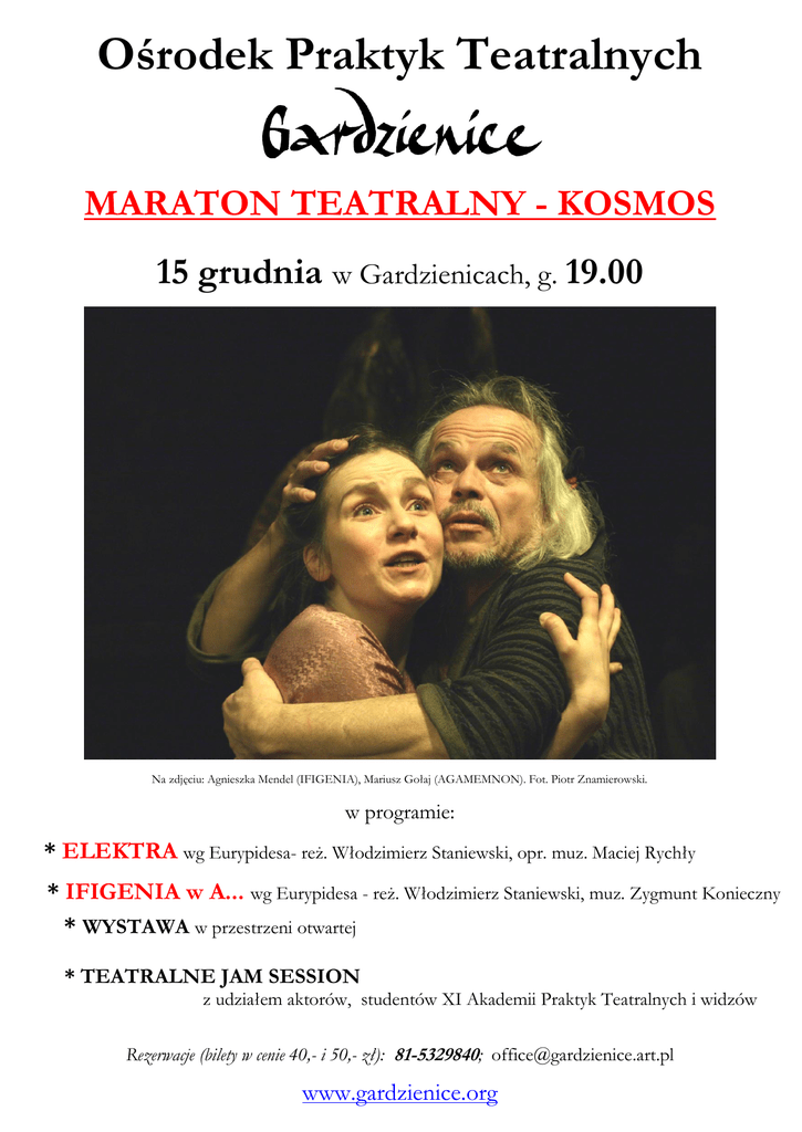 Ośrodek Praktyk Teatralnych MARATON TEATRALNY - KOSMOS 15 grudnia w Gardzienicach, g. 19.00 Na zdjęciu: Agnieszka Mendel (IFIGENIA), Mariusz Gołaj (AGAMEMNON). Fot. Piotr Znamierowski. w programie: * ELEKTRA wg Eurypidesa- reż. Włodzimierz Staniewski, opr. muz. Maciej Rychły * IFIGENIA w A... wg Eurypidesa - reż. Włodzimierz Staniewski, muz. Zygmunt Konieczny * WYSTAWA w przestrzeni otwartej * TEATRALNE JAM SESSION z udziałem aktorów, studentów XI Akademii Praktyk Teatralnych i widzów Rezerwacje (bilety w cenie 40,- i 50,- zł): 81-5329840; [email protected] www.gardzienice.org ELEKTRA Autor spektaklu: Włodzimierz Staniewski - na tekstach „Elektry” Eurypidesa Przekład: Jerzy Łanowski Adaptacja fr. muzyki antycznej Grecji: Maciej Rychły Układ gestów (Cheironomia): Joanna Holcgreber Obsada: Mariusz Gołaj, Joanna Holcgreber, Marcin Mrowca, Anna Dąbrowska, Agnieszka Mendel, Paweł Kieszko, Dorota Kołodziej, Artem Manuilov, Ivor Houlker, James Brennan, Martin Quintela Spektakl powstał w koprodukcji z Hebbel am Uffer Theater w Berlinie. ELEKTRA Eurypidesa - Tragedia uczuć (nota reżyserska) Elektra Eurypidesa jest melodramatem jak mówią uczeni, gatunkowo pomiędzy tragedią a dramatem satyrowym, z efektami heroikomicznymi. Ma konstrukcję niehomogeniczną. W sztuce rozpoznaje się zapożyczenia, wtręty (niektóre dodane po śmierci Eurypidesa), kompilacje, niezgodności, wywołujące spory czy niektóre słowa powinni wypowiadać ci a nie inni bohaterowie. Mity w teatrze greckim były bez przerwy przerabiane i reinterpretowane. Eksperymentowano i wystawiano warianty („wariacje”) ze śmiałością, której trudno doszukać się w późniejszych epokach. Bardzo niewiele w opowieściach mitycznych jest niezmienne i sztywno ustalone. Fabuła, pisał Oliver Taplin, nie była ważna, ważne było jak poeta zmieniał ją w dramat. „Ograniczenia są niewielkie, przestrzeń dla artyzmu ogromna” (świadek Taplin). Eurypides i inni nie tylko dostarczali tekstów ale byli też kompozytorami, choreografami i reżyserami. Musieli prowadzić próby, których proces mógł być uciążliwy, pełen napięć, zmian, poszukiwań inwariantów, napadów euforii i zwątpień, inwencji i odrzuceń, zmieniającego się tempa, kapryśnej dynamiki i wariackich pomysłów. „...gdybyś nie był ignorantem to byś nie śmiał się, kiedy śpiewam w skali miksolidyjskiej” - Eurypides do swojego aktora podczas próby. Któż osądzi ile cudownych kwiatów a ile chwastów ostało się w pomnikach dramatu tylko dlatego, że nie starczyło czasu, sił i środków na zmianę „wariackiego pomysłu”. Wielomiesięczne intensywne próby odbywały się w teatrze ale równie dobrze mogły się odbywać w gimnazjonie albo w perystylu prywatnego domu. Z różnym układem scen i różnymi na nie pomysłami. Autor nauczał i pouczał, wygłaszał pewnie, jak zwykł to czynić Brecht, uwagi i tyrady na temat swoich poglądów nie mających związku ze sztuką. Był żywy i interweniował, kojarzył, posługiwał się aluzją, podpowiadał, cytował innych. Jego próba musiała być teatralnym esejem. Wyobraźmy sobie zatem jedną z nich. Autor- alter ego poety i reżysera wielokrotnie na próbie interweniuje, demonstruje jak grać i wygłaszać niektóre partie (Rolnika, Chóru, Orestesa, Elektry), włącza się do duo, do trio, jest spirytus movens scen zbiorowych. Przestawia układy zdarzeń, improwizuje. Autor i aktorzy wykonują ćwiczenia z tańca, gestu i muzyki przyuczające adeptów do udziału w widowisku. Prezentują zapisy muzyczne, malowidła z utrwalonymi pozami oraz próbki użycia ich w akcji. Ćwiczenia przerwane są libacją, dość rozwiązłą, jak to w świecie artystów. Libację przerywa opowieść o pewnym morderstwie, którego okrucieństwo wstrząsnęło sumieniami. Opowieść pokazana jest nie przy pomocy wzbudzających grozę i litość słów lecz przy pomocy techniki audiowizualnej [za co widzów mających stosunek pietystyczny do starożytności- przepraszamy]. Aktorzy biesiadują choć groza przypomnianej zbrodni wisi w powietrzu. Próba jest kontynuowana choć jej porządek nie może już przebiegać według ustalonego scenariusza. Zwiastowanie morderstwa jak i morderstwo samo zawsze rozbija i przestawia ustalony porządek. Tak w życiu jak i na scenie. W obliczu zbrodni uczestnicy zdarzenia i relacje między nimi poddane są śledztwu. Próba jest śledztwem a śledztwo próbą. Jak zawsze w śledztwie wychodzą rewelacje, które- bez względu na ich stopień prawdopodobieństwa - muszą być zaprotokołowane. Autor staje się śledczym a jego bohaterowie podejrzanymi; relacje Orestesa i Pyladesa daleko wykraczają poza normę, są oni jak Eromenos i Erastes, zrośnięci na dobre i na złe. Elektra jest złotym dzieckiem wysokiego rodu, wychowywanym w muzyce i pięknym słowie. Dziecinna jeszcze Elektra zostaje zgwałcona w czasie jednej z libacji. Inicjatorem i motorem zbiorowego gwałtu jest Ajgist- podstarzały casanova, „z panny twarzą – nie mężczyzna- który tylko chóry w tańcu zdobi” (w. 948- 951), „uwodziciel” (w. 916, 945), zbrodniarz (w. 928). Znakomita część tekstów Elektry to wielki lament skrzywdzonego dziecka. To gwałt czyni Elektrę najpierw sponiewieranym kopciuszkiem, a później oszalałą, knującą podstępy i nieustępliwą w pragnieniu okrutnej zemsty Hydrą. Dziewczęta z Argos są powierniczkami i stronniczkami, zaufanymi towarzyszkami rozmów i zabaw Elektry. Koją ból duszy, pocieszają ciało i spiskują z Elektrą. W monologu „Przyśpiesz kroku, już pora...” (mówionym po grecku) dojrzewa w Elektrze neurotyczna, stłamszona, niewyżyta w rozbudzonym erotyzmie, żądna gwałtu i krwi Hydra. Zaraża nienawiścią innych, agituje imając się wszelkich metod. W interludium opowiadacz (partia Chóru) snuje opowieść o bajkowej, słonecznej Grecji („Słynne okręty...”) co wywołuje ironię i drwinę, jaką d