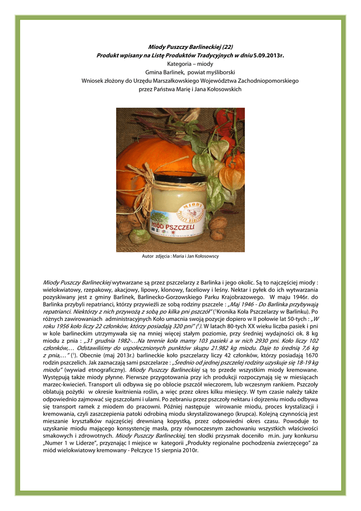 Miody Puszczy Barlineckiej (22) Produkt wpisany na Listę Produktów Tradycyjnych w dniu 5.09.2013r. Kategoria – miody Gmina Barlinek, powiat myśliborski Wniosek złożony do Urzędu Marszałkowskiego Województwa Zachodniopomorskiego przez Państwa Marię i Jana Kołosowskich Autor zdjęcia : Maria i Jan Kołosowscy Miody Puszczy Barlineckiej wytwarzane są przez pszczelarzy z Barlinka i jego okolic. Są to najczęściej miody : wielokwiatowy, rzepakowy, akacjowy, lipowy, klonowy, faceliowy i leśny. Nektar i pyłek do ich wytwarzania pozyskiwany jest z gminy Barlinek, Barlinecko-Gorzowskiego Parku Krajobrazowego. W maju 1946r. do Barlinka przybyli repatrianci, którzy przywieźli ze sobą rodziny pszczele : „Maj 1946 - Do Barlinka przybywają repatrianci. Niektórzy z nich przywożą z sobą po kilka pni pszczół” (1Kronika Koła Pszczelarzy w Barlinku). Po różnych zawirowaniach administracyjnych Koło umacnia swoją pozycje dopiero w II połowie lat 50-tych : „W roku 1956 koło liczy 22 członków, którzy posiadają 320 pni” (1). W latach 80-tych XX wieku liczba pasiek i pni w kole barlineckim utrzymywała się na mniej więcej stałym poziomie, przy średniej wydajności ok. 8 kg miodu z pnia : „31 grudnia 1982-…Na terenie koła mamy 103 pasieki a w nich 2930 pni. Koło liczy 102 członków,… Odstawiliśmy do uspołecznionych punktów skupu 21.982 kg miodu. Daje to średnią 7,6 kg z pnia,…” (1). Obecnie (maj 2013r.) barlineckie koło pszczelarzy liczy 42 członków, którzy posiadają 1670 rodzin pszczelich. Jak zaznaczają sami pszczelarze : „Średnio od jednej pszczelej rodziny uzyskuje się 18-19 kg miodu” (wywiad etnograficzny). Miody Puszczy Barlineckiej są to przede wszystkim miody kremowane. Występują także miody płynne. Pierwsze przygotowania przy ich produkcji rozpoczynają się w miesiącach marzec-kwiecień. Transport uli odbywa się po oblocie pszczół wieczorem, lub wczesnym rankiem. Pszczoły oblatują pożytki w okresie kwitnienia roślin, a więc przez okres kilku miesięcy. W tym czasie należy także odpowiednio zajmować się pszczołami i ulami. Po zebraniu przez pszczoły nektaru i dojrzeniu miodu odbywa się transport ramek z miodem do pracowni. Później następuje wirowanie miodu, proces krystalizacji i kremowania, czyli zaszczepienia patoki odrobiną miodu skrystalizowanego (krupca). Kolejną czynnością jest mieszanie kryształków najczęściej drewnianą kopystką, przez odpowiedni okres czasu. Powoduje to uzyskanie miodu mającego konsystencję masła, przy równoczesnym zachowaniu wszystkich właściwości smakowych i zdrowotnych. Miody Puszczy Barlineckiej, ten słodki przysmak doceniło m.in. jury konkursu „Numer 1 w Liderze”, przyznając I miejsce w kategorii „Produkty regionalne pochodzenia zwierzęcego” za miód wielokwiatowy kremowany - Pełczyce 15 sierpnia 2010r.