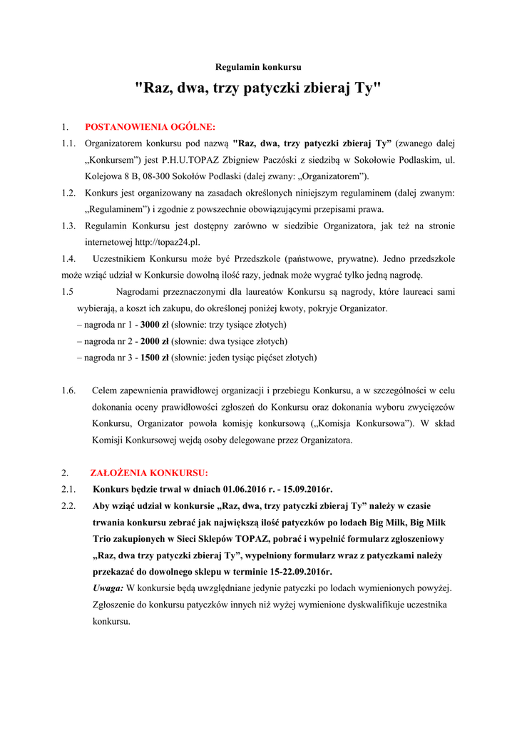 Regulamin konkursu "Raz, dwa, trzy patyczki zbieraj Ty" 1. POSTANOWIENIA OGÓLNE: 1.1. Organizatorem konkursu pod nazwą "Raz, dwa, trzy patyczki zbieraj Ty” (zwanego dalej „Konkursem”) jest P.H.U.TOPAZ Zbigniew Paczóski z siedzibą w Sokołowie Podlaskim, ul. Kolejowa 8 B, 08-300 Sokołów Podlaski (dalej zwany: „Organizatorem”). 1.2. Konkurs jest organizowany na zasadach określonych niniejszym regulaminem (dalej zwanym: „Regulaminem”) i zgodnie z powszechnie obowiązującymi przepisami prawa. 1.3. Regulamin Konkursu jest dostępny zarówno w siedzibie Organizatora, jak też na stronie internetowej http://topaz24.pl. 1.4. Uczestnikiem Konkursu może być Przedszkole (państwowe, prywatne). Jedno przedszkole może wziąć udział w Konkursie dowolną ilość razy, jednak może wygrać tylko jedną nagrodę. 1.5 Nagrodami przeznaczonymi dla laureatów Konkursu są nagrody, które laureaci sami wybierają, a koszt ich zakupu, do określonej poniżej kwoty, pokryje Organizator. – nagroda nr 1 - 3000 zł (słownie: trzy tysiące złotych) – nagroda nr 2 - 2000 zł (słownie: dwa tysiące złotych) – nagroda nr 3 - 1500 zł (słownie: jeden tysiąc pięćset złotych) 1.6. Celem zapewnienia prawidłowej organizacji i przebiegu Konkursu, a w szczególności w celu dokonania oceny prawidłowości zgłoszeń do Konkursu oraz dokonania wyboru zwycięzców Konkursu, Organizator powoła komisję konkursową („Komisja Konkursowa”). W skład Komisji Konkursowej wejdą osoby delegowane przez Organizatora. 2. ZAŁOŻENIA KONKURSU: 2.1. Konkurs będzie trwał w dniach 01.06.2016 r. - 15.09.2016r. 2.2. Aby wziąć udział w konkursie „Raz, dwa, trzy patyczki zbieraj Ty” należy w czasie trwania konkursu zebrać jak największą ilość patyczków po lodach Big Milk, Big Milk Trio zakupionych w Sieci Sklepów TOPAZ, pobrać i wypełnić formularz zgłoszeniowy „Raz, dwa trzy patyczki zbieraj Ty”, wypełniony formularz wraz z patyczkami należy przekazać do dowolnego sklepu w terminie 15-22.09.2016r. Uwaga: W konkursie będą uwzględniane jedynie patyczki po lodach wymienionych powyżej. Zgłoszenie do konkursu patyczków innych niż wyżej wymienione dyskwalifikuje uczestnika konkursu. 3. ZASADY PROWADZENIA KONKURSU: 3.1. Organizator zamieści ogłoszenia o Konkursie, o których mowa w pkt 2, informacje o zasadach Konkursu, nagrodach, oraz ramach czasowych Konkursu. 3.2. Uczestnicy Konkursu są identyfikowani przez Organizatora na podstawie przekazanego do dowolnego sklepu, wypełnionego formularza zgłoszeniowego „Raz, dwa, trzy patyczki zbieraj Ty”. 3.3. Konkurs będzie składał się z jednego etapu. 3.4. Konkurs polegać będzie na wykonaniu zadania konkursowego opisanego w ogłoszeniu o Konkursie. Komisja Konkursowa wybierze laureatów konkursu na podstawie ilości zebranych patyczków. Nie ma znaczenia kolejność zgłoszeń. Termin przekazania patyczków wraz z wypełnionym formularzem zgłoszeniowym upłynie z dniem 22.09.2016r. (zamknięcie zgłoszeń). 3.5. Po zamknięciu zgłoszeń, Komisja Konkursowa dokona wyłonienia Laureatów Konkursu (rozstrzygnięcie konkursu). 3.6. Wyłonieni przez Komisję Konkursową Laureaci w liczbie 3 zostaną poinformowani mailowo lub telefonicznie o wygranej, w ciągu 20 dni od rozstrzygnięcia konkursu. 3.8 Nagrody wskazane w pkt. 1.5 zostaną przyznane po spełnieniu warunków określonych w niniejszym Regulaminie, w tym warunku, o którym mowa w pkt 2.2 3.9 4. Laureaci będą identyfikowani za pomocą wypełnionego formularza. PRZYZNAWANIE NAGRÓD: 4.1. Laureaci wyłonieni zostaną w wyniku realizacji procedury opisanej w punkcie 3 w terminie najpóźniej do dnia 30.09.2016r. 4.2. Laureaci powiadomieni zostaną o wygranej e–mailem lub telefonicznie najpóźniej w ciągu 20 dni od daty rozstrzygnięcia konkursu. 4.3. Topaz pokryje koszty zakupu nagród zwycięzcy konkursu pod warunkiem, że: – dowodem zakupu nagrody będzie faktura VAT wystawiona na: P.H.U. TOPAZ Zbigniew Paczóski ul. Kolejowa 8B, NIP: 823-000-36-73 – wartość nagrody nie może przekraczać kwoty określonej w pkt 1.5 – kwota zostanie przelana na konto sprzedawcy nagrody w terminie nie krótszym niż 14 dni 4.4. Organizator zastrzega sobie prawo odmowy opłacenia nagrody w przypadku kiedy produkty będą budziły wątpliwości np: tytoń, alkohol, używki itp. 4.5. Organizator zastrzega, że pokryje koszty zakupu nagród w terminie najpóźniej do 30 dni od daty powiadomienia laureatów o wygranej, tj. do.05.11.2016r. 4.6 W przypadku nie podjęcia przez Laureata nagrody w terminie 30 dni od dnia pozostawienia jej do dyspozycji Laureata, prawo do nagrody wygasa. 4.7 Po rozstrzygnięciu Konkursu i wydaniu nagród wszelkie korzyści i ciężary związane z Nagrodami przechodzą na osobę Laureata. 5. POSTĘPOWANIE REKLAMACYJNE 5.1. Wszelkie reklamacje dotyczące Konkursu uczestnicy powinni zgłaszać w formie pisemnej w maksymalnym terminie 40 dni od dnia rozwiązania Konkursu, tj. od dnia 06.10.2016 r. (na adres Organizatora: P.H.U.”TOPAZ” Zbigniew Paczóski ul. Kolejowa 8 B 08-300 Sokołów Podlaski z dopiskiem o treści: Reklamacja – Konkurs "Raz, dwa, trzy patyczki zbieraj Ty". Reklamacje należy wysłać listem poleconym. Decyduje data stempla pocztowego. 5.2. Pisemna reklamacja powinna zawierać imię, nazwisko, dokładny adres i numer telefonu, jak również dokładny opis i uzasadnienie reklamacji. 5.3. Reklamacje rozpatrywane będą przez Komisję Reklamacyjną (dalej zwaną: „Komisją") powołaną przez Organizatora. 5.4. Komisja rozpatrywać będzie reklamacje uczestników na podstawie niniejszego Regulaminu. 5.5. Komisja rozpatrzy reklamacje w terminie 14 dni od dnia jej doręczenia. 5.6. Osoba zgłaszająca reklamację otrzyma decyzję Komisji na piśmie na adres podany przez uczestnika.