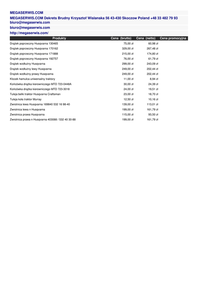 MEGASERWIS.COM MEGASERWIS.COM Dekrets Brudny Krzysztof Wislanska 56 43-430 Skoczow Poland +48 33 482 79 93 [email protected] [email protected] http://megaserwis.com/ Produkty Cena (brutto) Cena (netto) Cena promocyjna Drążek poprzeczny Husqvarna 130465 75,00 zł 60,98 zł Drążek poprzeczny Husqvarna 170162 329,00 zł 267,48 zł Drążek poprzeczny Husqvarna 171888 215,00 zł 174,80 zł Drążek poprzeczny Husqvarna 192757 76,00 zł 61,79 zł Drążek wzdłużny Husqvarna 299,00 zł 243,09 zł Drążek wzdłużny lewy Husqvarna 249,00 zł 202,44 zł Drążek wzdłużny prawy Husqvarna 249,00 zł 202,44 zł Klocek hamulca uniwersalny traktory 11,00 zł 8,94 zł Końcówka drążka kierowniczego MTD 723-0448A 30,00 zł 24,39 zł Końcówka drążka kierowniczego MTD 723-3018 24,00 zł 19,51 zł Tuleja belki traktor Husqvarna Craftsman 23,00 zł 18,70 zł Tuleja koła traktor Murray 12,50 zł 10,16 zł Zwrotnica lewa Husqvarna 169840 532 16 98-40 139,00 zł 113,01 zł Zwrotnica lewa n Husqvarna 199,00 zł 161,79 zł Zwrotnica prawa Husqvarna 115,00 zł 93,50 zł Zwrotnica prawa n Husqvarna 403088 / 532 40 30-88 199,00 zł 161,79 zł