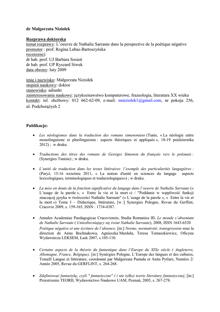 dr Małgorzata Niziołek Rozprawa doktorska temat rozprawy: L