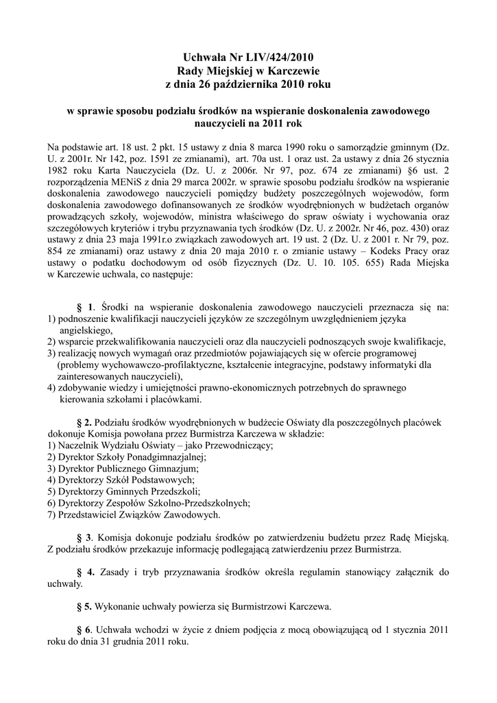 Uchwała Nr LIV/424/2010 Rady Miejskiej w Karczewie z dnia 26 października 2010 roku w sprawie sposobu podziału środków na wspieranie doskonalenia zawodowego nauczycieli na 2011 rok Na podstawie art. 18 ust. 2 pkt. 15 ustawy z dnia 8 marca 1990 roku o samorządzie gminnym (Dz. U. z 2001r. Nr 142, poz. 1591 ze zmianami), art. 70a ust. 1 oraz ust. 2a ustawy z dnia 26 stycznia 1982 roku Karta Nauczyciela (Dz. U. z 2006r. Nr 97, poz. 674 ze zmianami) §6 ust. 2 rozporządzenia MENiS z dnia 29 marca 2002r. w sprawie sposobu podziału środków na wspieranie doskonalenia zawodowego nauczycieli pomiędzy budżety poszczególnych wojewodów, form doskonalenia zawodowego dofinansowanych ze środków wyodrębnionych w budżetach organów prowadzących szkoły, wojewodów, ministra właściwego do spraw oświaty i wychowania oraz szczegółowych kryteriów i trybu przyznawania tych środków (Dz. U. z 2002r. Nr 46, poz. 430) oraz ustawy z dnia 23 maja 1991r.o związkach zawodowych art. 19 ust. 2 (Dz. U. z 2001 r. Nr 79, poz. 854 ze zmianami) oraz ustawy z dnia 20 maja 2010 r. o zmianie ustawy – Kodeks Pracy oraz ustawy o podatku dochodowym od osób fizycznych (Dz. U. 10. 105. 655) Rada Miejska w Karczewie uchwala, co następuje: § 1. Środki na wspieranie doskonalenia zawodowego nauczycieli przeznacza się na: 1) podnoszenie kwalifikacji nauczycieli języków ze szczególnym uwzględnieniem języka angielskiego, 2) wsparcie przekwalifikowania nauczycieli oraz dla nauczycieli podnoszących swoje kwalifikacje, 3) realizację nowych wymagań oraz przedmiotów pojawiających się w ofercie programowej (problemy wychowawczo-profilaktyczne, kształcenie integracyjne, podstawy informatyki dla zainteresowanych nauczycieli), 4) zdobywanie wiedzy i umiejętności prawno-ekonomicznych potrzebnych do sprawnego kierowania szkołami i placówkami. § 2. Podziału środków wyodrębnionych w budżecie Oświaty dla poszczególnych placówek dokonuje Komisja powołana przez Burmistrza Karczewa w składzie: 1) Naczelnik Wydziału Oświaty – jako Przewodniczący; 2) Dyrektor Szkoły Ponadgimnazjalnej; 3) Dyrektor Publicznego Gimnazjum; 4) Dyrektorzy Szkół Podstawowych; 5) Dyrektorzy Gminnych Przedszkoli; 6) Dyrektorzy Zespołów Szkolno-Przedszkolnych; 7) Przedstawiciel Związków Zawodowych. § 3. Komisja dokonuje podziału środków po zatwierdzeniu budżetu przez Radę Miejską. Z podziału środków przekazuje informację podlegającą zatwierdzeniu przez Burmistrza. § 4. Zasady i tryb przyznawania środków określa regulamin stanowiący załącznik do uchwały. § 5. Wykonanie uchwały powierza się Burmistrzowi Karczewa. § 6. Uchwała wchodzi w życie z dniem podjęcia z mocą obowiązującą od 1 stycznia 2011 roku do dnia 31 grudnia 2011 roku. Przewodnicząca Rady Miejskiej w Karczewie mgr Danuta Żelazko Załącznik do Uchwały Nr LIV/424/2010 Rady Miejskiej w Karczewie z dnia 26 października 2010 roku REGULAMIN dofinansowania dokształcania i doskonalenia zawodowego nauczycieli na rok 2011 I. Postanowienia ogólne. 1. Dofinansowaniem objęte są indywidualne formy dokształcania i doskonalenia: a) studia podyplomowe; b) kursy kwalifikacyjne; c) drugi kierunek studiów; d) studia i kursy kwalifikacyjne do nauczania języków obcych; e) studia magisterskie uzupełniające dla absolwentów kolegiów języków obcych i licencjatów innych kierunków. 2. Dofinansowaniem objęte są również: a) szkolenia rad pedagogicznych; b) szkolenia zespołów problemowych i przedmiotowych; c) inne formy doskonalenia zgodnie z potrzebami placówki. II. Kryteria przyznawania dofinansowania. 1. Z wnioskiem o dofinansowanie doskonalenia zawodowego mogą występować nauczyciele zatrudnieni na co najmniej ½ etatu, którzy: a) posiadają co najmniej stopień nauczyciela kontraktowego oraz co najmniej dobrą ocenę pracy; b) podnoszą swoje kwalifikacje zgodnie z potrzebami kadrowymi i organizacyjnymi placówki w uzgodnieniu potrzeb z dyrektorem placówki; c) nie korzystają z innych źródeł dofinansowania 2. Na wysokość dofinansowania ma wpływ sytuacja materialna i życiowa nauczyciela. III. Zasady i tryb przyznawania dofinansowania. 1. Nauczyciele, którzy ubiegają się o dofinansowanie indywidualnego dokształcania składają do dyrektora placówki wniosek z załącznikami: a) potwierdzeniem uczestnictwa w danej formie dokształcania; b) potwierdzenie uiszczenia opłaty. 2. W przypadku, gdy nauczyciel studiuje na więcej niż jednym kierunku, dofinansowaniu podlega tylko jeden z nich. 3. W przypadku ubiegania się o refundację kolejnych semestrów należy złożyć zaświadczenie o zaliczeniu semestru lub wpis z indeksu wraz z opłatą. 4. Dofinansowanie nie przysługuje w przypadku powtarzania semestru lub roku studiów oraz korzystania z urlopu dziekańskiego z wyłączeniem przypadków losowych (udokumentowanych). 5. Przerwanie przez nauczyciela toku określonej formy doskonalenia powoduje konieczność zwrotu całej otrzymanej kwoty. 6. Wysokość indywidualnego dofinansowania nie może przekroczyć 50% kosztów poniesionych przez nauczyciela (bez kosztów podróży). 7. Wnioski o dofinansowanie, rozpatruje komisja powołana na terenie placówki składająca się co najmniej z trzech osób w skład której wchodzą: a) dyrektor placówki – jako jej przewodniczący; b) jeden przedstawiciel rady pedagogicznej; c) po jednym przedstawicielu związków zawodowych działających w placówce; d) w przypadku braku związków zawodowych w danej placówce – nauczyciel wybrany przez radę pedagogiczną. 8. Wnioski są rozpatrywane przez komisję co najmniej dwa razy w roku: a) do końca listopada; b) do końca marca. IV. Postanowienia końcowe. 1. Podział środków oraz wysokość przyznanych kwot nie podlegają roszczeniom ze strony nauczycieli. 2. Dyrektor zapoznaje radę pedagogiczną z treścią regulaminu oraz sprawozdań składanych corocznie organowi prowadzącemu. 3. Zmiany treści regulaminu wymag