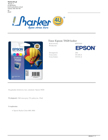 Marker4U.pl Boczna 5 62-800 Kalisz [email protected] Telefon: 884-760-760 gg: skype: Tusz Epson T020 kolor Kod towaru: Producent: EPST020 Dostępność: Cena netto: Cena brutto: 24h 191.80 zł 235.92 zł Oryginalny kolorowy tusz, atrament Epson T020 Wydajność: 360 stron przy 5% pokryciu, 35ml Urządzenia: Epson Stylus Color 880, 880i strona 1 / 1 Powered by TCPDF (www.tcpdf.org)