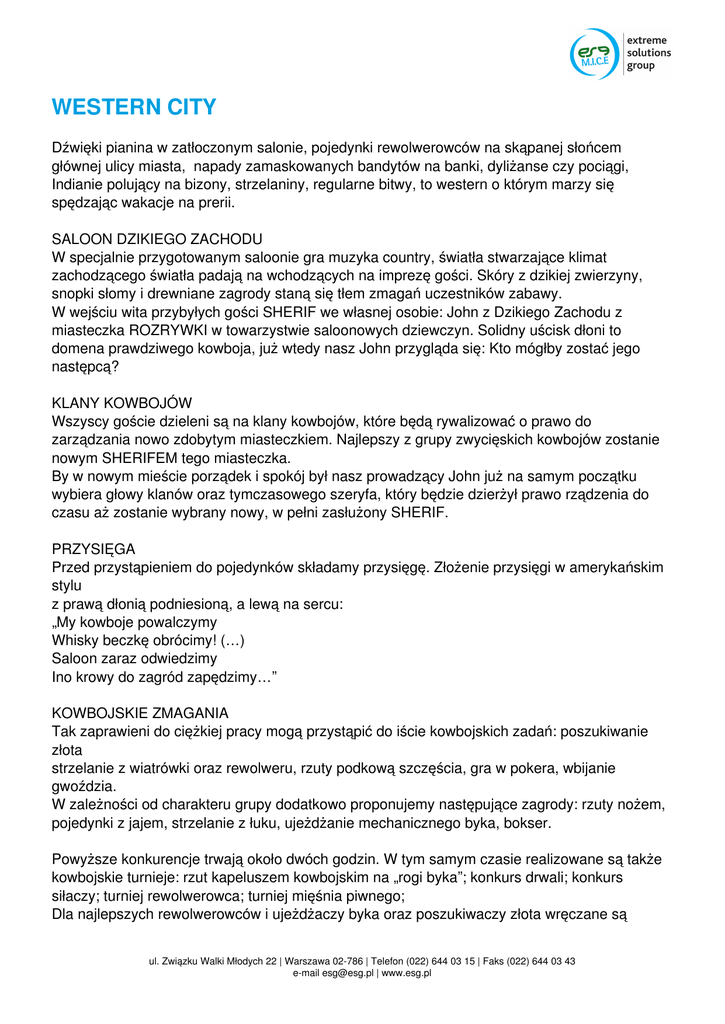 WESTERN CITY Dźwięki pianina w zatłoczonym salonie, pojedynki rewolwerowców na skąpanej słońcem głównej ulicy miasta, napady zamaskowanych bandytów na banki, dyliżanse czy pociągi, Indianie polujący na bizony, strzelaniny, regularne bitwy, to western o którym marzy się spędzając wakacje na prerii. SALOON DZIKIEGO ZACHODU W specjalnie przygotowanym saloonie gra muzyka country, światła stwarzające klimat zachodzącego światła padają na wchodzących na imprezę gości. Skóry z dzikiej zwierzyny, snopki słomy i drewniane zagrody staną się tłem zmagań uczestników zabawy. W wejściu wita przybyłych gości SHERIF we własnej osobie: John z Dzikiego Zachodu z miasteczka ROZRYWKI w towarzystwie saloonowych dziewczyn. Solidny uścisk dłoni to domena prawdziwego kowboja, już wtedy nasz John przygląda się: Kto mógłby zostać jego następcą? KLANY KOWBOJÓW Wszyscy goście dzieleni są na klany kowbojów, które będą rywalizować o prawo do zarządzania nowo zdobytym miasteczkiem. Najlepszy z grupy zwycięskich kowbojów zostanie nowym SHERIFEM tego miasteczka. By w nowym mieście porządek i spokój był nasz prowadzący John już na samym początku wybiera głowy klanów oraz tymczasowego szeryfa, który będzie dzierżył prawo rządzenia do czasu aż zostanie wybrany nowy, w pełni zasłużony SHERIF. PRZYSIĘGA Przed przystąpieniem do pojedynków składamy przysięgę. Złożenie przysięgi w amerykańskim stylu z prawą dłonią podniesioną, a lewą na sercu: „My kowboje powalczymy Whisky beczkę obrócimy! (…) Saloon zaraz odwiedzimy Ino krowy do zagród zapędzimy…” KOWBOJSKIE ZMAGANIA Tak zaprawieni do ciężkiej pracy mogą przystąpić do iście kowbojskich zadań: poszukiwanie złota strzelanie z wiatrówki oraz rewolweru, rzuty podkową szczęścia, gra w pokera, wbijanie gwoździa. W zależności od charakteru grupy dodatkowo proponujemy następujące zagrody: rzuty nożem, pojedynki z jajem, strzelanie z łuku, ujeżdżanie mechanicznego byka, bokser. Powyższe konkurencje trwają około dwóch godzin. W tym samym czasie realizowane są także kowbojskie turnieje: rzut kapeluszem kowbojskim na „rogi byka”; konkurs drwali; konkurs siłaczy; turniej rewolwerowca; turniej mięśnia piwnego; Dla najlepszych rewolwerowców i ujeżdżaczy byka oraz poszukiwaczy złota wręczane są ul. Związku Walki Młodych 22 | Warszawa 02-786 | Telefon (022) 644 03 15 | Faks (022) 644 03 43 e-mail [email protected] | www.esg.pl specjalne dyplomy potwierdzające ich osiągnięcia. PODLICZENIE DOLARÓW Za udział w poszczególnych konkurencjach wypłacane są dolary. Pod koniec kowbojskich zmagań otwierany jest bank, do którego przyjmowane są zdobycze wszystkich w kowbojów. WYBORY NOWEGO SZERYFA Kowboj, który zdobywa największą ilość pieniędzy zostaje mianowany na szeryfa. Oficjalnie, na podwyższeniu, do jego kamizelki, po stronie serca zostaje przypięta gwiazda SHERIFA, by każdy wiedział, kto na tej ziemi słońcem spieczonej rządzi. KALKULACJA CENOWA: WARIANT I - SHOW - 7.900 ZŁ Scenariusz imprezy, nagłośnienie, oświetlenie, konferansjer John, kowboje – 5 osób, Akcenty dekoracyjne w klimacie Dzikiego Zachodu, dyplomy w klimacie dla zwycięzców, stanowiska z atrakcjami: poszukiwanie złota, strzelanie z wiatrówki lub rewolweru, rzuty podkową, strzelanie z łuku (przy realizacji wewnątrz hotelu „wyciskanie dzika”) rzuty nożem ( przy realizacji wewnątrz hotelu „wbijanie gwoździa”) WARIANT II – SHOW+ 13.500 ZŁ Scenariusz imprezy, nagłośnienie, oświetlenie, konferansjer John, kowboje – 6 osób, Dekoracje w klimacie Dzikiego Zachodu, dyplomy w klimacie dla zwycięzców, stanowiska z atrakcjami: poszukiwanie złota, strzelanie z wiatrówki lub rewolweru, rzuty podkową, strzelanie z łuku (przy realizacji wewnątrz hotelu „wyciskanie dzika”) rzuty nożem ( przy realizacji wewnątrz hotelu „wbijanie gwoździa”) poker, mechaniczny byk, bokser, saloonowe tancerki, nauka tańców. DODATKOWE KOSZTY: • Koszt transportu 1,6 zł / km • 2 pokoje dwuosobowe oraz posiłek dla obsługi przed realizacją programu. *Ceny netto. Jako opcję proponujemy: DJ’a po zakończonym programie - 900 zł. Zespół muzyczny w stylu country - od 3.000 zł. Dodatkowe nagłośnienie i oświetlenie - cena uzależniona od dokładnej specyfikacji ul. Związku Walki Młodych 22 | Warszawa 02-786 | Telefon (022) 644 03 15 | Faks (022) 644 03 43 e-mail [email protected] | www.esg.pl ul. Związku Walki Młodych 22 | Warszawa 02-786 | Telefon (022) 644 03 15 | Faks (022) 644 03 43 e-mail [email protected] | www.esg.pl Powered by TCPDF (www.tcpdf.org)