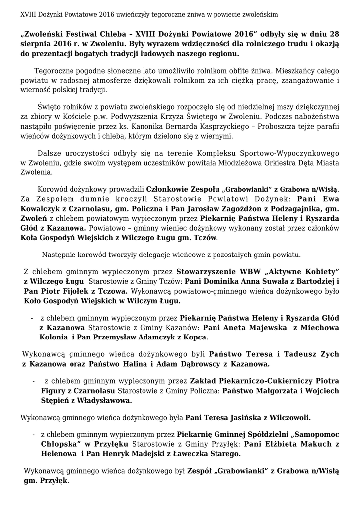 XVIII Dożynki Powiatowe 2016 uwieńczyły tegoroczne żniwa w powiecie zwoleńskim „Zwoleński Festiwal Chleba – XVIII Dożynki Powiatowe 2016” odbyły się w dniu 28 sierpnia 2016 r. w Zwoleniu. Były wyrazem wdzięczności dla rolniczego trudu i okazją do prezentacji bogatych tradycji ludowych naszego regionu. Tegoroczne pogodne słoneczne lato umożliwiło rolnikom obfite żniwa. Mieszkańcy całego powiatu w radosnej atmosferze dziękowali rolnikom za ich ciężką pracę, zaangażowanie i wierność polskiej tradycji. Święto rolników z powiatu zwoleńskiego rozpoczęło się od niedzielnej mszy dziękczynnej za zbiory w Kościele p.w. Podwyższenia Krzyża Świętego w Zwoleniu. Podczas nabożeństwa nastąpiło poświęcenie przez ks. Kanonika Bernarda Kasprzyckiego – Proboszcza tejże parafii wieńców dożynkowych i chleba, którym dzielono się z wiernymi. Dalsze uroczystości odbyły się na terenie Kompleksu Sportowo-Wypoczynkowego w Zwoleniu, gdzie swoim występem uczestników powitała Młodzieżowa Orkiestra Dęta Miasta Zwolenia. Korowód dożynkowy prowadzili Członkowie Zespołu „Grabowianki” z Grabowa n/Wisłą. Za Zespołem dumnie kroczyli Starostowie Powiatowi Dożynek: Pani Ewa Kowalczyk z Czarnolasu, gm. Policzna i Pan Jarosław Zagożdżon z Podzagajnika, gm. Zwoleń z chlebem powiatowym wypieczonym przez Piekarnię Państwa Heleny i Ryszarda Głód z Kazanowa. Powiatowo – gminny wieniec dożynkowy wykonany został przez członków Koła Gospodyń Wiejskich z Wilczego Ługu gm. Tczów. Następnie korowód tworzyły delegacje wieńcowe z pozostałych gmin powiatu. Z chlebem gminnym wypieczonym przez Stowarzyszenie WBW „Aktywne Kobiety” z Wilczego Ługu Starostowie z Gminy Tczów: Pani Dominika Anna Suwała z Bartodziej i Pan Piotr Fijołek z Tczowa. Wykonawcą powiatowo-gminnego wieńca dożynkowego było Koło Gospodyń Wiejskich w Wilczym Ługu. - z chlebem gminnym wypieczonym przez Piekarnię Państwa Heleny i Ryszarda Głód z Kazanowa Starostowie z Gminy Kazanów: Pani Aneta Majewska z Miechowa Kolonia i Pan Przemysław Adamczyk z Kopca. Wykonawcą gminnego wieńca dożynkowego byli Państwo Teresa i Tadeusz Zych z Kazanowa oraz Państwo Halina i Adam Dąbrowscy z Kazanowa. - z chlebem gminnym wypieczonym przez Zakład Piekarniczo-Cukierniczy Piotra Figury z Czarnolasu Starostowie z Gminy Policzna: Państwo Małgorzata i Wojciech Stępień z Władysławowa. Wykonawcą gminnego wieńca dożynkowego była Pani Teresa Jasińska z Wilczowoli. - z chlebem gminnym wypieczonym przez Piekarnię Gminnej Spółdzielni „Samopomoc Chłopska” w Przyłęku Starostowie z Gminy Przyłęk: Pani Elżbieta Makuch z Helenowa i Pan Henryk Madejski z Ławeczka Starego. Wykonawcą gminnego wieńca dożynkowego był Zespół „Grabowianki” z Grabowa n/Wisłą gm. Przyłęk. XVIII Dożynki Powiatowe 2016 uwieńczyły tegoroczne żniwa w powiecie zwoleńskim - z chlebem gminnym wypieczonym przez Piekarnię Pana Tomasza Makucha ze Zwolenia Starostowie z Gminy Zwoleń: Państwo Bożena i Andrzej Stępień z Jasieńca Soleckiego. Wykonawcą gmino-parafialnego wieńca dożynkowego byli Pani Bożena Kuropieska Sołtys wsi Józefów i mieszkańcy wsi Józefów. Na końcu korowodu delegacja Rady Powiatowej Mazowieckiej Izby Rolniczej w Zwoleniu z wieńcem dożynkowym wykonanym przez Stowarzyszenie „Wspólnota Kazanowa”. Najważniejszą częścią Święta Plonów było przekazanie przez Starostów Powiatowych Dożynek Staroście Zwoleńskiemu Waldemarowi Urbańskiemu chleba wypieczonego z mąki z tegorocznego zboża. Piękne bochny otrzymali także z rąk Starostów Gminnych Burmistrz Zwolenia i wójtowie gmin. Wszyscy Gospodarze pełni wdzięczności dziękowali za otrzymane chleby i obiecali sprawiedliwie je podzielić. Po ceremonii dzielenia chleba Starosta Waldemar Urbański wraz z Burmistrz Zwolenia Bogusławą Jaworską powitał liczne grono zacnych gości, a wśród nich: Posłów na Sejm RP Annę Kwiecień, Andrzeja Kosztowniaka, Wojciecha Skurkiewicza i Roberta Mordaka, Rafała Rajkowskiego – Członka Zarządu Województwa Mazowieckiego, Zbigniewa Gołąbka – Radnego Sejmiku Woj. Mazowieckiego i Stanisława Kacperczyka – Prezesa Polskiego Związku Producentów Roślin Zbożowych. Przemówienie okolicznościowe wygłosił Starosta Waldemar Urbański. Zauważył m.in., że Dożynki to najważniejsze i najpiękniejsze w roku święto gospodarskie rolników będące podsumowaniem i ukoronowaniem całorocznego trudu. To radość i odpoczynek po ciężkiej pracy. Dożynki są ważne dla wszystkich, bo przypominają, że to dzięki właśnie ciężkiej pracy rolnika codziennie trafia na stoły w naszych domach polski chleb. O rolnikach tak pięknie powiedział nasz Wielki Rodak Jan Paweł II „Oddaję hołd spracowanym rękom polskiego rolnika. Tym rękom które z trudnej ciężkiej ziemi wydobywały chleb dla kraju, a w chwilach zagrożenia były gotowe tej ziemi strzec i bronić.” I jeszcze jedna wypowiedź, przywódcy ludowców Wincentego Witosa :„ W chłopie żyje i odradza się naród, z niego czerpie siłę państwo. On najwięcej daje, najmniej wymaga. Bez niego nie ma i nie może być zdrowego narodu i silnego państwa.” Następnie podziękował słowami: Drodzy Rolnicy, dzisiaj jako Starosta Zwoleński w imieniu władz Powiatu, Pani Burmistrz Zwolenia, Wójtów i władz gmin Kazanów, Policzna , Przyłęk i Tczów, pragnę podziękować wam za codzienny trud i zmagania z warunkami natury, które nie zawsze sprzyjają Waszej ciężkiej pracy. Jesteśmy Wam, drodzy rolnicy wdzięczni za wasz upór i determinację w pokonywaniu codziennych problemów za Waszą ciężką pracę. Na zakończenie Starosta życzył rolnikom: dużo zdrowia, satysfakcji z wykonywanego zawodu Rolnika oraz większej stabilizacji ekonomicznej waszych gospodarstw i jednoznacznej polityki rządu, że gospodarstwa rodzinne są podstawą polskiej gospodarki rolnej . XV