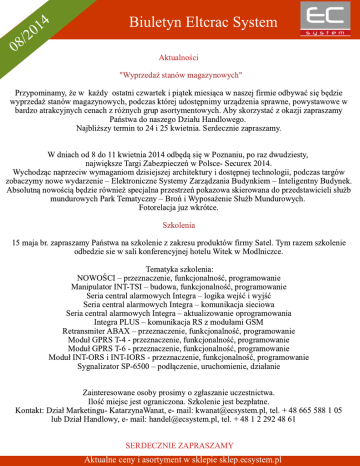 4 1 0 2 / 08 Biuletyn Eltcrac System Aktualności "Wyprzedaż stanów magazynowych" Przypominamy, że w każdy ostatni czwartek i piątek miesiąca w naszej firmie odbywać się będzie wyprzedaż stanów magazynowych, podczas której udostępnimy urządzenia sprawne, powystawowe w bardzo atrakcyjnych cenach z różnych grup asortymentowych. Aby skorzystać z okazji zapraszamy Państwa do naszego Działu Handlowego. Najbliższy termin to 24 i 25 kwietnia. Serdecznie zapraszamy. W dniach od 8 do 11 kwietnia 2014 odbędą się w Poznaniu, po raz dwudziesty, największe Targi Zabezpieczeń w Polsce- Securex 2014. Wychodząc naprzeciw wymaganiom dzisiejszej architektury i dostępnej technologii, podczas targów zobaczymy nowe wydarzenie – Elektroniczne Systemy Zarządzania Budynkiem – Inteligentny Budynek. Absolutną nowością będzie również specjalna przestrzeń pokazowa skierowana do przedstawicieli służb mundurowych Park Tematyczny – Broń i Wyposażenie Służb Mundurowych. Fotorelacja juz wkrótce. Szkolenia 15 maja br. zapraszamy Państwa na szkolenie z zakresu produktów firmy Satel. Tym razem szkolenie odbedzie sie w sali konferencyjnej hotelu Witek w Modlniczce. Tematyka szkolenia: NOWOŚCI – przeznaczenie, funkcjonalność, programowanie Manipulator INT-TSI – budowa, funkcjonalność, programowanie Seria central alarmowych Integra – logika wejść i wyjść Seria central alarmowych Integra – komunikacja sieciowa Seria central alarmowych Integra – aktualizowanie oprogramowania Integra PLUS – komunikacja RS z modułami GSM Retransmiter ABAX – przeznaczenie, funkcjonalność, programowanie Moduł GPRS T-4 - przeznaczenie, funkcjonalność, programowanie Moduł GPRS T-6 - przeznaczenie, funkcjonalność, programowanie Moduł INT-ORS i INT-IORS - przeznaczenie, funkcjonalność, programowanie Sygnalizator SP-6500 – podłączenie, uruchomienie, działanie Zainteresowane osoby prosimy o zgłaszanie uczestnictwa. Ilość miejsc jest ograniczona. Szkolenie jest bezpłatne. Kontakt: Dział Marketingu- KatarzynaWanat, e- mail: [email protected], tel. + 48 665 588 1 05 lub Dział Handlowy, e- mail: [email protected], tel. + 48 1 2 292 48 61 SERDECZNIE ZAPRASZAMY Aktualne ceny i asortyment w sklepie sklep.ecsystem.pl K Ciekawostki oszt powstania Kingdom Tower jest szacowany na 1,23 miliarda dolarów. Wewnątrz będzie można zagospodarować niebywałą powierzchnię aż 54 hektarów. Wykonawcą będzie Saudi Binladin Group (rodzina Osamy bin Ladena). Inwestycja obejmie nie tylko budowę wieży, ale i powstałą wokół budynku dzielnicę o powierzchni 23 mln metrów kwatratowych. W dystrykcie zamieszka ponad 80 000 osób, a w kompleksie mieszkalnym pod Kingdom Tower znajdą się sklepy, centra rozrywki oraz szpital. Na wysokości 610 metrów, na 157 piętrze będzie ogromny taras z widokiem na Morze Czerwone, który tym samym będzie najwyżej położonym punktem obserwacyjnym na świecie. Oczywiście w budowli nie zabraknie "ukłonów" w stronę odnawialnych źródeł energii. Szczyt wieży zarezerwowano dla rozwiązań wytwarzających alternatywną energię. W wieży znajdą się między innymi biura, ekskluzywne sklepy, hotele oraz usytuowane na najwyższych piętrach luksusowe apartamenty.W budynku ma się znajdować 59 wind. Wjechanie z parteru na sam szczyt (275 kondygnacji), standardowymi windami, zajmie około 12 minut, a w przypadku ekspresowych, skróci się do około 5 minut. Aktualnie najwyższym budynkiem świata jest mierzący 829 metrów Burdż Chalifa, który góruje nad Dubajem w Zjednoczonych Emiratach Arabskich. Kingdom Tower został zaprojektowany przez Adrian Smith & Gordon Gill Architecture, firmę z Chicago, która stworzyła dotychczasowego rekordzistę z Dubaju. Przekrój budynku ma przypominać kształtem jeden z lokalnych kwiatów pustynnych. Już 27 kwietnia ruszy budowa najwyższego wieżowca świata, który będzie nosił nazwę Kingdom Tower. Stanie on w mieście Dżudda w Arabii Saudyjskiej i, według planów architektów, ma mieć co najmniej kilometr wysokości. Ten oszałamiający projekt należy do Kingdom Holding Company, kierowanego przez księcia Alwalida bin Talala. Opracowanie: Katarzyna Wanat Netografia: www. gadzetomania.pl www.onet.pl www.newsweeek.pl www.interia.pl www.homesthetics.net Aktualne ceny i asortyment w sklepie sklep.ecsystem.pl Firma MicroMade wprowadziła na rynek nowe rozwiązanie dla rowerzystów- system parkingów rowerowych, których zadaniem jest zwiększenie skuteczności zabezpieczenia przed kradzieżą pozostawianych na parkingach rowerów. Parking składa się z szeregu zamków ZR-02 obsługiwanych przez jedną centralkę CR-01. Zamek obsługiwany jest przez karty typu Mifare®, które stosowane są jako karty miejskie, legitymacje studenckie, itp. Zamek ZR-02 ma formę prostopadłościanu o wymiarach 26,5 × 22,5 × 7,5 cm wykonanego ze stali nierdzewnej. Zamki są instalowane na specjalnie do tego przygotowanych wspornikach za pomocą stalowych nitów. Okablowanie zamków poprowadzone jest we wnętrzu tych wsporników. W górnej części zamka, do jego bocznych ścian przymocowane są dwie stalowe liny służące do zabezpieczenia rowerów. Liny zakończone są bolcami współpracującymi z elektronicznie sterowanymi ryglami umieszczonymi w dolnej części zamka. Liny są zabezpieczone elektronicznie - zamek wykrywa przecięcie liny. Zapięcie roweru wymaga aktywowania zamka jednym z dwu przycisków umieszczonych na jego frontowej ścianie (zależnie od wybranego rygla) i zbliżeniu do czytnika uprawnionej do zapięcia roweru karty. Otwarcie rygla jest możliwe tylko tą samą kartą, którą nastąpiło jego zamknięcie. Informacja o otwarciu obudowy któregoś z zamków, lub naruszeniu zabezpieczenia liny trafia do centralki CR-01, która uruchamia system alarmowy i przekazuje informację o tym fakcie do centrum Systemu Parkingów Rowerowych. Specyfikacja techniczna: • Zasilanie:12V DC • Pobó