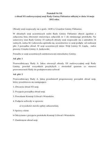 Protokół Nr XX z obrad XX nadzwyczajnej sesji Rady Gminy Pabianice odbytej w dniu 14 maja 2012 roku. " ! Obrady sesji rozpoczęły się o godz. 14:00 w Urzędzie Gminy Pabianice. # W obradach sesji uczestniczyli radni Rady Gminy Pabianice obecni zgodnie z załączoną listą obecności stanowiąca załącznik nr 1 do niniejszego protokołu. Na ustawowy stan Rady Gminy 15 radnych obrady sesji rozpoczęły się z udziałem 14 radnych, radna M. Lubowicka spóźniła się, uczestnictwo w sesji podjęła od realizacji pkt. 3 porządku obrad. W sesji uczestniczyli także: Wójt Gminy H. Gajda, radca prawny Urzędu Gminy A. Jankowski.# Ponadto w sesji uczestniczyli zainteresowani mieszkańcy Gminy.# Ad. pkt. 1 " Przewodniczący Rady A. Jaksa otworzył obrady XX nadzwyczajnej sesji Rady Gminy, powitał wszystkich przybyłych i stwierdził quorum co stanowi prawomocność Rady do podejmowania uchwał. # Ad. pkt. 2" Przewodniczący Rady A. Jaksa przedstawił proponowany porządek obrad sesji, który przedstawia się następująco:# 1. Otwarcie obrad XX sesji.# 2. Przyjęcie porządku obrad sesji.# 3. Powołanie Komisji Uchwał i Wniosków.# 4. Podjęcie uchwały w sprawie:# # a) wysokości stawki opłaty adiacenckiej.# 5. Sprawy różne. # 6 Odczytanie i przyjęcie protokołu Komisji Uchwał i Wniosków.# 7. Zamknięcie obrad sesji. # Do porządku obrad radni nie wnieśli uwag, został przyjęty w głosowaniu jednomyślnie. # Ad. pkt. 3" Do Komisji Uchwał i Wniosków powołano radną C. Rychłowską i radnego H. Szafrańskiego.# Skład Komisji został przyjęty w głosowaniu jednomyślnie. # Ad. pkt. 4" Komisja Uchwał i Wniosków przedłożyła Radzie Gminy projekt uchwały przygotowany przez Wójta Gminy w sprawie wysokości stawki procentowej opłaty adiacenckiej.# Wójt w przedłożonym projekcie uchwały proponuje stawę 50 % opłaty adiacenckiej z tytułu wzrostu wartości nieruchomości spowodowanej budową urządzeń infrastruktury technicznej jako różnicę między wartością jaką nieruchomość miała przed wybudowaniem urządzeń infrastruktury technicznej a wartością jaką nieruchomość ma po ich wybudowaniu. # Przewodniczący otworzył nad powyższym dyskusję. # Radny A. Skawiński przypomniał, że na ostatniej sesji, na której Rada Gminy nie wprowadziła do porządku obrad na wniosek Wójta projektu tej uchwały była informacja, że projekt tej uchwały nie został omówiony przez Komisę GospodarczoFinansową. Radny zapytał, czy jest wypracowana opinia Komisji GospodarczoFinansowej w tej sprawie. Zapytał też dlaczego na tę sesję nie zostali zaproszeni sołtysi Gminy.# Głos zabrał Przewodniczący Komisji Gospodarczo-Finansowej M. Gryska informując, że nie zwołał posiedzenia Komisji, której przewodniczy, uważał, że sesja nadzwyczajna zwołana tylko w tej sprawie umożliwi dyskusję w szerszym gremium.# Przewodniczący Komisji Gospodarczo Finansowej postawił wniosek o ustalenie 35 % opłaty adiacenckiej z tytułu wzrostu wartości nieruchomości spowodowanej budową urządzeń infrastruktury.# Radna Z. Kasperska powiedziała, że jest zaskoczona przedłożonym projektem uchwały w innej wersji niż była przedkładana na poprzedniej sesji Rady Gminy i wcześniej przez Wójta na Komisji Samorządowo – Społecznej i Organizacyjnej. W pierwotnej wersji nie było zapisów, że tracą moc uchwały Nr XXXII/204/2005 z dnia 27 kwietnia 2005 r. w sprawie wysokości stawki procentowej opłaty adiacenckiej, Nr XII/71/2007 z dnia 29 sierpnia 2007 r. w sprawie wysokości stawki procentowej opłaty adiacenckiej.# Radna powiedziała, że powyższe uchwały, które proponuje się by traciły moc były podejmowane przez Radę Gminy w czasie kiedy pełniła też funkcję radnej. Radna wyraziła obawę do tego co może być później jak wyraziła "będziemy podejmować nowe uchwały, a następnie je w kolejnych kadencjach uchylać” # Głos zabrał radca prawny Urzędu Gminy A. Jankowski informując, że po przeanalizowaniu okoliczności w jakich były podejmowane poprzednie uchwały w tej chwili przedkłada się Radzie Gminy uchwałę, która merytorycznie nic nie zmienia, jedynie reguluje prawo dla mieszkańców całej Gminy. # ! Radna J. Szafran – temat dotyczący opłaty adiacenckiej był omawiany na Komisji Samorządowo-Społecznej, nie był natomiast omawiany na Komisji GospodarczoFinansowej.# ! Radny M. Gryska – uważam, że sesja nadzwyczajna jest zwołana w tym celu, aby w jak największym gremium podyskutować w tej sprawie. # ! Radny A. Skawiński - nie wprowadzanie projektu uchwały w sprawie wysokości stawki opłaty adiacenckiej pod obrady poprzedniej sesji to był warunek, że Komisja Gospodarczo-Finansowa zapozna się dokładnie z tym projektem uchwały, ponownie zapytał dlaczego Komisja się nie odbyła się. # ! Przewodniczący Rady A. Jaksa odpowiadając na pytanie poinformował, że wraz z Przewodniczącym Komisji Gospodarczo-Finansowej doszli do wniosku, iż projekt uchwały znany jest bardzo dokładnie wszystkim radnym, przed poprzednią sesją Rady Gminy był przez Wójta Gminy przedkładany na dwóch posiedzeniach Komisji Rady Gminy tj. Komisji Ochrony Środowiska i Rozwoju oraz na Komisji Samorządowo-Społecznej i Organizacyjnej. Nie był jedynie przedkładany na Komisji Gospodarczo-Finansowej, ale większość radnych Komisji Gospodarczo-Finansowej są także członkami tych Komisji, na których projekt był omawiany.# ! Głównym argumentem aby nie przyjąć wniosku Wójta o wprowadzenie tego projektu uchwały pod obrady sesji było tylko to, że byłby on wprowadzony poza standardowym działaniem; to jest poza porządkiem obrad, który radni już wcześniej wraz z całym kompletem uchwał otrzymali. Uchwała swym przedmiotem dotyka budżetów domowych wszytkich mieszkańców gminy. Wprowadzenie jej bez odpowiedniego czasu na konsultacje w trybie nadzwyczajnym jest niedopuszczalne. Uchwala ta może się okazać z punktu widzenia mieszkań