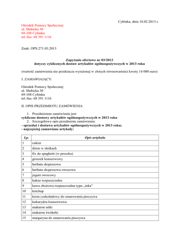 Cybinka, dnia 18.02.2013 r. Ośrodek Pomocy Społecznej ul. Słubicka 30 69-108 Cybinka tel./fax: 68 391 1116 Znak: OPS.271.03.2013 Zapytanie ofertowe nr 03/2013 dotyczy cyklicznych dostaw artykułów ogólnospożywczych w 2013 roku (wartość zamówienia nie przekracza wyrażonej w złotych równowartości kwoty 14 000 euro) I. ZAMAWIAJĄCY: Ośrodek Pomocy Społecznej ul. Słubicka 30 69-108 Cybinka tel./fax: 68 391 1116 II. OPIS PRZEDMIOTU ZAMÓWIENIA 1. Przedmiotem zamówienia jest: cykliczne dostawy artykułów ogólnospożywczych w 2013 roku 2. Szczegółowy opis przedmiotu zamówienia: - sprzedaż i dostawa artykułów ogólnospożywczych w 2013 roku; - najczęściej zamawiane artykuły: Lp. Opis artykułu 1 cukier 2 dżem w słoikach 3 fix do spaghetti (w proszku) 4 groszek konserwowy 5 herbata ekspresowa 6 herbata ekspresowa owocowa 7 jogurt owocowy 8 kakao rozpuszczalne 9 kawa zbożowa rozpuszczalna typu „inka” 10 ketchup 11 krem czekoladowy do smarowania pieczywa 12 kukurydza konserwowa 13 makaron nitki 14 makaron świderki 15 margaryna do smarowania pieczywa Lp. Opis artykułu 16 mąka wrocławska 17 mleko 18 ogórki konserwowe 19 olej 20 paprykarz 21 pasztet w puszkach 22 sok (syrop owocowy) 23 sól Zamówienia będą dokonywane według potrzeb Ośrodka Pomocy Społecznej w Cybince. Sposób zapłaty: przelew – 14 dni od dnia otrzymania faktury. 3. Zamawiający nie dopuszcza możliwości składania ofert częściowych. 4. Zamawiający nie dopuszcza możliwości powierzenia części lub całości zamówienia podwykonawcom. III. TERMIN WYKONANIA ZAMÓWIENIA Termin wykonania przedmiotu zamówienia: zamówienia będą dokonywane cyklicznie według potrzeb Ośrodka Pomocy Społecznej w Cybince. IV. OPIS SPOSOBU PRZYGOTOWANIA OFERTY Oferent powinien złożyć ofertę na formularzu załączonym do niniejszego zapytania. Oferta powinna: 1) być opatrzona pieczątką firmową, 2) posiadać datę sporządzenia, 3) zawierać adres lub siedzibę oferenta, numer telefonu, numer NIP, 4) być podpisana czytelnie przez wykonawcę. V. MIEJSCE ORAZ TERMIN SKŁADANIA OFERT 1) Oferta powinna być przesłana za pośrednictwem: poczty elektronicznej na adres [email protected] lub faksem na numer 68 391 1116 lub poczty lub kuriera lub też dostarczona osobiście na adres Ośrodka Pomocy Społecznej, ul. Słubicka 30, 69-108 Cybinka do dnia 25 lutego 2013 r., 2) Ocena ofert zostanie dokonana w dniu 26 lutego 2013 r., a wyniki i wybór najkorzystniejszej oferty zostaną ogłoszone w siedzibie Ośrodka Pomocy Społecznej w Cybince o o godz. 14:30, 3) Oferty złożone po terminie nie będą rozpatrywane, 4) Oferent może przed upływem terminu składania ofert zmienić lub wycofać swoją ofertę, 5) W toku badania i oceny ofert Zamawiający może żądać od oferentów wyjaśnień dotyczących treści złożonych ofert. VI. OCENA OFERT Zamawiający dokona oceny ważnych ofert na podstawie następujących kryteriów: 1) cena – 90% 2) termin dostawy liczony od dnia złożenia zamówienia – 10% VII. INFORMACJE DOTYCZĄCE WYBORU NAJKORZYSTNIEJSZEJ OFERTY O wyborze najkorzystniejszej oferty Zamawiający zawiadomi oferentów za pośrednictwem faksu bądź poczty elektronicznej, wskazując jednocześnie datę i miejsce podpisania umowy. VIII. DODATKWE INFORMACJE Dodatkowych informacji udziela się pod numerem telefonu 68 391 1116 IX. ZAŁĄCZNIKI 1) formularz „Oferta na sprzedaż i dostawę artykułów ogólnospożywczych w 2013 roku dla Ośrodka Pomocy Społecznej w Cybince” Renata Kubiak Kierownik Ośrodka Pomocy Społecznej Załącznik 1 Oferta na sprzedaż i dostawę artykułów ogólnospożywczych w 2013 roku dla Ośrodka Pomocy Społecznej w Cybince Lp. Opis artykułu 1 cukier 2 dżem w słoikach 3 fix do spaghetti (w proszku) 4 groszek konserwowy 5 herbata ekspresowa 6 herbata ekspresowa owocowa 7 jogurt owocowy 8 kakao rozpuszczalne 9 kawa zbożowa rozpuszczalna typu „inka” 10 ketchup 11 krem czekoladowy do smarowania pieczywa 12 kukurydza konserwowa 13 makaron nitki 14 makaron świderki 15 margaryna do smarowania pieczywa 16 mąka wrocławska 17 mleko 18 ogórki konserwowe 19 olej 20 paprykarz 21 pasztet w puszkach 22 sok (syrop owocowy) 23 jednostka miary (waga, pojemność, itp.) Proponowana cena netto sól 1) pieczątka firmowa Oferenta 2) data sporządzenia oferty …............................................. 3) adres lub siedzibę Oferenta, numer telefonu, numer NIP …................................................................................................................................................... ....................................................................................................................................................... ...................................................................................................................... 4) czytelny podpis Oferenta ….....................................................................................