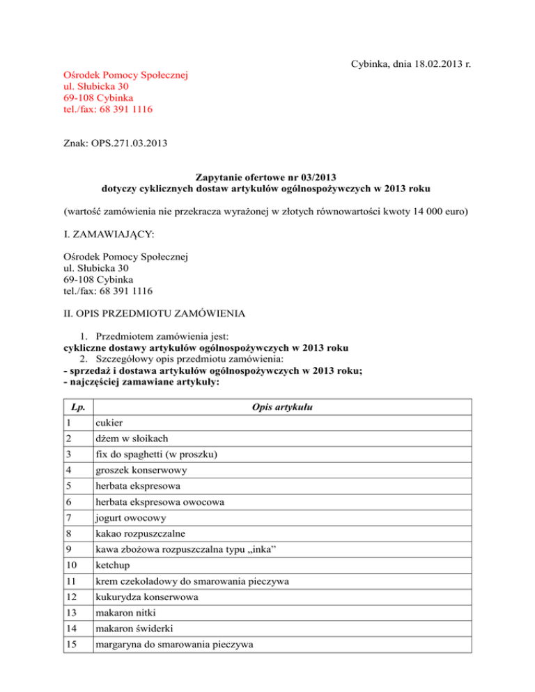 artykuły ogólnospożywcze zaproszenie do składania ofert na