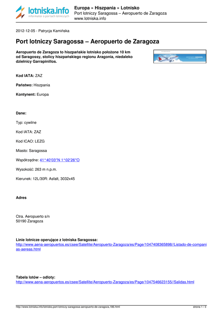 Europa » Hiszpania » Lotnisko Port lotniczy Saragossa – Aeropuerto de Zaragoza www.lotniska.info 2012-12-05 - Patrycja Kamińska Port lotniczy Saragossa – Aeropuerto de Zaragoza Aeropuerto de Zaragoza to hiszpańskie lotnisko położone 10 km od Saragossy, stolicy hiszpańskiego regionu Aragonia, niedaleko dzielnicy Garrapinillos. Kod IATA: ZAZ Państwo: Hiszpania Kontynent: Europa Dane: Typ: cywilne Kod IATA: ZAZ Kod ICAO: LEZG Miasto: Saragossa Współrzędne: 41°40′03″N 1°02′26″O Wysokość: 263 m n.p.m. Kierunek: 12L/30R: Asfalt, 3032x45 Adres Ctra. Aeropuerto s/n 50190 Zaragoza Linie lotnicze operujące z lotniska Saragossa: http://www.aena-aeropuertos.es/csee/Satellite/Aeropuerto-Zaragoza/es/Page/1047408365898//Listado-de-compani as-aereas.html Tabela lotów – odloty: http://www.aena-aeropuertos.es/csee/Satellite/Aeropuerto-Zaragoza/es/Page/1047546623155//Salidas.html http://www.lotniska.info/lotnisko,port-lotniczy-saragossa-aeropuerto-de-zaragoza,186.html strona 1 / 3 Europa » Hiszpania » Lotnisko Port lotniczy Saragossa – Aeropuerto de Zaragoza www.lotniska.info Tabela lotów – przyloty: http://www.aena-aeropuertos.es/csee/Satellite/Aeropuerto-Zaragoza/es/Page/1047555174469//Llegadas.html Prezentacja nowego terminalu na lotnisku Saragossa: HISTORIA Lotnisko położone jest 10 km od Saragossy, stolicy hiszpańskiego regionu Aragonia, niedaleko dzielnicy Garrapinillos. Kilka lat temu port ten został przebudowany i odnowiony w związku z wystawą Expo, która odbyła się w Saragossie w 2008 roku. Stolica Aragonii jest najbardziej zaludnionym miastem Hiszpanii i znajduje się w odległości około 300 km od Madrytu, Barcelony i Walencji. Przy okazji Expo 2008 dokonano całkowitej renowacji tego lotniska w ramach międzynarodowego konkursu na nowy terminal. Budynek autorstwa architektów Vidal y Asociados został oddany do użytku w marcu 2008 roku. Stary terminal obecnie nie jest używany, jednak jego budynek nadal pozostanie na lotnisku. Statystyki Pasażerowie Operacje Ładunki (kg) 246.720 10.932 3.613.634 7 6 5 4 3 2 9 1 4 5 9 3 2 Lądowanie na lotnisku Saragossa: DOJAZD http://www.lotniska.info/lotnisko,port-lotniczy-saragossa-aeropuerto-de-zaragoza,186.html strona 2 / 3 Europa » Hiszpania » Lotnisko Port lotniczy Saragossa – Aeropuerto de Zaragoza www.lotniska.info Dojazd do centrum Saragossy z lotniska waha się pomiędzy 15-20 minutami, w zależności od środka transportu. Taxi Średnia cena za kurs z lotniska do centrum Saragossy wynosi 25€. Postój taksówek znajduje się tuż przy wyjściu z terminalu. Taksówkę można zamówić pod numerem telefonu: +34 976 38 38 38; +34 976 750 962 Samochód Na lotnisku znajdują się następujące wypożyczalnie samochodów: Atesa (Tel: +34 976352805) Avis (Tel: +34 976349062) Europcar (Tel: +34 976232363) Hertz (Tel: +34 976320400) Autobus Linia autobusowa łączy dworzec autobusowy w Saragossie (Paseo María Agustín, 7) i lotnisko. Dojazd do centrum trwa około 20 – 30 minut, a bilet kosztuje 1,60€. Rozkład jazdy z Saragossy obowiązuje od poniedziałku do soboty w godzinach 5.30 do 22.30, zaś z lotniska od 6.15 do 23.15 co pół godziny, natomiast w niedziele autobus jeździ co godzinę. Więcej informacji pod numerem telefonu: +34 902 490 690 Parking Na lotnisku dostępny jest parking o pojemności 400 pojazdów. Strona internetowa lotniska w Saragossie: http://www.zaragoza-airport.com/es/index.php http://www.lotniska.info/lotnisko,port-lotniczy-saragossa-aeropuerto-de-zaragoza,186.html http://www.lotniska.info/lotnisko,port-lotniczy-saragossa-aeropuerto-de-zaragoza,186.html Powered by TCPDF (www.tcpdf.org) strona 3 / 3