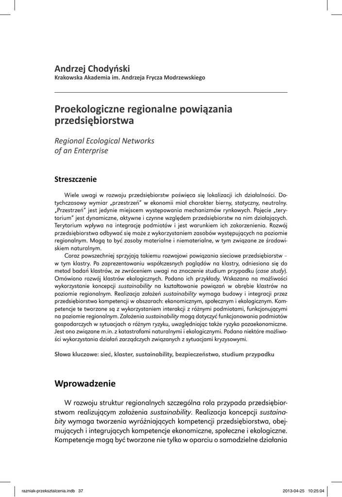 Andrzej Chodyński Krakowska Akademia im. Andrzeja Frycza Modrzewskiego Proekologiczne regionalne powiązania przedsiębiorstwa Regional Ecological Networks of an Enterprise Streszczenie Wiele uwagi w rozwoju przedsiębiorstw poświęca się lokalizacji ich działalności. Dotychczasowy wymiar „przestrzeń” w ekonomii miał charakter bierny, statyczny, neutralny. „Przestrzeń” jest jedynie miejscem występowania mechanizmów rynkowych. Pojęcie „terytorium” jest dynamiczne, aktywne i czynne względem przedsiębiorstw na nim działających. Terytorium wpływa na integrację podmiotów i jest warunkiem ich zakorzenienia. Rozwój przedsiębiorstwa odbywać się może z wykorzystaniem zasobów występujących na poziomie regionalnym. Mogą to być zasoby materialne i niematerialne, w tym związane ze środowiskiem naturalnym. Coraz powszechniej sprzyjają takiemu rozwojowi powiązania sieciowe przedsiębiorstw – w tym klastry. Po zaprezentowaniu współczesnych poglądów na klastry, odniesiono się do metod badań klastrów, ze zwróceniem uwagi na znaczenie studium przypadku (case study). Omówiono rozwój klastrów ekologicznych. Podano ich przykłady. Wskazano na możliwości wykorzystanie koncepcji sustainability na kształtowanie powiązań w obrębie klastrów na poziomie regionalnym. Realizacja założeń sustainability wymaga budowy i integracji przez przedsiębiorstwo kompetencji w obszarach: ekonomicznym, społecznym i ekologicznym. Kompetencje te tworzone są z wykorzystaniem interakcji z różnymi podmiotami, funkcjonującymi na poziomie regionalnym. Założenia sustainability mogą dotyczyć funkcjonowania podmiotów gospodarczych w sytuacjach o różnym ryzyku, uwzględniając także ryzyko pozaekonomiczne. Jest ono związane m.in. z katastrofami naturalnymi i ekologicznymi. Podano niektóre możliwości wykorzystania działań zarządczych związanych z sytuacjami kryzysowymi. Słowa kluczowe: sieć, klaster, sustainability, bezpieczeństwo, studium przypadku Wprowadzenie W rozwoju struktur regionalnych szczególna rola przypada przedsiębiorstwom realizującym założenia sustainability. Realizacja koncepcji sustainabity wymaga tworzenia wyróżniających kompetencji przedsiębiorstwa, obejmujących i integrujących kompetencje ekonomiczne, społeczne i ekologiczne. Kompetencje mogą być tworzone nie tylko w oparciu o samodzielne działania razniak-przeksztalcenia.indb 37 2013-04-25 10:25:04 - Andrzej Chodyński - podmiotów gospodarczych. W coraz większym stopniu powinny uwzględniać możliwości tkwiące w budowie powiązań sieciowych, które mogą być tworzone z wykorzystaniem zarządzania wiedzą, w szczególności w drodze jej dyfuzji pomiędzy partnerami sieciowymi. Kompetencje sustainability powinny być tworzone zarówno dla działalności w sytuacjach bez występowania jak i z występowaniem sytuacji kryzysowych. Można je wiązać, ze względu na zakres merytoryczny, z koncepcją CSR (Corporate Social Responsibility – społeczna odpowiedzialność biznesu). Kompetencje ekologiczne mogą się przejawiać jako odpowiedni poziom jakości i innowacyjności ekologicznej. Szczególne znaczenie przy ich tworzeniu ma realizacja przedsiębiorczości ekologicznej (Chodyński 2011). Kompetencje społeczne opisano w publikacji A. Chodyńskiego i W. Huszlaka (Chodyński et al. 2011). Kompetencje społeczne w literaturze rozpatrywane są jako wymagające kontaktów z ludźmi, ale rozpatruje się je także w wymiarze organizacyjnym. Wówczas wiąże się je z kulturą organizacji, jej charakterem, innowacyjnością i szybkością działania (Ulrich et al. 2004). Kompetencje związane z poszanowaniem środowiska naturalnego (ekologiczne) mogą być rozpatrywane także w ramach kompetencji społecznych (Oleksyn 2010). W literaturze przedmiotu zwraca się uwagę na wzrost znaczenia społecznej odpowiedzialności przedsiębiorstwa (w związku z dotykającym go kryzysem) wobec partnerów zewnętrznych i wewnętrznych a także wobec regionu, w którym funkcjonuje (Godziszewski et al. 2011). Podkreśla się, że kryzys może mieć zarówno charakter ekonomiczny, jak i pozaekonomiczny. Ten ostatni może być wywołany przez różnego typu katastrofy: żywioły (powódź, trzęsienie ziemi, trąba powietrzna), katastrofy przemysłowe, wojny i niepokoje społeczne a także działania terrorystyczne. Wskazuje się na etapy działań zarządczych w sytuacjach kryzysowych wywołanych czynnikami pozaekonomicznymi (wykrycie sygnału, przygotowanie i realizacja działań prewencyjnych, ograniczanie szkód, przywracanie sytuacji sprzed kryzysu oraz absorpcja wiedzy związanej z kryzysem). Podkreśla się znaczenie działań przygotowawczych odnośnie tego typu kryzysu, obejmujących określenie prawdopodobnych, groźnych dla przedsiębiorstwa zdarzeń, przygotowanie scenariuszy rozwoju sytuacji kryzysowej, opracowanie planów i procedur postępowania dla każdego ze scenariuszy (w tym: przygotowanie zespołów antykryzysowych), określenie kanałów przepływu informacji a także środków ich przekazu (Mitroff et al. 1998; Godziszewski et al. 2011). Realizacja koncepcji sustainability powinna skłaniać podmioty gospodarcze do tworzenia powiązań i podejmowania działań z różnymi podmiotami z sektora społecznego i publicznego dla jak najlepszego przygotowania się do sytuacji wystąpienia kryzysu o charakterze pozaekonomicznym. Brać należy przy tym pod uwagę także różnego typu zagrożenia, bez względu na 38 razniak-przeksztalcenia.indb 38 2013-04-25 10:25:04 - Proekologiczne regionalne powiązania przedsiębiorstwa - ich kryterium przedmiotowe: zarówno naturalne jako skutek klęsk i katastrof żywiołowych oraz cywilizacyjne (jako następstwo działalności człowieka). Występowanie zlokalizowanych katastrof – np. technologicznych lub naturalnych – w przypadku podmiotów na określonym terenie stanowi również zagrożenie dla znacznej ich części. Uczenie
