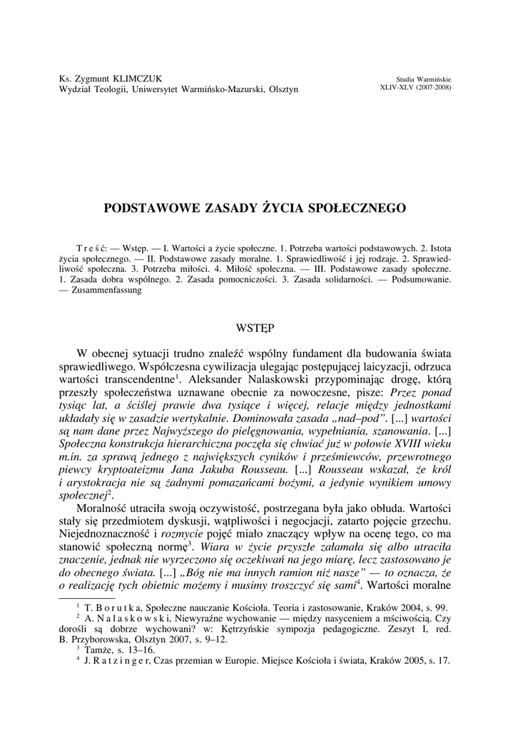 Ks. Zygmunt KLIMCZUK Wydział Teologii, Uniwersytet Warmińsko-Mazurski, Olsztyn Studia Warmińskie XLIV-XLV (2007-2008)  YCIA SPOŁECZNEGO PODSTAWOWE ZASADY Z T r e ś ć: — Wstep. — I. Wartości a z ycie społeczne. 1. Potrzeba wartości podstawowych. 2. Istota z ycia społecznego. — II. Podstawowe zasady moralne. 1. Sprawiedliwość i jej rodzaje. 2. Sprawiedliwość społeczna. 3. Potrzeba miłości. 4. Miłość społeczna. — III. Podstawowe zasady społeczne. 1. Zasada dobra wspólnego. 2. Zasada pomocniczości. 3. Zasada solidarności. — Podsumowanie. — Zusammenfassung WSTEP W obecnej sytuacji trudno znaleźć wspólny fundament dla budowania świata sprawiedliwego. Współczesna cywilizacja ulegajac postepujacej laicyzacji, odrzuca wartości transcendentne1. Aleksander Nalaskowski przypominajac droge, która przeszły społeczeństwa uznawane obecnie za nowoczesne, pisze: Przez ponad tysiac lat, a ściślej prawie dwa tysiace i wiecej, relacje miedzy jednostkami układały sie w zasadzie wertykalnie. Dominowała zasada „nad–pod”. [...] wartości sa nam dane przez Najwyzszego do pielegnowania, wypełniania, szanowania. [...] Społeczna konstrukcja hierarchiczna poczeła sie chwiać juz w połowie XVIII wieku m.in. za sprawa jednego z najwiekszych cyników i prześmiewców, przewrotnego piewcy kryptoateizmu Jana Jakuba Rousseau. [...] Rousseau wskazał, ze król i arystokracja nie sa zadnymi pomazańcami bozymi, a jedynie wynikiem umowy społecznej2. Moralność utraciła swoja oczywistość, postrzegana była jako obłuda. Wartości stały sie przedmiotem dyskusji, watpliwości i negocjacji, zatarto pojecie grzechu. Niejednoznaczność i rozmycie pojeć miało znaczacy wpływ na ocene tego, co ma stanowić społeczna norme3. Wiara w zycie przyszłe załamała sie albo utraciła znaczenie, jednak nie wyrzeczono sie oczekiwań na jego miare, lecz zastosowano je do obecnego świata. [...] „Bóg nie ma innych ramion niz nasze” — to oznacza, ze o realizacje tych obietnic mozemy i musimy troszczyć sie sami4. Wartości moralne 1 T. B o r u t k a, Społeczne nauczanie Kościoła. Teoria i zastosowanie, Kraków 2004, s. 99. A. N a l a s k o w s k i, Niewyraźne wychowanie — miedzy nasyceniem a mściwościa. Czy dorośli sa dobrze wychowani? w: Ketrzyńskie sympozja pedagogiczne. Zeszyt I, red. B. Przyborowska, Olsztyn 2007, s. 9–12. 3 Tamz e, s. 13–16. 4 J. R a t z i n g e r, Czas przemian w Europie. Miejsce Kościoła i świata, Kraków 2005, s. 17. 2 156 KS. ZYGMUNT KLIMCZUK w określonym przez technike społeczeństwie utraciły swoja oczywistość. Człowiek sam musi projektować moralność. Jedyna wartościa moralna jest przyszłe społeczeństwo, moralne jest to, co słuz y urzeczywistnieniu nowego społeczeństwa. W ten sposób nawet terroryzm rozwija sie z błogosławieństwem nauki i oświeconego ducha na wysublimowanych polach5.  YCIE SPOŁECZNE I. WARTOŚCI A Z 1. Potrzeba wartości podstawowych Na poczatku lat 70. dwudziestego wieku przedstawiciele katolickiej nauki społecznej, politycy i pedagodzy w Niemczech Zachodnich zwrócili uwage na potrzebe wiedzy i świadomości w zakresie wartości podstawowych w róz nych płaszczyznach z ycia społecznego. W społeczeństwie zdominowanym przez liberalizm i neoindywidualizm, rozpowszechniały sie orientacje na wartości samorealizacyjne, czyli zwiazane z prywatnościa jednostki i egoizmem, a traciły na znaczeniu orientacje na wartości, które domagaja sie poświecenia jednostki dla dobra wspólnego6. Kościół poszukujac płaszczyzny porozumienia z ludźmi dobrej woli, odwołuje sie do prawdy o człowieku. Zagroz enia godności człowieka zwiazane sa z błednymi koncepcjami osoby ludzkiej. Idea człowieka została zredukowana, co doprowadziło do totalitaryzmu, a obecnie prowadzi do wysiłków tworzenia nowego wspaniałego świata. George Weigel (filozof, teolog, dziennikarz) stwierdza: Jedna z podstawowych lekcji płynacych z XX wieku polega na tym, ze idee maja konsekwencje dobre i złe. Fałszywe koncepcje osoby ludzkiej, połaczone z nowoczesna technologia i zapośredniczone przez polityke państw narodowych, zamieniły wiek, który rozpoczał sie wielkimi nadziejami na przyszłość, w czas rzeźni7. Na ten dramat zwrócił uwage Jan Paweł II w adhortacji o sytuacji Kościoła w Europie Ecclesia in Europa (2003) Ojciec Świety piszac o gasnacej u Europejczyków nadziei, podkreślił utrate pamieci i dziedzictwa chrześcijańskiego, któremu towarzyszy swego rodzaju praktyczny agnostycyzm, obojetność religijna i lek przed przyszłościa. Warto takz e zwrócić uwage na trafna, chociaz bolesna diagnoze, postawiona przez kard. Josepha Ratzingera, obecnego papiez a Benedykta XVI. W dniu 28 listopada 2000 roku wygłosił on w Berlinie referat w czasie konferencji poświeconej Europie. Tytuł tego przedłoz enia: Europa — jej duchowe podstawy wczoraj, dziś i jutro. We wspomnianym referacie w Berlinie, Ratzinger analizujac współczesna sytuacje kulturowa i religijna na Starym Kontynencie odwołał sie do świadomości, z e budowanie jednej Europy wymaga nie tylko wspólnoty gospodarczej, ale takz e wspólnoty wartości. Zwrócił przy tym uwage na to, by z jednej strony państwo nie ingerowało w sprawy religii, z drugiej strony — podkreślił 5 J. R a t z i n g e r, jw., s. 18–19. W. P i w o w a r s k i, ABC katolickiej nauki społecznej, Pelplin 1993, s. 73. 7 Groźba nowego wspaniałego świata, rozmowa z George Weiglem, w: Przewodnik po encyklikach. Myślac z Janem Pawłem II, red. J. Brodniewicz, tł. P. Łacki, Poznań 2003, s. 238. 6  YCIA SPOŁECZNEGO PODSTAWOWE ZASADY Z 157 potrzebe głebokiego szacunku dla przekonań religijnych innych ludzi oraz głebokiej czci dla świetości, dla Boga. Zachód charakteryzuje sie — mówił kardynał — dziwna i niemal patologiczna nienawiścia do samego siebie; godnym podziwu zrozumieniem próbuje otwierać sie na obce wartości, ale nie akc