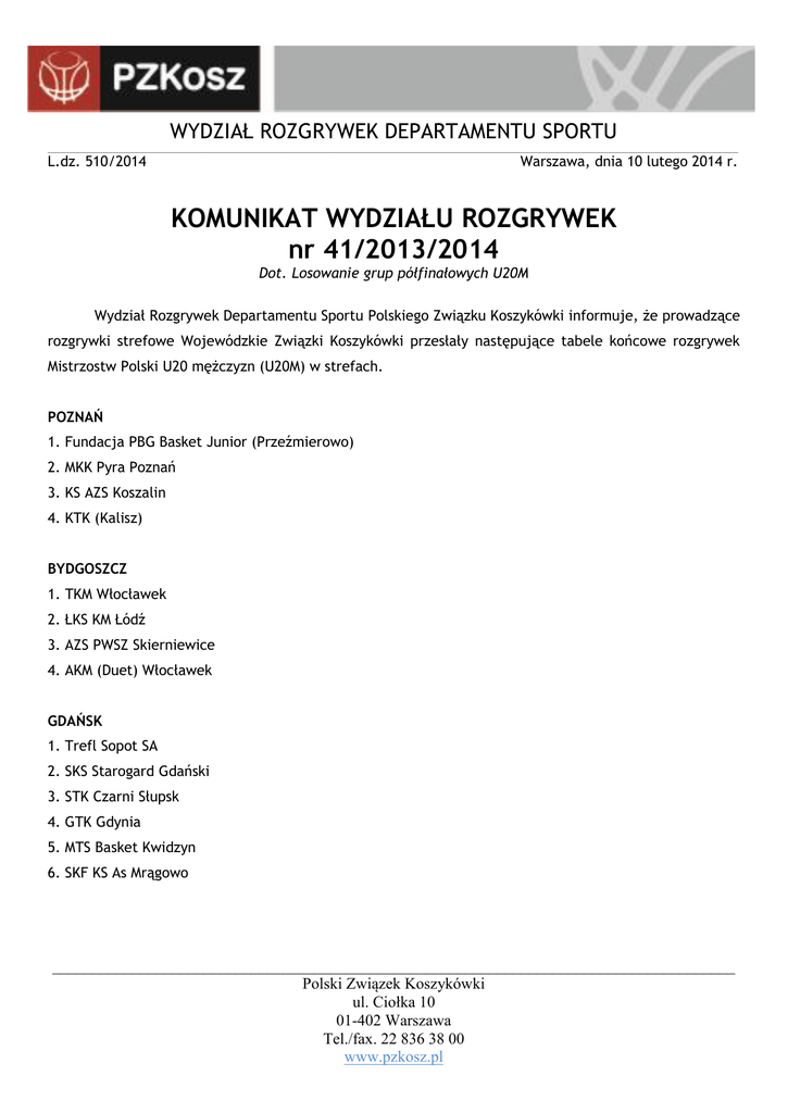 WYDZIAŁ ROZGRYWEK DEPARTAMENTU SPORTU ______________________________________________________________________________________________________________________________________________________________________________ L.dz. 510/2014 Warszawa, dnia 10 lutego 2014 r. KOMUNIKAT WYDZIAŁU ROZGRYWEK nr 41/2013/2014 Dot. Losowanie grup półfinałowych U20M Wydział Rozgrywek Departamentu Sportu Polskiego Związku Koszykówki informuje, że prowadzące rozgrywki strefowe Wojewódzkie Związki Koszykówki przesłały następujące tabele końcowe rozgrywek Mistrzostw Polski U20 mężczyzn (U20M) w strefach. POZNAŃ 1. Fundacja PBG Basket Junior (Przeźmierowo) 2. MKK Pyra Poznań 3. KS AZS Koszalin 4. KTK (Kalisz) BYDGOSZCZ 1. TKM Włocławek 2. ŁKS KM Łódź 3. AZS PWSZ Skierniewice 4. AKM (Duet) Włocławek GDAŃSK 1. Trefl Sopot SA 2. SKS Starogard Gdański 3. STK Czarni Słupsk 4. GTK Gdynia 5. MTS Basket Kwidzyn 6. SKF KS As Mrągowo ______________________________________________________________________________________ Polski Związek Koszykówki ul. Ciołka 10 01-402 Warszawa Tel./fax. 22 836 38 00 www.pzkosz.pl WYDZIAŁ ROZGRYWEK DEPARTAMENTU SPORTU ______________________________________________________________________________________________________________________________________________________________________________ WARSZAWA 1. KS Rosa-Sport Radom 2. MKS Polonia Warszawa 3. UKS Komorów 4. MKS Ochota Warszawa RZESZÓW 1. MKS Start Lublin 2. ZKS Stal Stalowa Wola 3. CSM Kuźnia Koszykówki Stalowa Wola 4. BSK Kadet Biała Podlaska KRAKÓW 1. TS Wisła Kraków 2. AZS AGH Alstom Kraków 3. MKS Skawa Wadowice 4. KS ZKS Unia MUKS 1811 Tarnów 5. KS Niwa Oświęcim KATOWICE 1. KŚ AZS Katowice 2. KKS Mickiewicz Katowice 3. UKS MOSM Bytom 4. MKS Zabrze 5. SOS Salesia Świętochłowice 6. UKS SP 27 Katowice WROCŁAW 1. SKM Zastal Zielona Góra 2. UKS Gimbasket Wrocław 3. KS Sudety Jelenia Góra ______________________________________________________________________________________ Polski Związek Koszykówki ul. Ciołka 10 01-402 Warszawa Tel./fax. 22 836 38 00 www.pzkosz.pl WYDZIAŁ ROZGRYWEK DEPARTAMENTU SPORTU ______________________________________________________________________________________________________________________________________________________________________________ Biorąc pod uwagę zgłoszenia drużyn, w dniu 10 lutego 2014 roku w siedzibie PZKosz w Warszawie rozlosowane zostały grupy półfinałowe rozgrywek Mistrzostw Polski U20 mężczyzn (U20M). Drogą losowania wyłoniono następujące składy grup półfinałowych Mistrzostw Polski w kategorii U20M: GRUPA I GRUPA II GRUPA III GRUPA IV SKM Zastal Zielona Góra KS Rosa-Sport Radom Trefl Sopot TKM Włocławek KŚ AZS Katowice TS Wisła Kraków PBG Basket Junior Poznań MKS Start Lublin SKS Starogard Gdański MKK Pyra Poznań MKS Polonia Warszawa UKS Gimbasket Wrocław ZKS Stal Stalowa Wola AZS AGH Alstom Kraków ŁKS KM Łódź KKS Mickiewicz Katowice Przypominamy, że zgodnie z Komunikatem WR nr 13/2013/2014, termin zgłoszeń zespołów do organizacji półfinałów U20M upływa w dniu 12 lutego 2014 r. o godz. 12.00. Zgłoszeń należy dokonywać poprzez przesłanie formularza (Załącznik do Regulaminu Cyklu nr 24) na adres [email protected]. Decyzję o przyznaniu organizacji turniejów podejmie Komisja Przyznawania Turniejów Szczebla Centralnego w dniu 12 lutego 2014 r. Więcej informacji o rozgrywkach U-20M w Komunikacie WR nr 13/2013/2014 oraz w Regulaminie Cyklu Rozgrywek Młodzieżowe Mistrzostwa Polski na sezon 2013/2014. Otrzymują: Wojewódzkie Związki Koszykówki Zainteresowane kluby Przewodniczący Komisji Rozgrywek PZKosz ______________________________________________________________________________________ Polski Związek Koszykówki ul. Ciołka 10 01-402 Warszawa Tel./fax. 22 836 38 00 www.pzkosz.pl