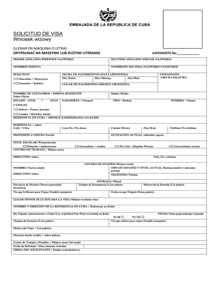 EMBAJADA DE LA REPUBLICA DE CUBA SOLICITUD DE VISA Wniosek wizowy (LLENAR EN MÁQUINA O LETRA) (WYPEŁNIAĆ NA MASZYNIE LUB DUŻYMI LITERAMI) EXPEDIENTE No.____________ PRIMER APELLIDO/PIERWSZE NAZWISKO SECUNDO APELLIDO/DRUGIE NAZWISKO NOMBRES/IMIONA NOMBREDE SOLTERA/NAZWISKO PANIEŃSKIE SEXO/PŁEĆ 1 Masculino / Mężczyzna FECHA DE NACIMIENNTO/DATA URODZENIA Dia/Dzień Mes/Miesiąc Año/Rok 2 Femenino / Kobieta LUGAR DE NACIMENDO/MIEJSCE URODZENIA NOMBRE DE LOS PADROS / IMIONA RODZICÓW Padre/Ojciec ESTADO CIVIL / STAN CIUDADANÍA /OBYWATELSTWO Madre/Matka PASAPORTE / Paszport TIPO / Rodzaj NÚMERO / Numer CYWILNY 1 Soltero / Panna, kawaler 2 Casado / Mężatka, żonaty RESIDENCIA EN CUBA / MIEJSCE ZAMIESZKANIA NA KUBIE RESIDENCIA / Adres Calle / Ulica Casa No./Nr.domu PROFESIÓN U OFICIO/Zawód Ciudad/Miasto País/Kraj Teléfono/Nr.telefonu OCUPACIÓN ACTUAL/Aktualne zajęcie NIVEL ESCOLAR/Wykształcenie 1 Primario / podstawowe CENTRO DE TRABAJO / Miejsce pracy 2 Secundario / średnie 3 Pre Univ. Niepełne Wyższe DIRECTIÓN/Adres Telf./Nr. telefonu CENTRO DE STUDIOS/Miejsce nauki TIPO DE ESTUDIO Y NIVEL ACTUAL/Rodzaj studiów i aktualny poziom NOMBRE/Nazwa szkoły DIRECTIÓN/Adres Provincia de Destino/Nazwa prowincji docelowej 4 Universitario wyższe TELÉFONO/Telefon ENTRADA/Wjazd Tiempo de Pernamecia/Czas pobytu Via que Utilizará para Viajar/Środek transportu Motivo de la Entrada/Cel pobytu Fecha en que Viajará/Data podróży LUGAR DONDE SE LE SITUARÁ LA VISA/Miejsce wydania wizy NOMBRE Y DIRECIÓN DE LA REFERENCIA EN CUBA / Referencje na Kubie Ha Viajado anteriormente a Cuba/Czy wyjeżdzał Pan/Pani wcześniej na Kubę FECHA/Data poprzedniego wyjazdu Si tak Tiempo de Estancia/Czas pobytu Motivo del Viaje / Cel podróży Direción donde residió / Adres pobytu Centro de Trabajo o Estudios / Miejsce pracy lub nauki Fecha de Solicitud / Data złożenia wniosku FIRMA DEL SOLICITANTE / Podpis wnioskodawcy No Nie Via que utilizó para víajar/Środek transportu