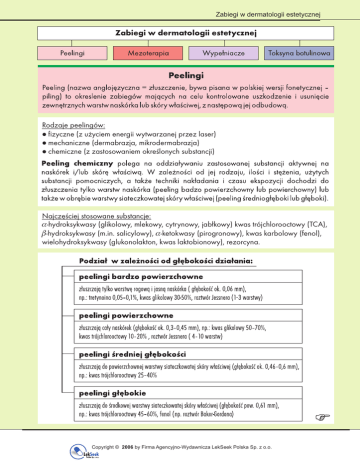 Zabiegi w dermatologii estetycznej Zabiegi w dermatologii estetycznej Rodzaje peelingów: l fizyczne (z użyciem energii wytwarzanej przez laser) l mechaniczne (dermabrazja, mikrodermabrazja) l chemiczne (z zastosowaniem określonych substancji) Najczęściej stosowane substancje: a-hydroksykwasy (glikolowy, mlekowy, cytrynowy, jabłkowy) kwas trójchlorooctowy (TCA), b-hydroksykwasy (m.in. salicylowy), a-ketokwasy (pirogronowy), kwas karbolowy (fenol), wielohydroksykwasy (glukonolakton, kwas laktobionowy), rezorcyna. Copyright © 2006 by Firma Agencyjno-Wydawnicza LekSeek Polska Sp. z o.o. Zabiegi w dermatologii estetycznej Zastosowanie: Metoda polegająca na wprowadzaniu środka farmaceutycznego do wybranych obszarów, poprzez wielokrotne iniekcje śród- i podskórne. Najczęstszej stosowane preparaty i ich zastosowanie: l kolagen – substancja wypełniająca, zastosowanie: korekcja owalu twarzy, kształtu ust, itp.; l embrioblasty – wyciągi komórek zarodkowych przyśpieszające procesy regeneracji, zastosowanie: terapia odmładzająca, rewitalizującej; l toksyna botulinowa – substancja blokująca połączenia nerwowo-mięśniowe, zastosowanie: leczenie nadpotliwości, redukowanie zmarszczek i bruzd; l witaminy – głównie witamina C pobudzająca syntezę kolagenu, zastosowanie: zapobieganie procesom starzenia; l mikroelementy, np. cynk, krzem – wzmacnianie struktury włosów i paznokci, zastosowanie: łysienie rozlane; l kwas hialuronowy – substancja wypełniająca, zastosowanie redukcja zmarszczek, poprawa jędrności i wyglądu skóry; l kofeina – alkaloid purynowy, zastosowanie: otyłość, cellulit; l dekspantenol (prowitamina B5) – wzmacnianie struktury włosów, zastosowanie: łysienie; l minoksydyl – substancja o działaniu naczyniorozszerzającym, zastosowanie: terapia łysienia androgenowego; l kortykosteroidy – leki o silnym działaniu przeciwzapalnym, zastosowanie: wiele chorób dermatologicznych, w których miejscowe podanie leku z tej grupy pozwala ograniczyć jego działanie ogólnoustrojowe. Przeciwwskazania: l stosowanie aspiryny, NLPZ lub leków przeciwkrzepliwych do 3 dni przed zabiegiem, l infekcja ogólna lub miejscowa, urazy, l ciąża i okres karmienia, miesiączka, l choroby nowotworowe. Powikłania po zabiegu: l występują rzadko – jako niewielkie krwiaki, ustępujące samoistnie po kilku dniach. Copyright © 2006 by Firma Agencyjno-Wydawnicza LekSeek Polska Sp. z o.o. Zabiegi w dermatologii estetycznej Wypełniacze (filery, implanty) Materiały o właściwościach elastycznych wprowadzane za pomocą iniekcji do skóry i tkanki podskórnej jako substancje wypełniające (ang. soft tissue fillers) . Implanty biologiczne autogeniczne (pochodzące z tkanek pacjenta) allogeniczne (pochodzące od innych osób) ksenogeniczne (pochodzące od innych gatunków) Implanty syntetyczne (alloplastyczne) polimery i substancje kolageno-podobne pochodne kwasu hialuronowego inne Zastosowanie: Przeciwwskazania i powikłania po zabiegu Þ Mezoterapia Copyright © 2006 by Firma Agencyjno-Wydawnicza LekSeek Polska Sp. z o.o. Zabiegi w dermatologii estetycznej Neurotoksyna wytwarzana przez Clostridium botulinum typu A, blokująca połączenia nerwowo-mięśniowe poprzez hamowanie uwalniania acetylocholiny. W efekcie jej działania dochodzi do odnerwienia mięśni z następowym porażeniem ich skurczu. ze wskazania lekarskich: ; w medycynie estetycznej – redukcja zmarszczek dynamicznych, zwłaszcza górnej połowy twarzy: ; z innych wskazań: Toksynę botulinową wstrzykuje się w bardzo niewielkich ilościach w wybrane miejsca. Celem utrzymania efektu terapeutycznego konieczne jest powtarzanie wstrzyknięć co kilka miesięcy. Copyright © 2006 by Firma Agencyjno-Wydawnicza LekSeek Polska Sp. z o.o.