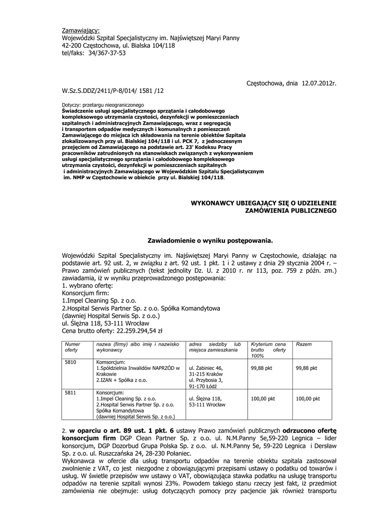 Zamawiający: Wojewódzki Szpital Specjalistyczny im. Najświętszej Maryi Panny 42-200 Częstochowa, ul. Bialska 104/118 tel/faks: 34/367-37-53 Częstochowa, dnia 12.07.2012r. W.Sz.S.DDZ/2411/P-8/014/ 1581 /12 Dotyczy: przetargu nieograniczonego Świadczenie usługi specjalistycznego sprzątania i całodobowego kompleksowego utrzymania czystości, dezynfekcji w pomieszczeniach szpitalnych i administracyjnych Zamawiającego, wraz z segregacją i transportem odpadów medycznych i komunalnych z pomieszczeń Zamawiającego do miejsca ich składowania na terenie obiektów Szpitala zlokalizowanych przy ul. Bialskiej 104/118 i ul. PCK 7, z jednoczesnym przejęciem od Zamawiającego na podstawie art. 23' Kodeksu Pracy pracowników zatrudnionych na stanowiskach związanych z wykonywaniem usługi specjalistycznego sprzątania i całodobowego kompleksowego utrzymania czystości, dezynfekcji w pomieszczeniach szpitalnych i administracyjnych Zamawiającego w Wojewódzkim Szpitalu Specjalistycznym im. NMP w Częstochowie w obiekcie przy ul. Bialskiej 104/118. WYKONAWCY UBIEGAJĄCY SIĘ O UDZIELENIE ZAMÓWIENIA PUBLICZNEGO Zawiadomienie o wyniku postępowania. Wojewódzki Szpital Specjalistyczny im. Najświętszej Maryi Panny w Częstochowie, działając na podstawie art. 92 ust. 2, w związku z art. 92 ust. 1 pkt. 1 i 2 ustawy z dnia 29 stycznia 2004 r. – Prawo zamówień publicznych (tekst jednolity Dz. U. z 2010 r. nr 113, poz. 759 z późn. zm.) zawiadamia, iż w wyniku przeprowadzonego postępowania: 1. wybrano ofertę: Konsorcjum firm: 1.Impel Cleaning Sp. z o.o. 2.Hospital Serwis Partner Sp. z o.o. Spółka Komandytowa (dawniej Hospital Serwis Sp. z o.o.) ul. Ślężna 118, 53-111 Wrocław Cena brutto oferty: 22.259.294,54 zł Numer oferty nazwa (firmy) albo imię i nazwisko wykonawcy 5810 Komsorcjum: 1.Spółdzielnia Inwalidów NAPRZÓD w Krakowie 2.IZAN + Spółka z o.o. 5811 Konsorcjum: 1.Impel Cleaning Sp. z o.o. 2.Hospital Serwis Partner Sp. z o.o. Spółka Komandytowa (dawniej Hospital Serwis Sp. z o.o.) adres siedziby lub miejsca zamieszkania Kryterium cena brutto oferty 100% Razem ul. Żabiniec 46, 31-215 Kraków ul. Przybosia 3, 91-170 Łódź 99,88 pkt 99,88 pkt ul. Ślężna 118, 53-111 Wrocław 100,00 pkt 100,00 pkt 2. w oparciu o art. 89 ust. 1 pkt. 6 ustawy Prawo zamówień publicznych odrzucono ofertę konsorcjum firm DGP Clean Partner Sp. z o.o. ul. N.M.Panny 5e,59-220 Legnica – lider konsorcjum, DGP Dozorbud Grupa Polska Sp. z o.o. ul. N.M.Panny 5e, 59-220 Legnica i Dersław Sp. z o.o. ul. Ruszczańska 24, 28-230 Połaniec. Wykonawca w ofercie dla usług transportu odpadów na terenie obiektu szpitala zastosował zwolnienie z VAT, co jest niezgodne z obowiązującymi przepisami ustawy o podatku od towarów i usług. W świetle przepisów ww ustawy o VAT, obowiązująca stawka podatku na usługę transportu odpadów na terenie szpitali wynosi 23%. Powodem takiego stanu rzeczy jest fakt, iż przedmiot zamówienia nie obejmuje: usług dotyczących pomocy przy pacjencie jak również transportu pacjentów w obiektach zakładu opieki zdrowotnej. Usługi objęte przedmiotem zamówienia nie są objęte zwolnieniem, bo nie mają celu terapeutycznego ani leczniczego, a związane są z ogólnym wsparciem działalności szpitala. Potwierdzają to interpretacje Izby Skarbowej w Łodzi z dnia 19 styczna 2011 r. (IPTPP1/443-897/11-2/MS) i Izby Skarbowej w Poznaniu z 12 października 2011 r. (ILPP1/443-947/11-6/MS). Jednocześnie z uwagi na zaistnienie okoliczności opisanej w art. 93 ust. 1 pkt. 4 ustawy Prawo zamówień publicznych (Dz. U. Nr 113 z 2010 r., poz. 759 z późn. zm.) Zamawiający unieważnia przedmiotowe postępowanie. Uzasadnienie faktyczne unieważnienia: Zamawiający podjął decyzję o unieważnieniu przedmiotowego postępowania z uwagi na zaistnienie przesłanek zawartych w przepisie art. 93 ust.1 pkt 4 ustawy PZP tj. cena najkorzystniejszej oferty przekroczyła kwotę, którą Szpital zamierza przeznaczyć na sfinansowanie przedmiotu zamówienia i jednocześnie Zamawiający nie posiada środków finansowych umożliwiających zwiększenie tej kwoty do ceny najkorzystniejszej oferty tj. oferty konsorcjum firm Impel Cleaning Sp. z o.o.,Hospital Serwis Partner Sp. z o.o. Spółka Komandytowa (dawniej Hospital Serwis Sp. z o.o.). Wykładnia przywołanego przepisu opierająca się na jego literalnym brzmieniu wskazuje jednoznacznie, że ma on charakter imperatywny i nie pozostawiający swobody wyboru decyzji, w przypadku spełnienia się warunków określonych tym przepisem. Brak wystarczających środków finansowych na zapłatę wynagrodzenia określonego najkorzystniejszą ofertą obliguje Zamawiającego do unieważnienia postępowania. (tak: wyrok KIO/UZP 873/08). Zamawiający W.Sz.S. w Częstochowie znalazł się w sytuacji uniemożliwiającej wydanie innego rozstrzygnięcia. Kwota, którą przeznaczył na sfinansowanie przedmiotu zamówienia tj. 13.248.700,93 złotych stanowi maksymalny pułap możliwości finansowych jednostki wynikający z przyjętego na rok 2012 planu finansowego. Plan ten został opracowany i przyjęty z generalnym założeniem obniżenia kosztów działalności jednostki uwzględniając jej dalszy rozwój poprzez świadczenie nowych usług medycznych, o których kontraktowanie Szpital zabiega. Nadwyżka wzrostu przychodów nad kosztami kształtuje się na poziomie 9,77% co znacznie poprawi wynik finansowy Szpitala zmniejszając stratę z 33.163.802 zł za rok 2011 do poziomu planowanej straty w kwocie 15.981.000 zł na 2012r. Zwiększenie przychodów w roku 2012 pomimo poniesionych wyższych kosztów poprawi rentowność Szpitala. W planie finansowym z dnia 19 grudnia 2011r. Wojewódzkiego Szpitala Specjalistycznego im. NMP w Częstochowie na rok 2012 w pozycji usługi obce założono m.in. koszty pod nazwą „pozostałe usługi”, których wartość zaplanowano w kwocie łącznej 16.600.000 zł. W pozycji tej ujęto także kwotę, jaką Zamaw